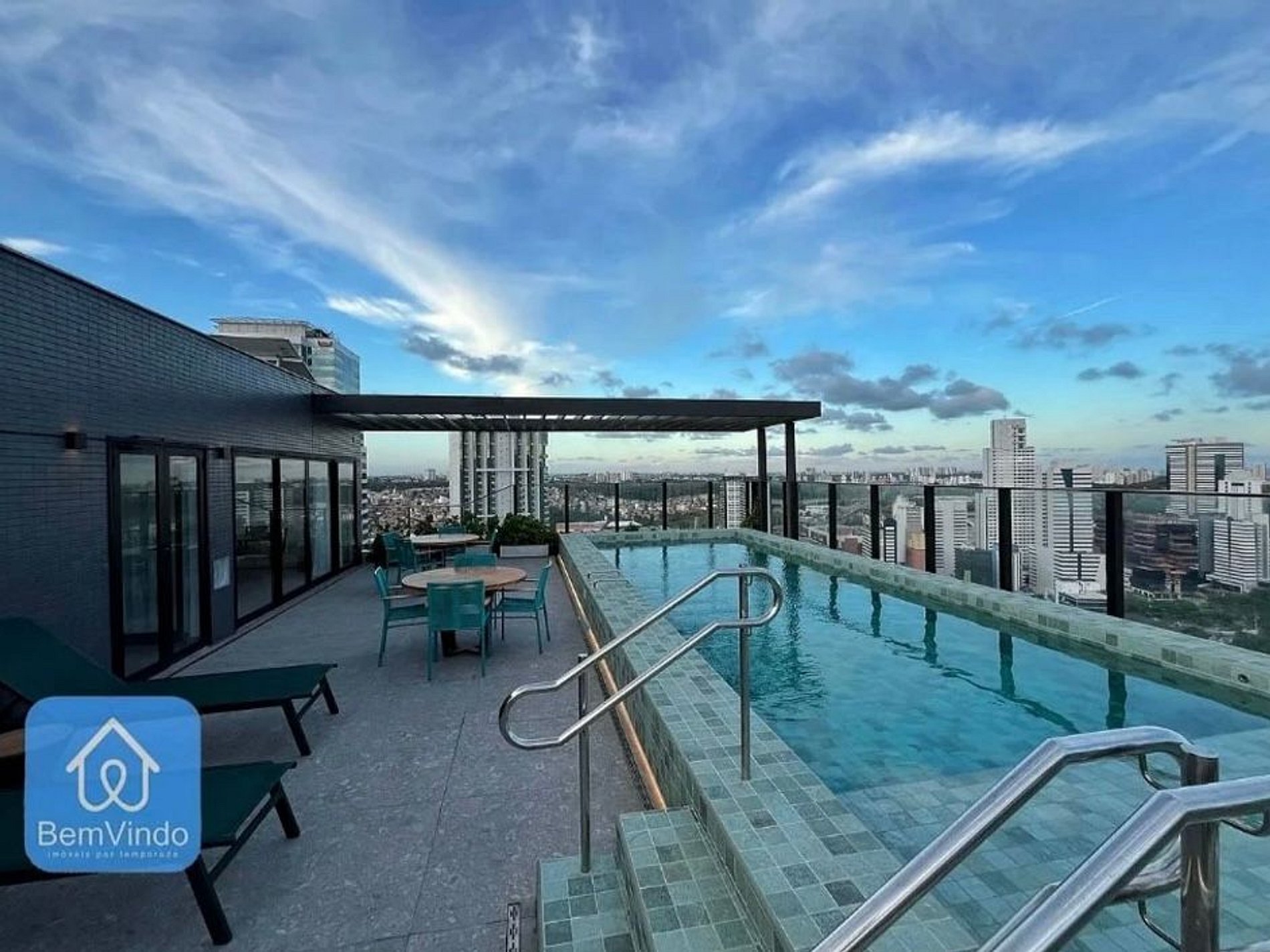 Piscina com espreguiçadeiras, ideal para momentos de lazer.