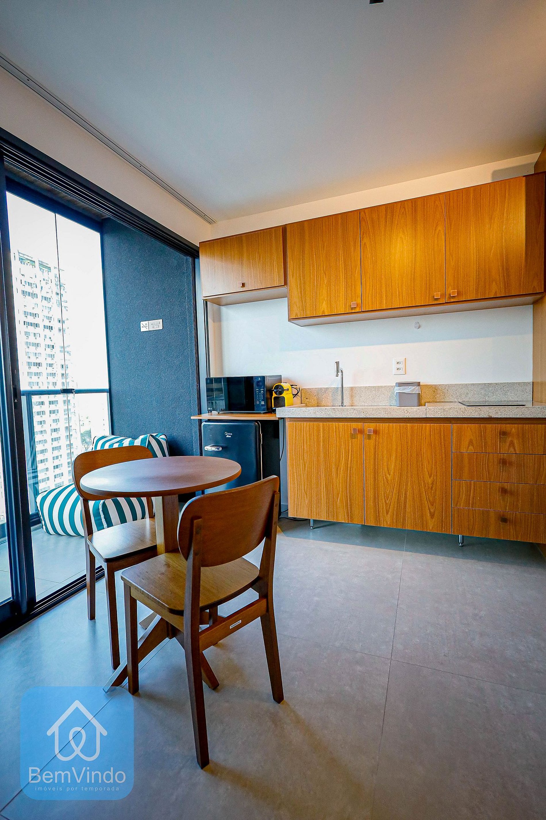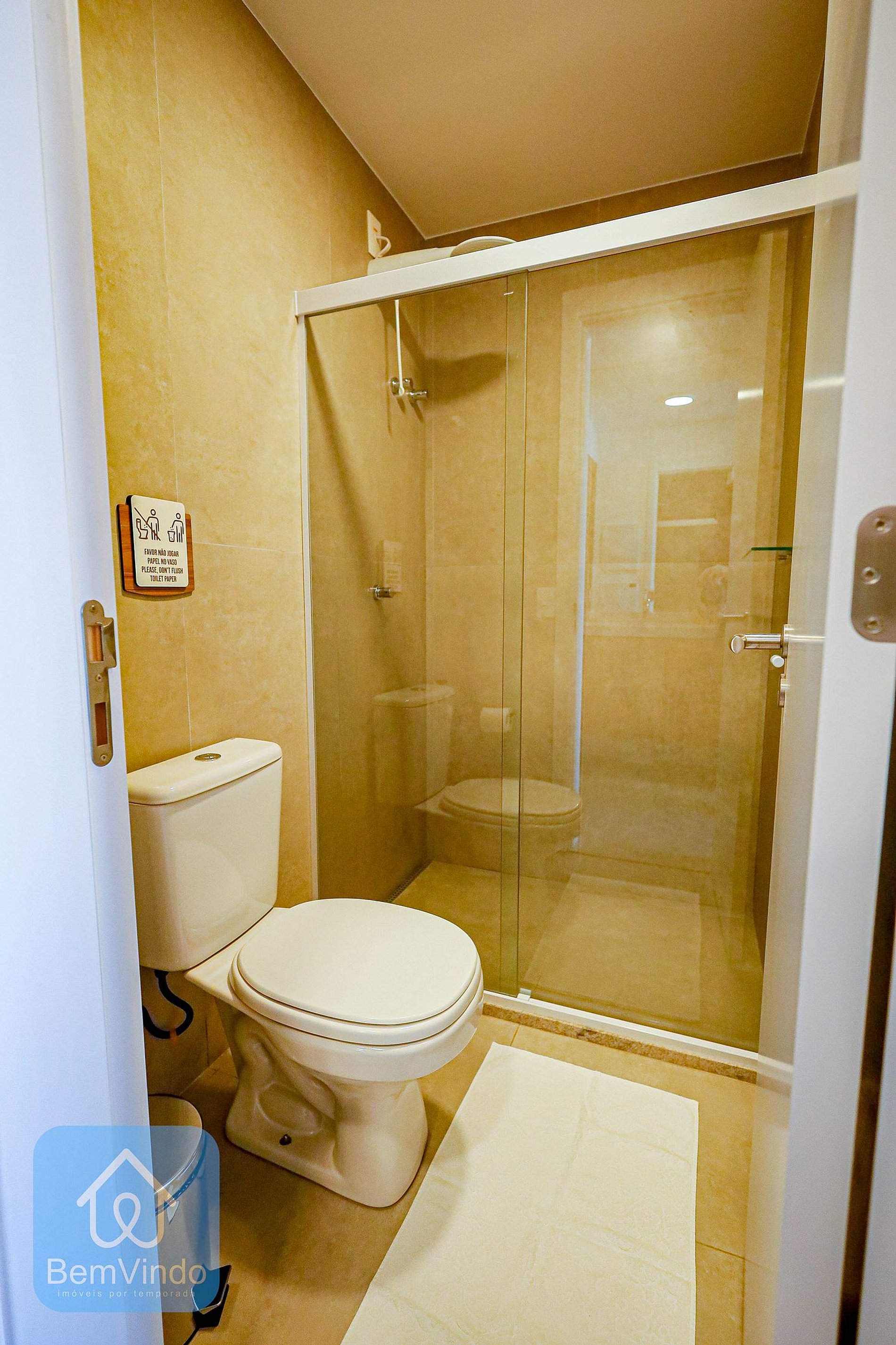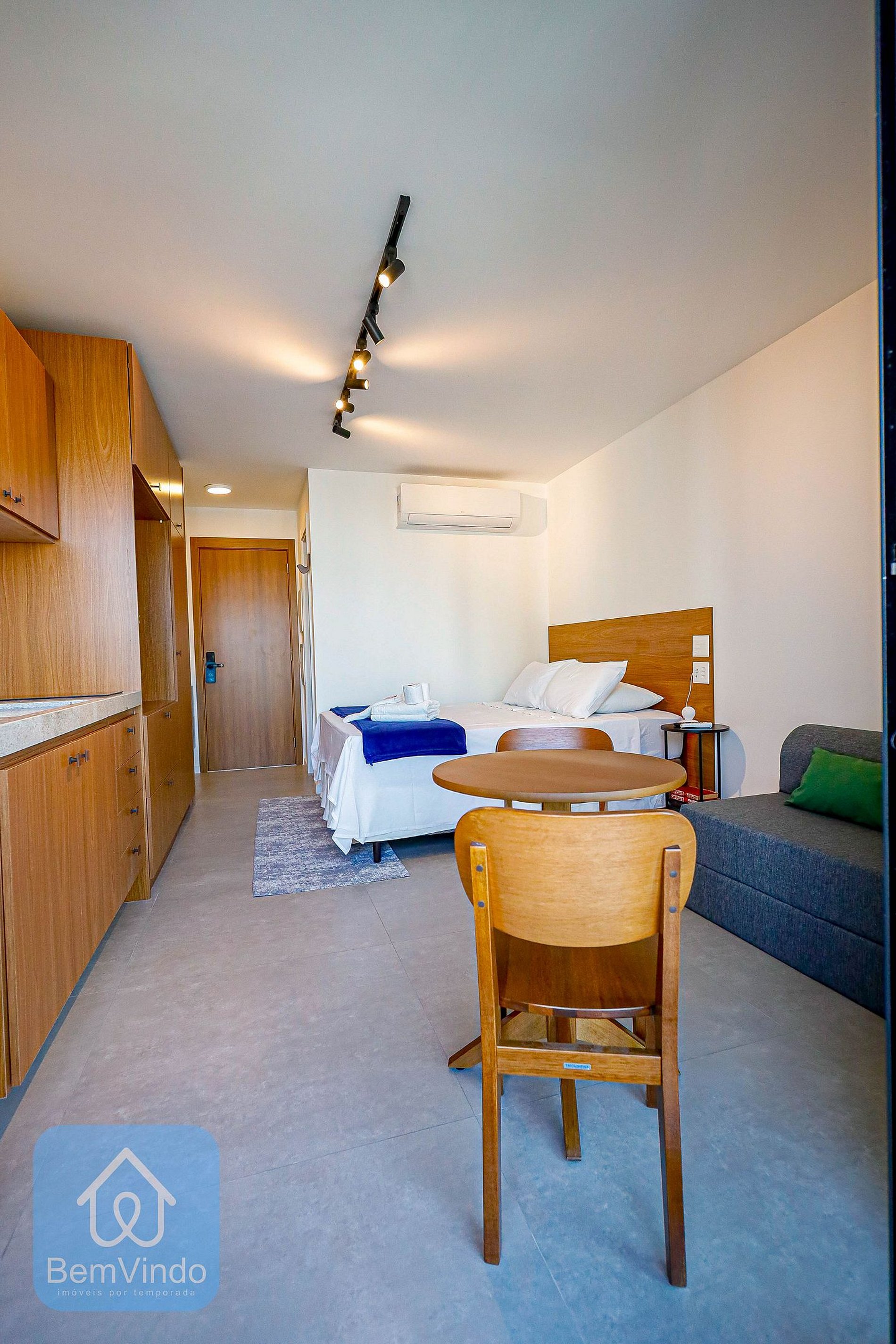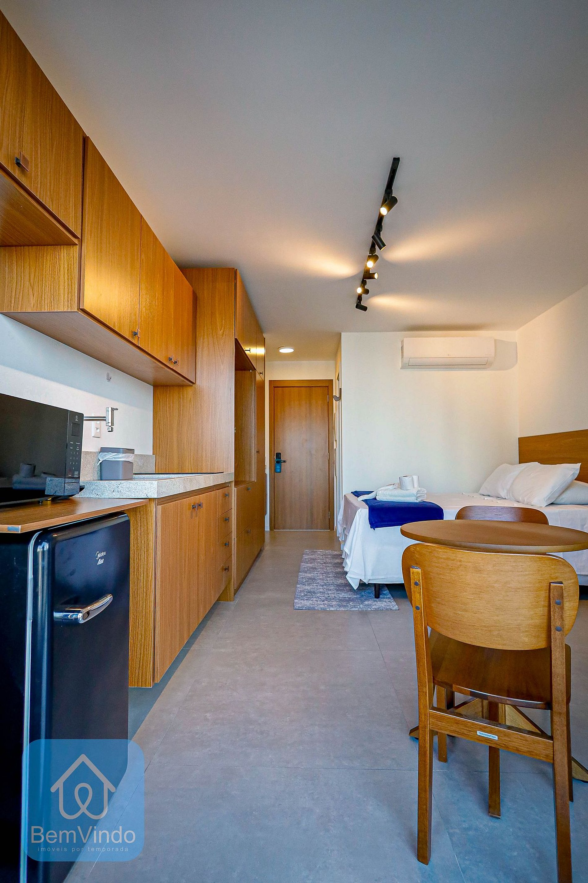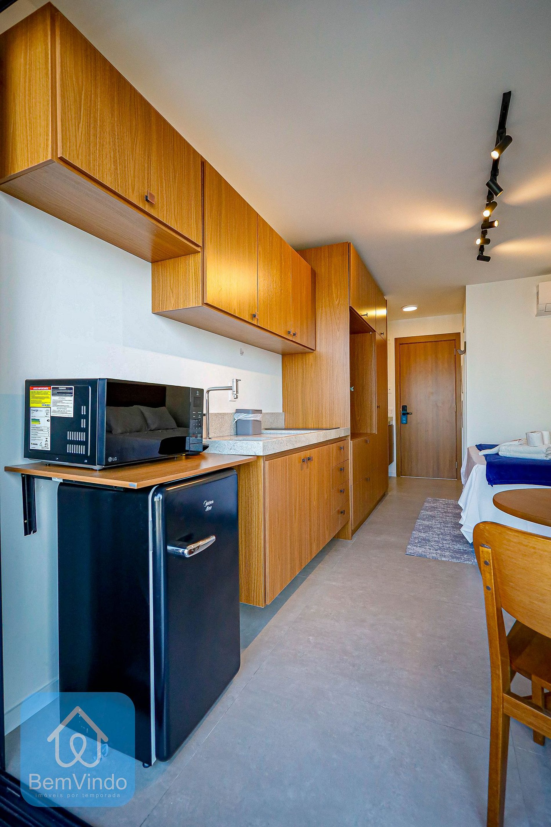 A cozinha completa possui todos os utensílios e eletrodomésticos necessários para preparar refeições deliciosas, incluindo fogão cooktop, micro-ondas e frigobar. O banheiro é amplo e confortável, garantindo ainda mais comodidade durante a estadia.
