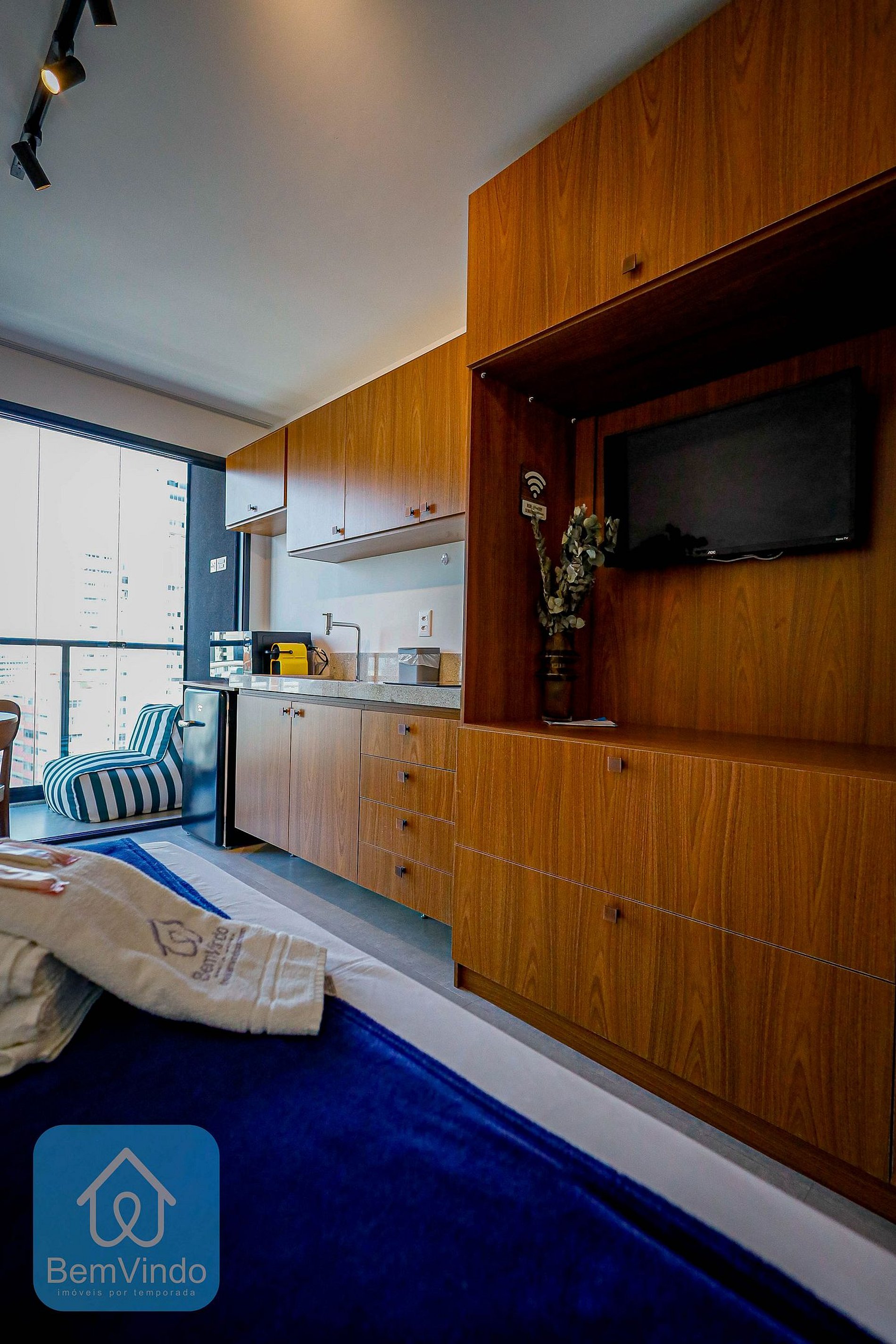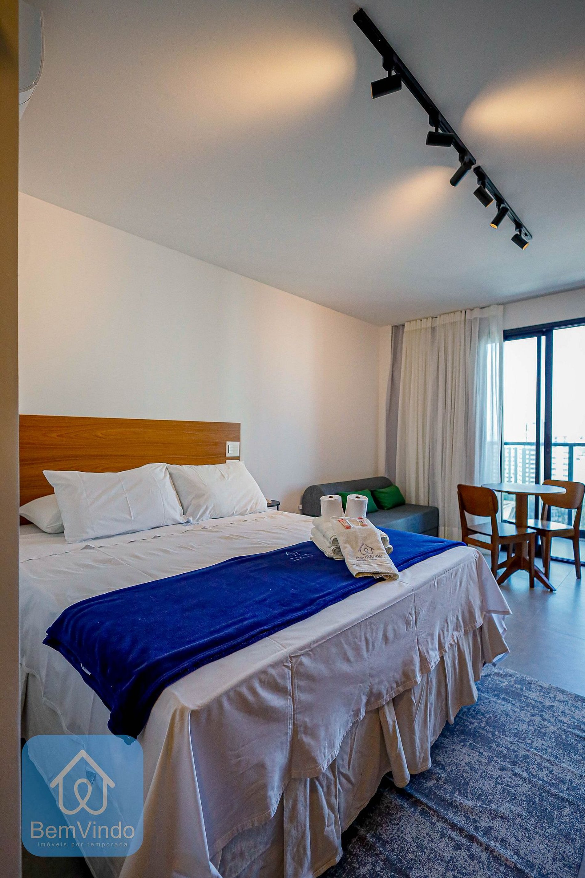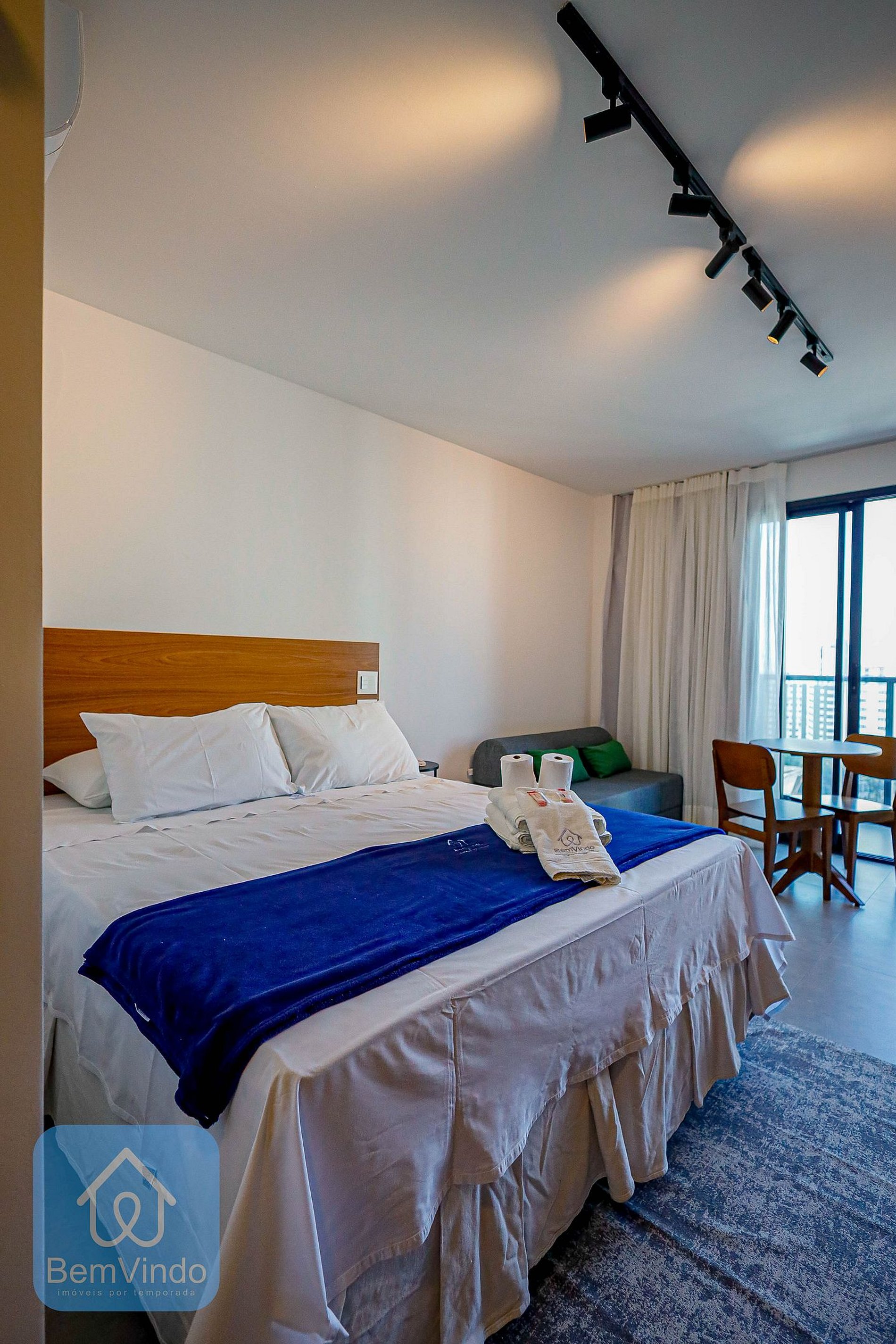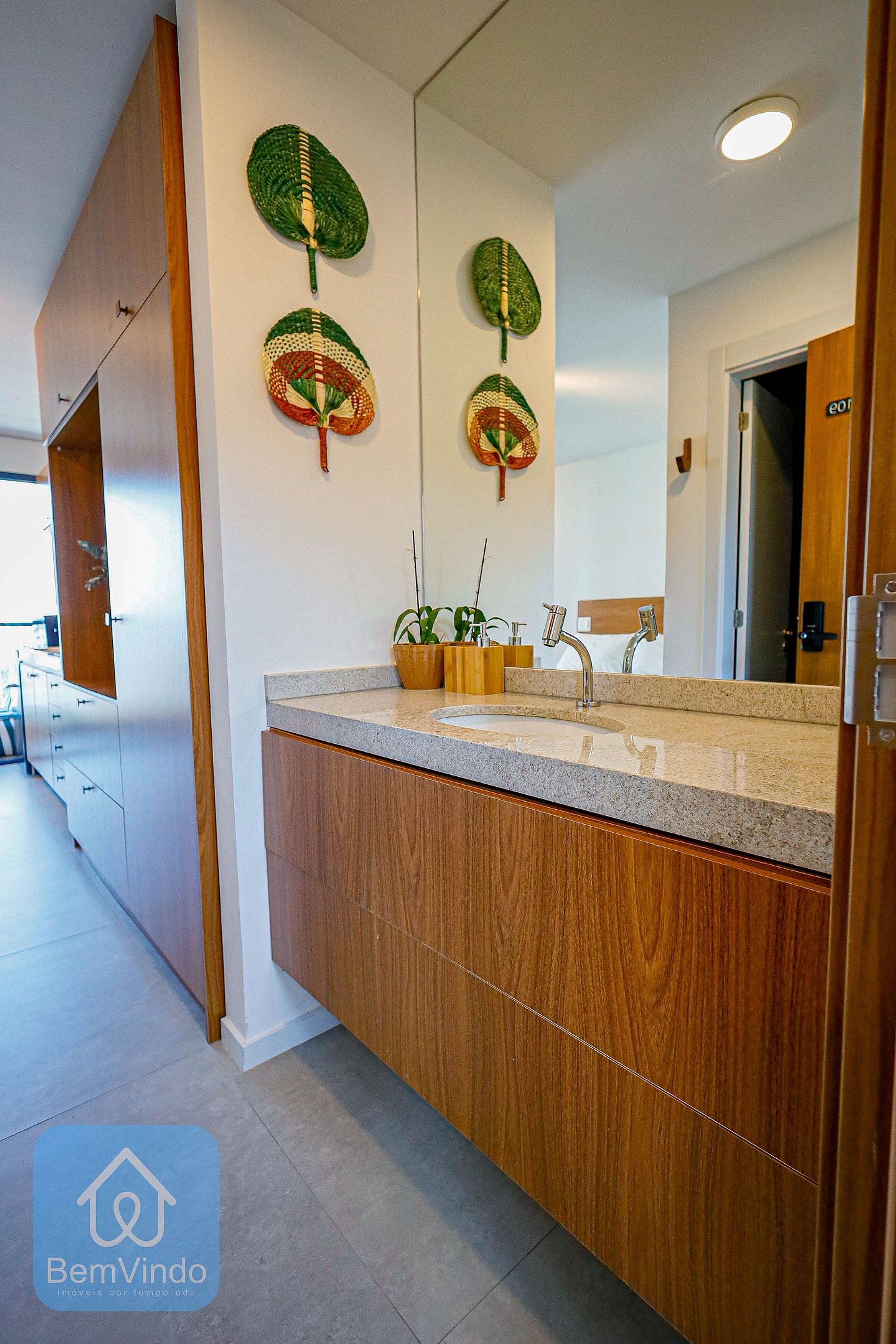 A cozinha completa possui todos os utensílios e eletrodomésticos necessários para preparar refeições deliciosas, incluindo fogão cooktop, micro-ondas e frigobar. O banheiro é amplo e confortável, garantindo ainda mais comodidade durante a estadia.