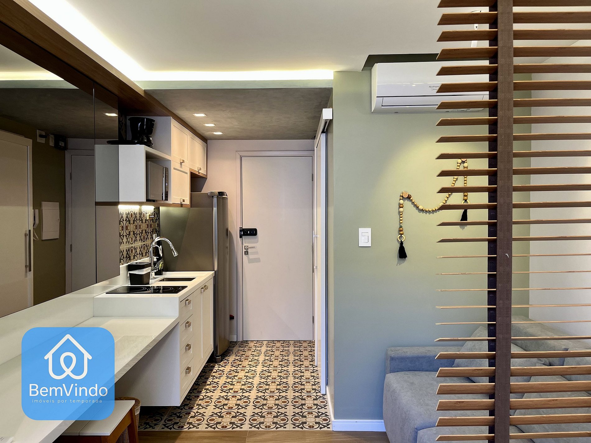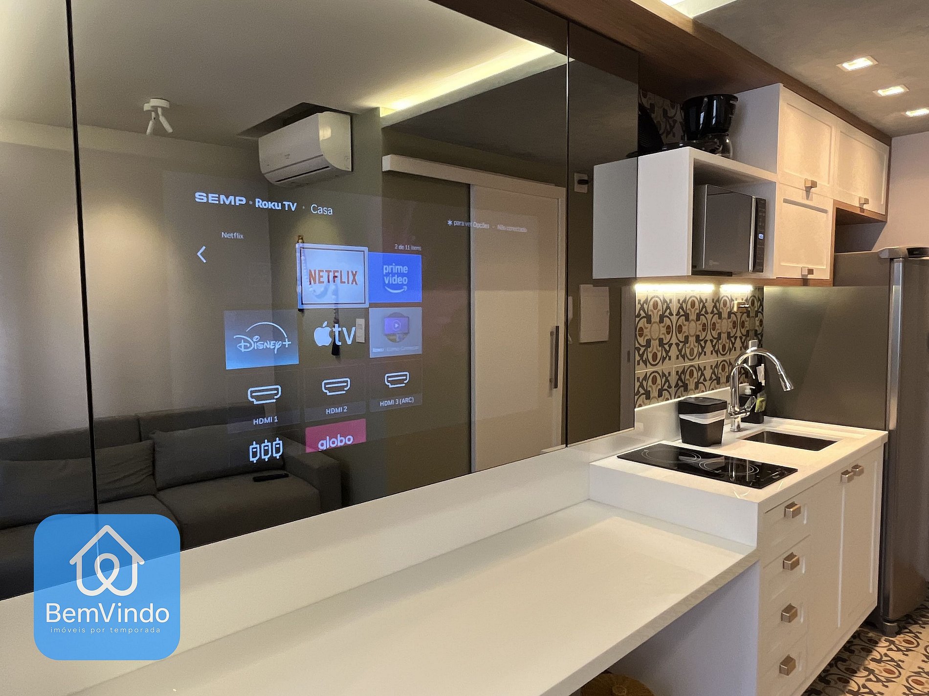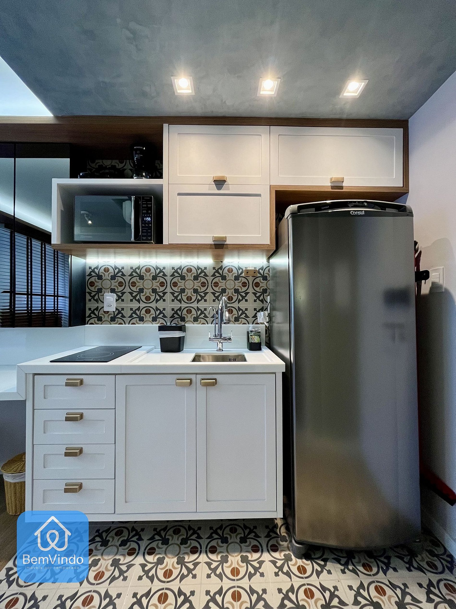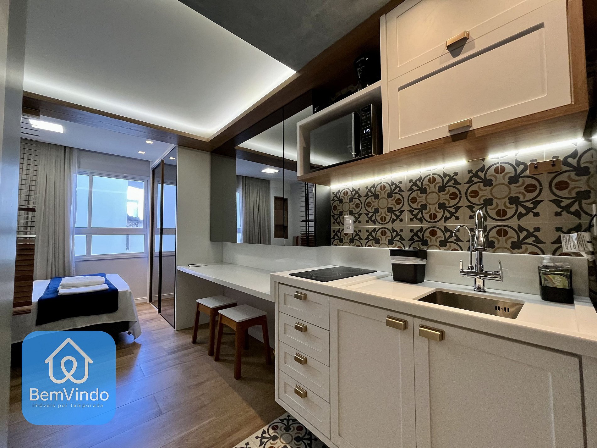 Cozinha Completa: Equipada com fogão cooktop, micro-ondas, geladeira e todos os utensílios necessários, a cozinha permite que você prepare desde refeições rápidas até um jantar completo.