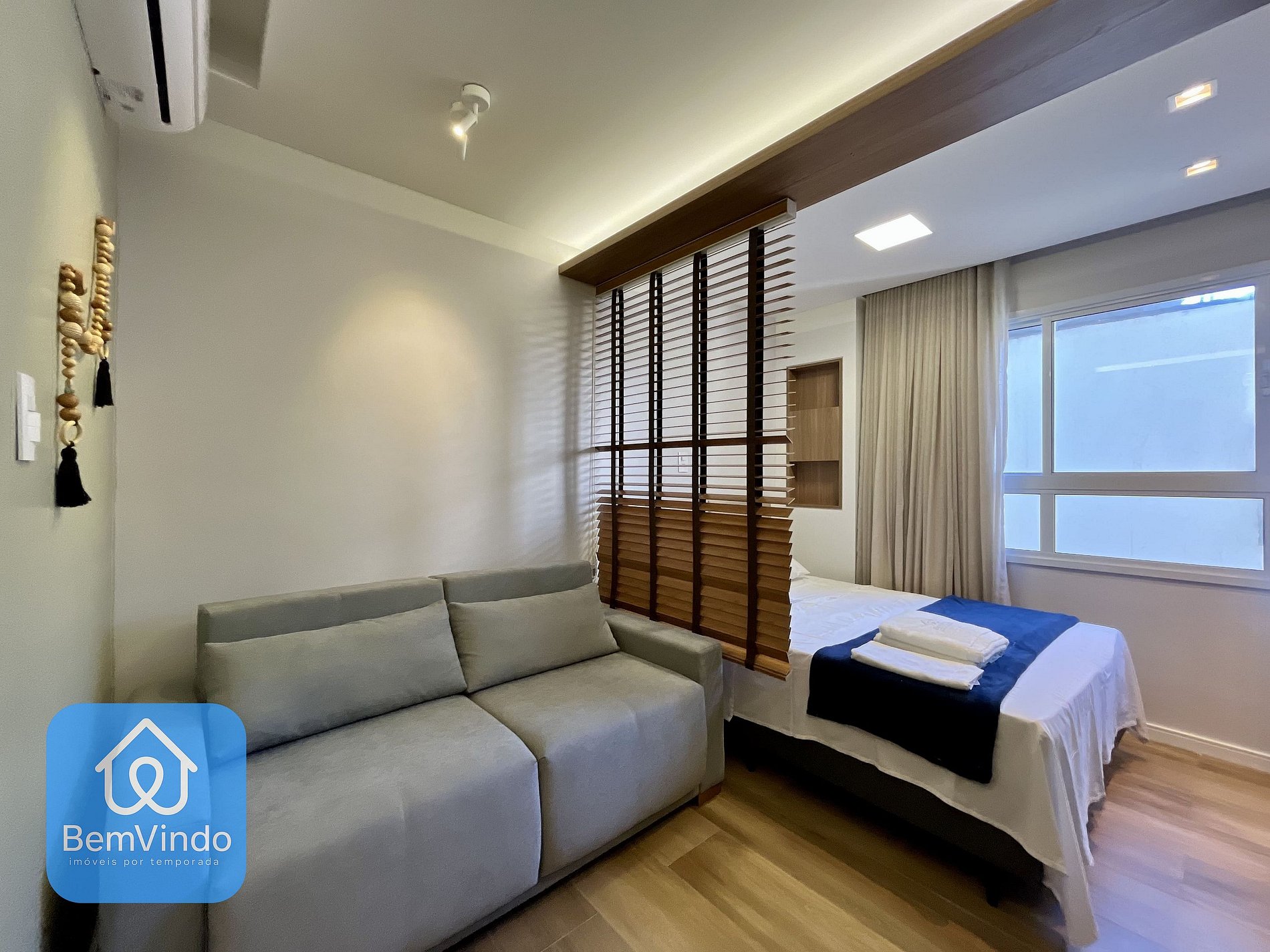 Quarto: Conforto e privacidade em um ambiente climatizado com cama de casal nova, guarda-roupas espaçosos e espelhados, Smart Tv e cortina blackout para garantir noites tranquilas de sono.