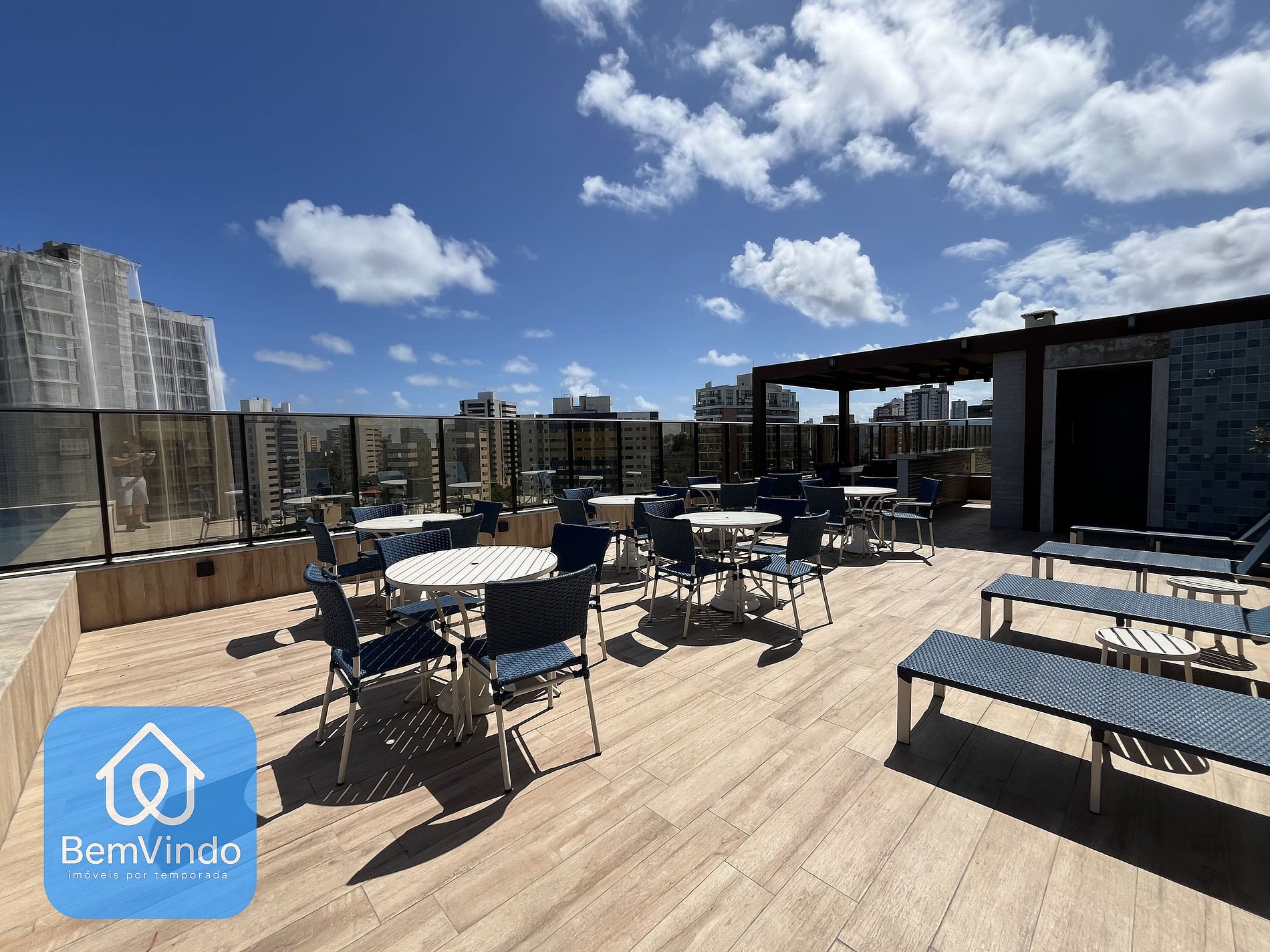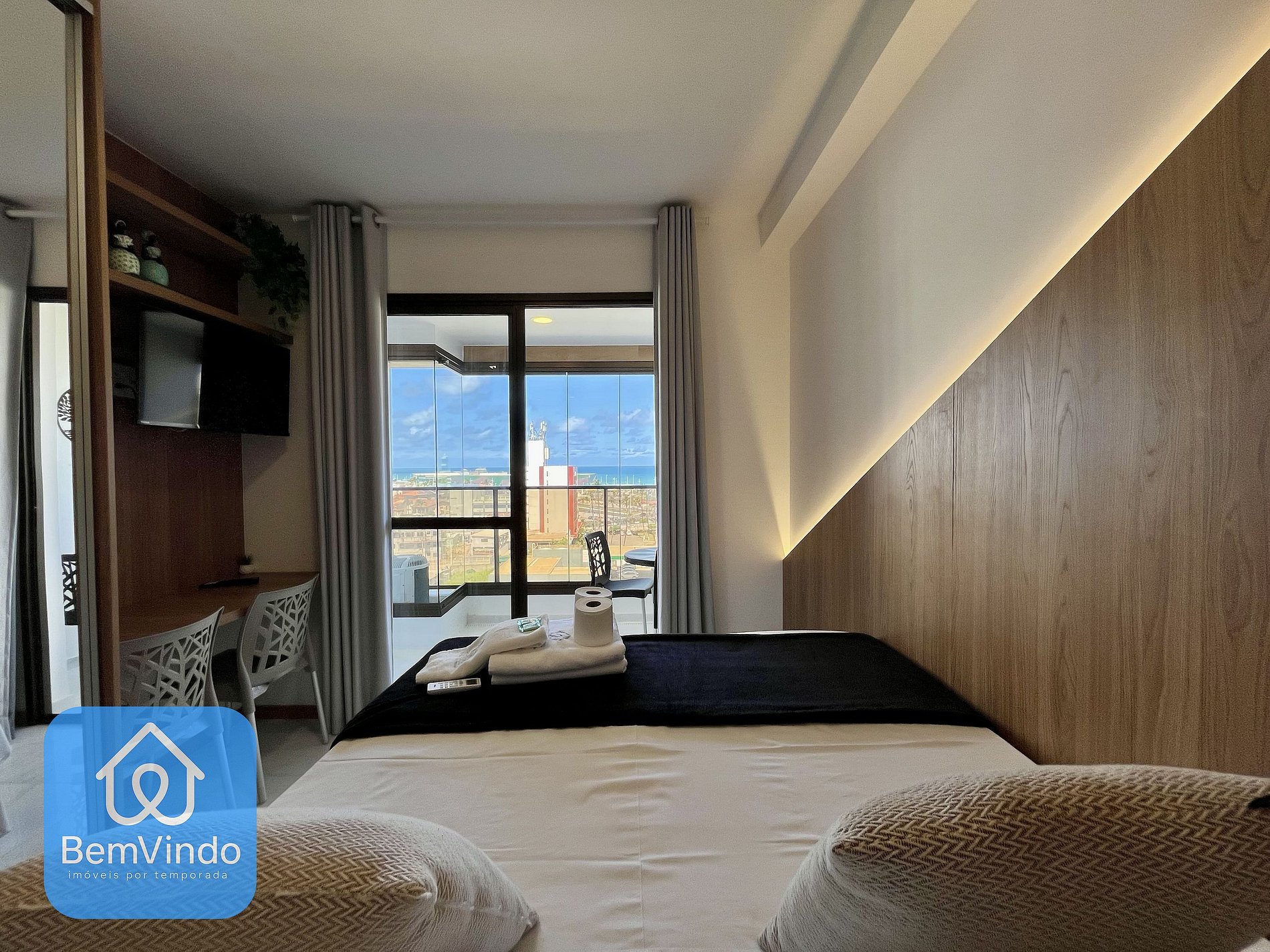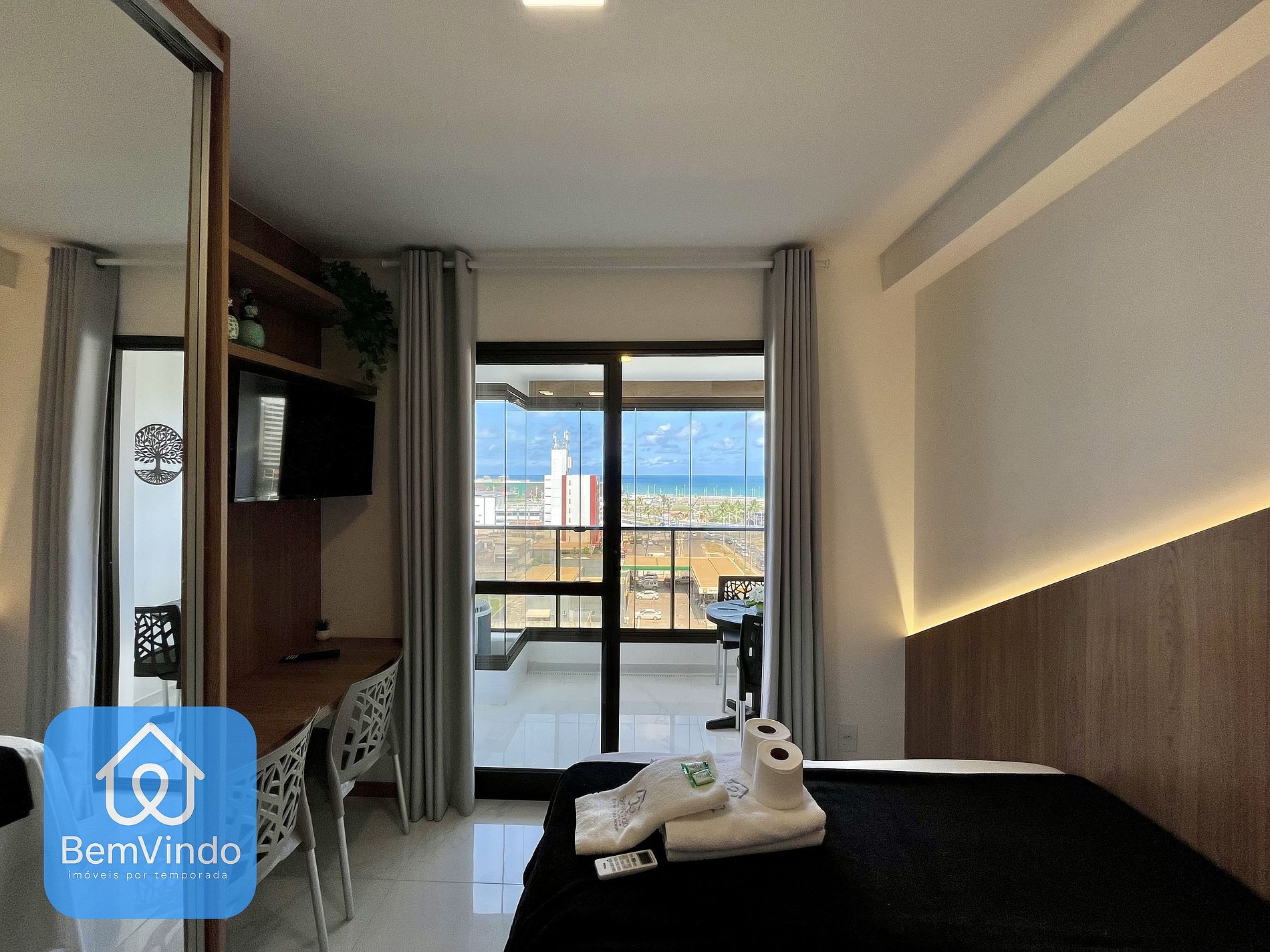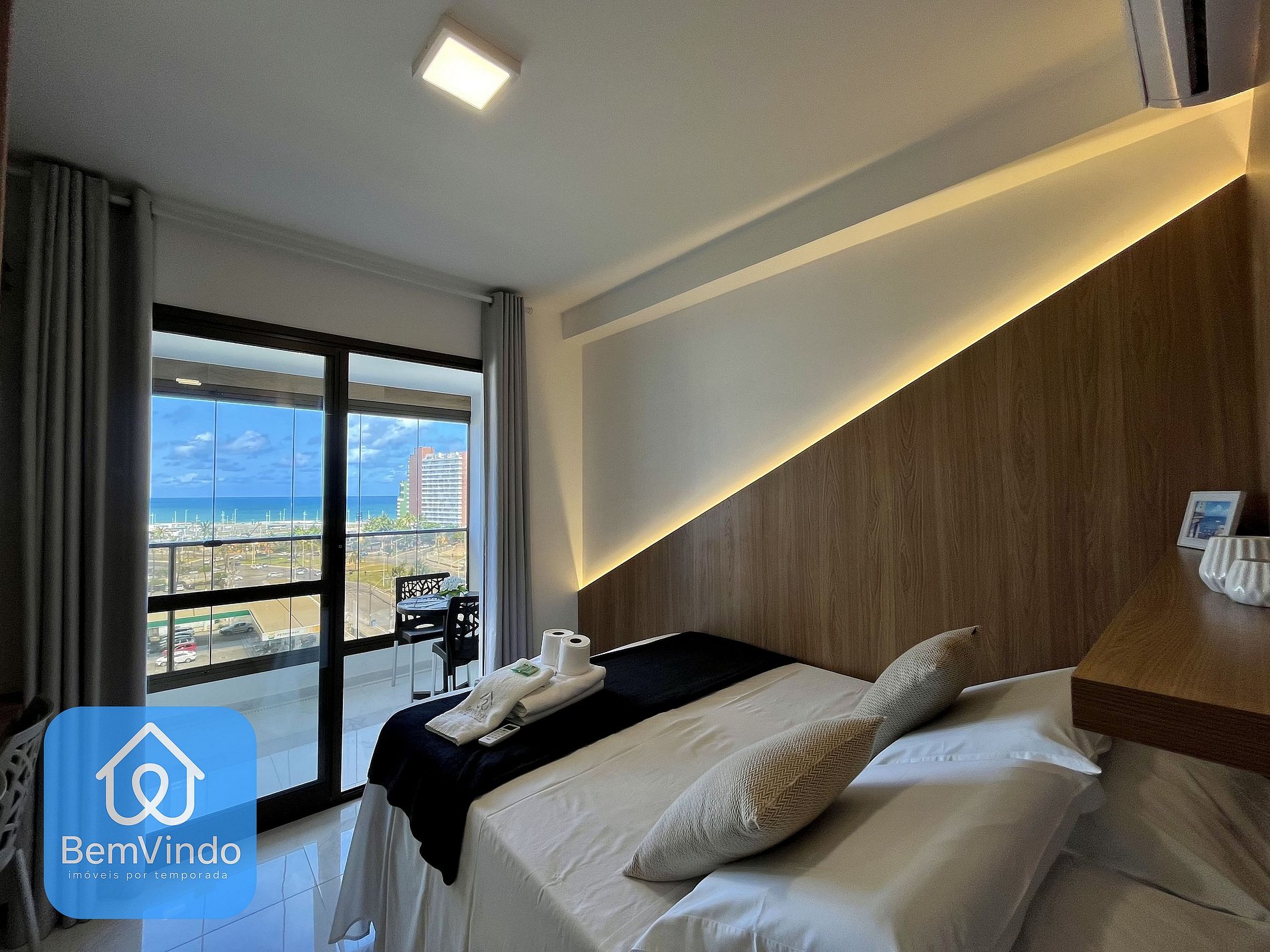 Possui também uma vista para rua e para a praia, possuindo também mesas e cadeiras. A cozinha, prática e completa, está equipada com cooktop elétrico, micro-ondas, geladeira e todos os utensílios necessários para preparar suas refeições com conforto e praticidade. O prédio conta com lavanderia, ideal para estadias curtas ou longas; piscina com deck, perfeita para relaxar após um dia de passeio; academia moderna e bem equipada para manter sua rotina de exercícios em dia; além de uma sala de estar aconchegante e climatizada, ideal para momentos de descanso, leitura ou até uma reunião informal. Tudo isso em um ambiente seguro, com portaria 24h, elevadores e um design contemporâneo que une elegância e funcionalidade no coração da orla de Salvador. Não trabalhamos como serviço de hotel, troca de toalhas e de roupa de cama não está incluída, sendo uma toalha por hóspede.