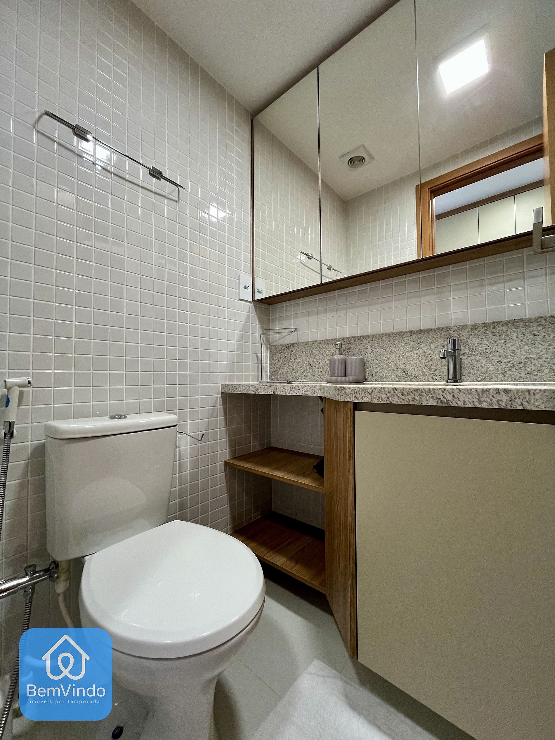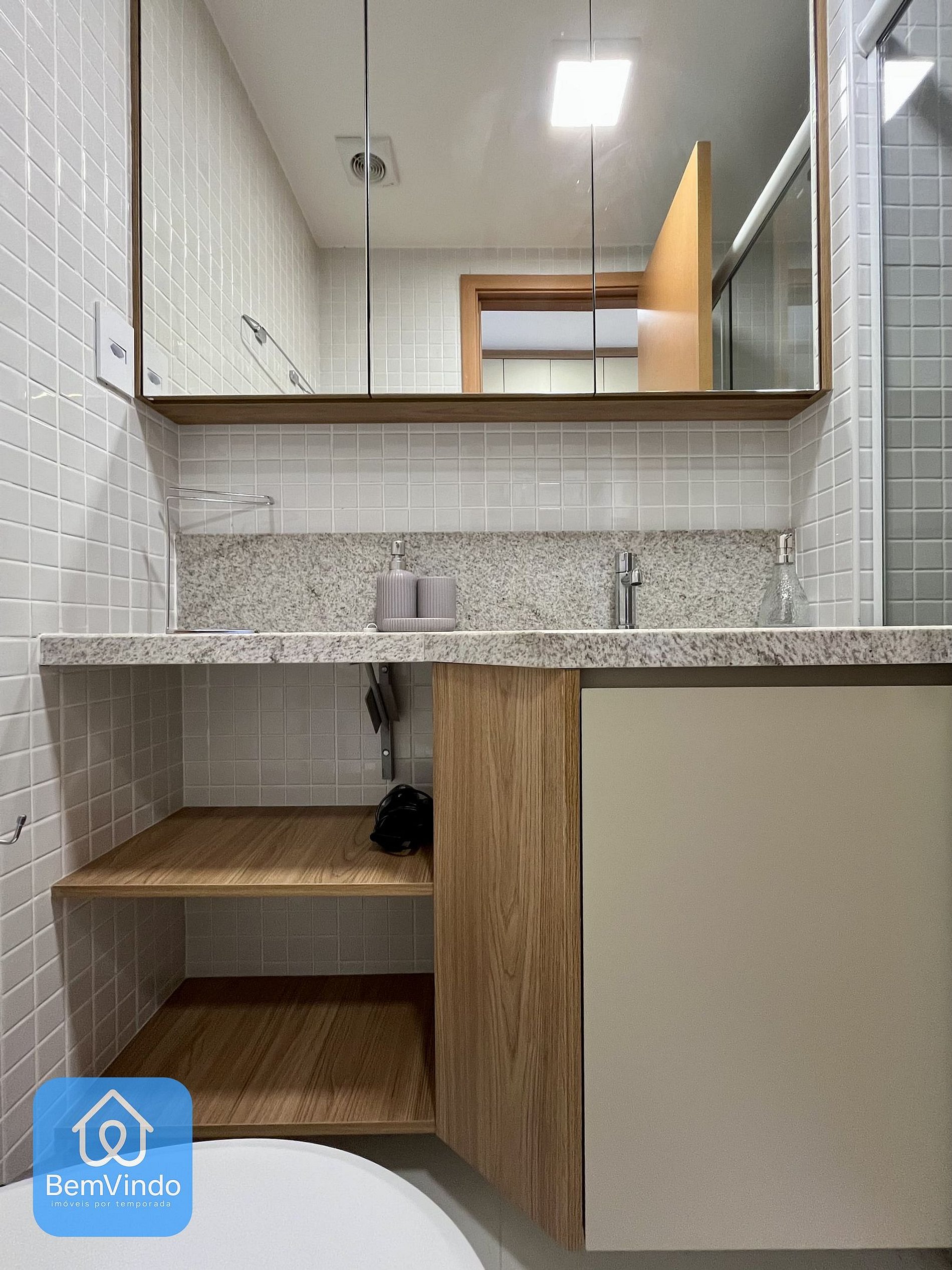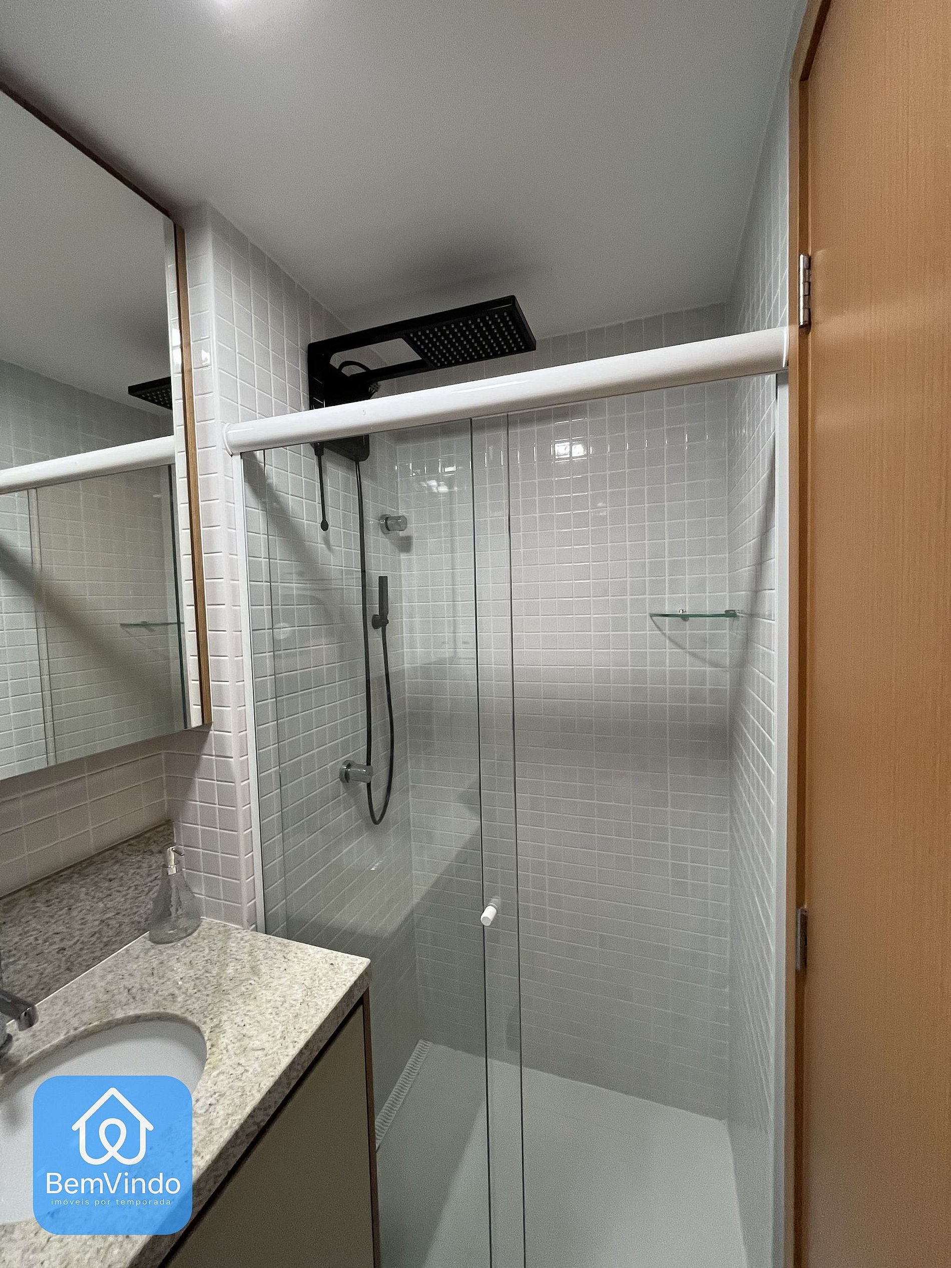 O banheiro é outro destaque, com chuveiro e espelho amplo, unindo praticidade e sofisticação.