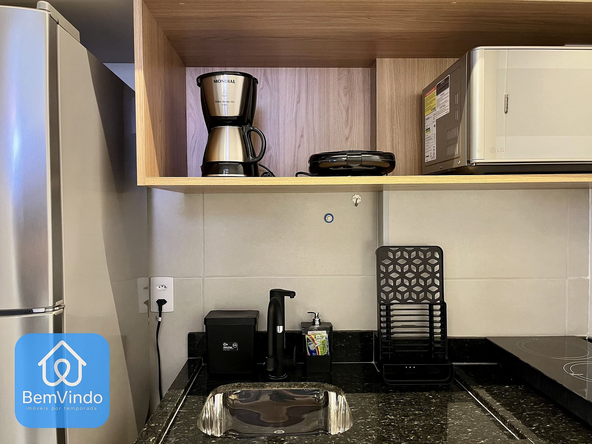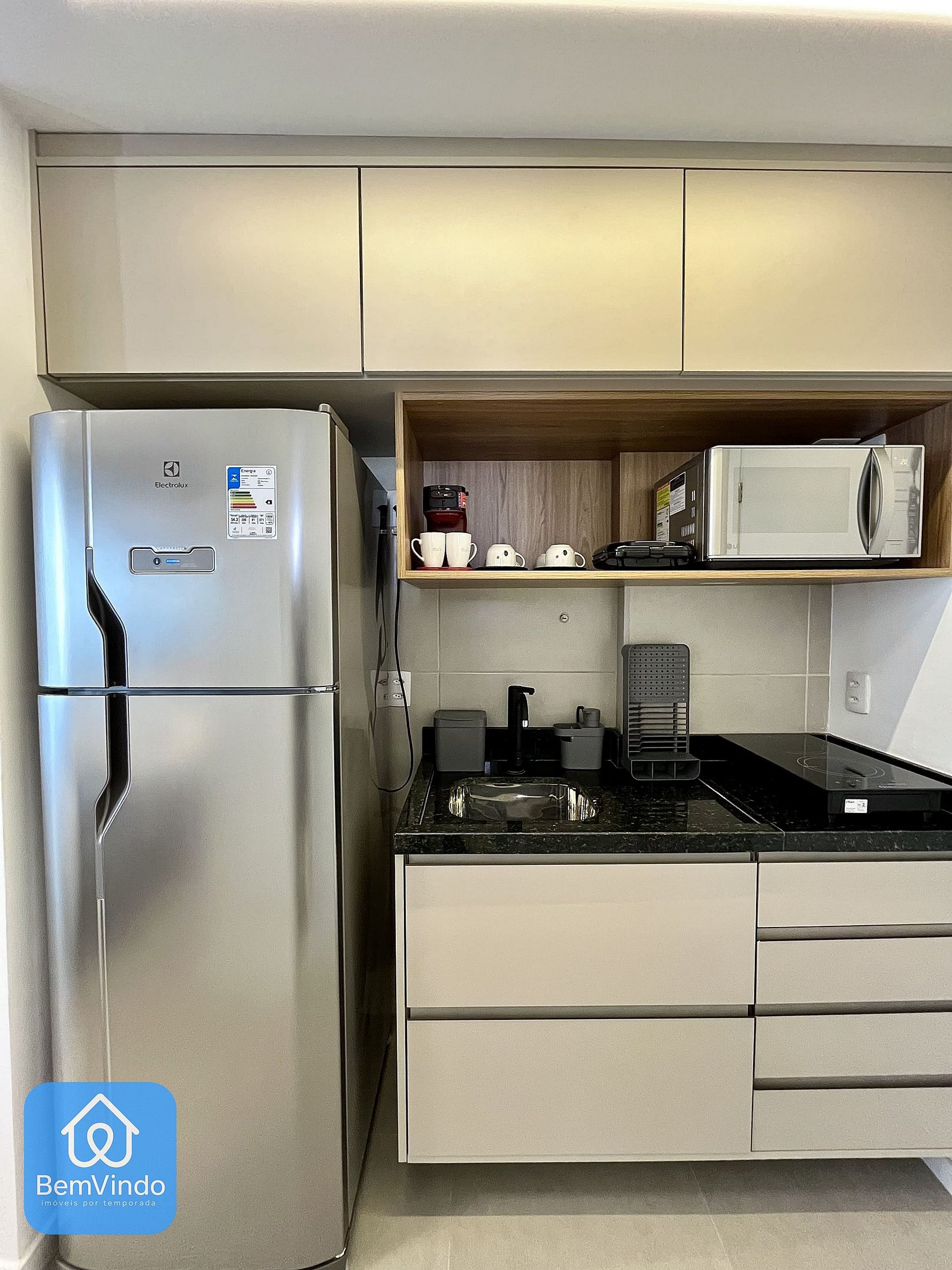 O banheiro é outro destaque, com chuveiro e espelho amplo, unindo praticidade e sofisticação. A cozinha, prática e completa, está equipada com cooktop elétrico, micro-ondas, geladeira e todos os utensílios necessários para preparar suas refeições com conforto e praticidade.