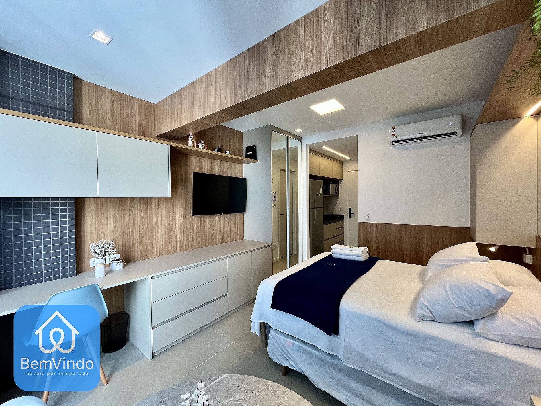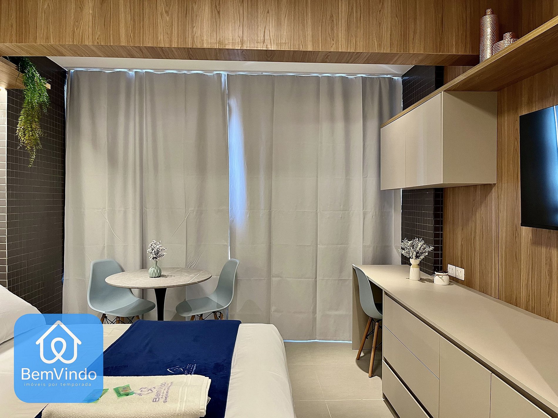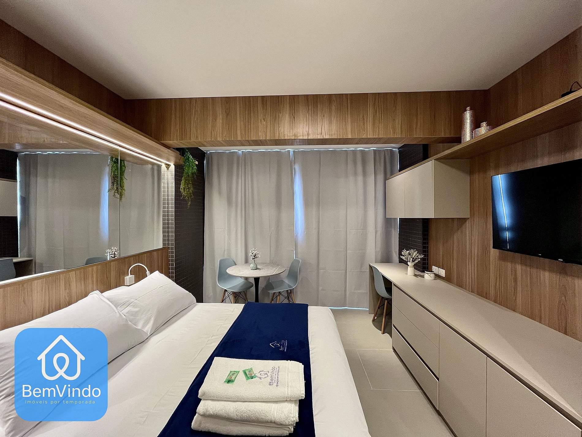 Estúdio climatizado, com ar-condicionado, dispõe de uma cama de casal e colchão auxiliar novos e extremamente confortáveis, garantindo uma excelente noite de descanso após um dia explorando a cidade, Smart TV, criando um ambiente acolhedor para relaxar.