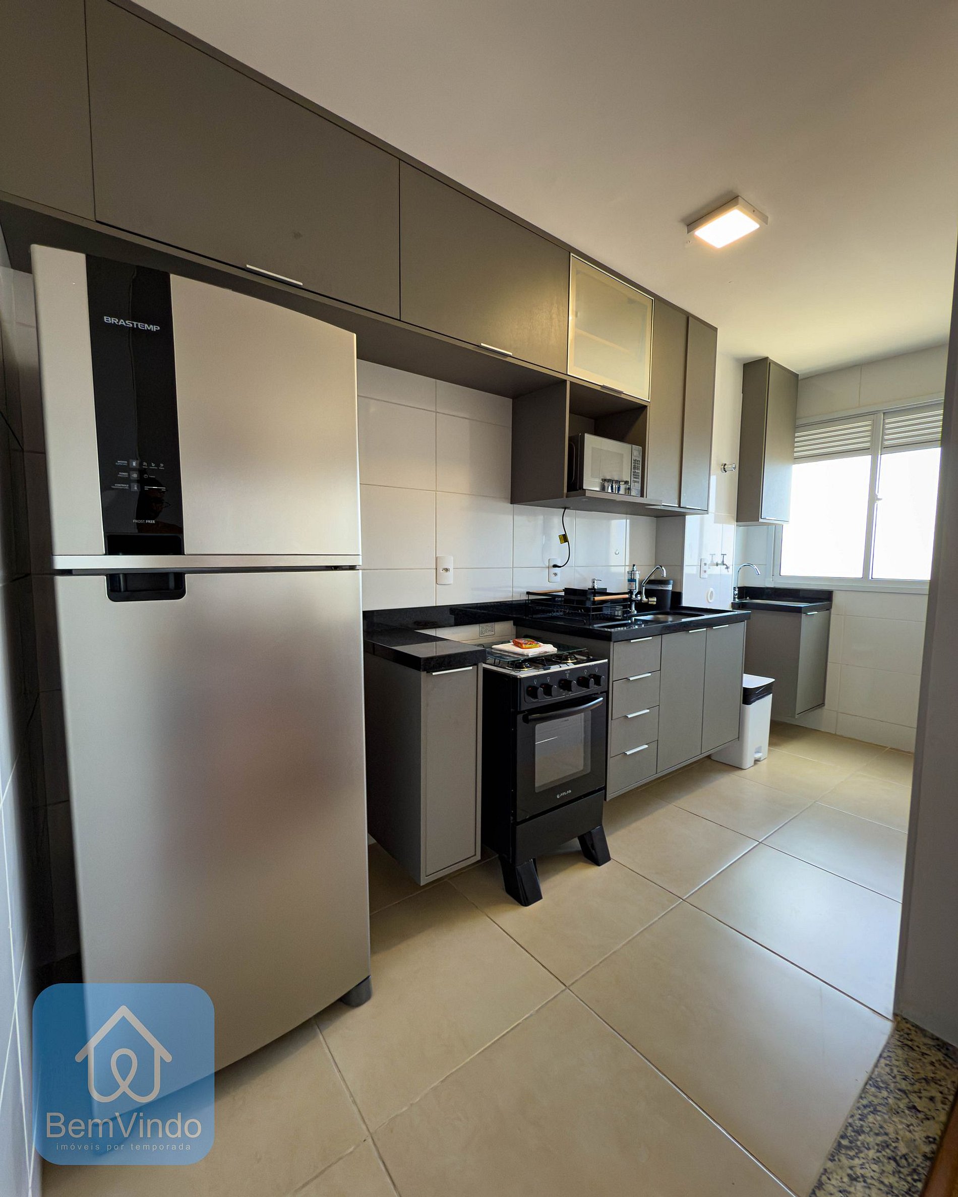 A cozinha, prática e completa, está equipada com fogão, microondas, geladeira e todos os utensílios necessários para preparar suas refeições com conforto e praticidade.