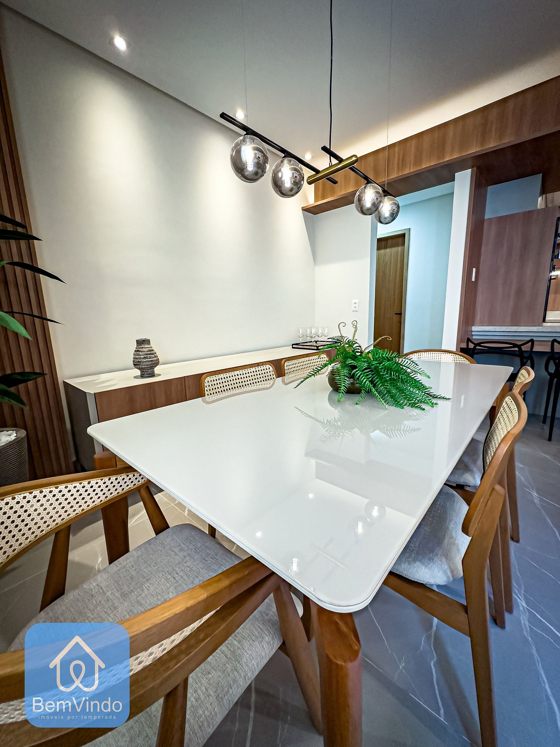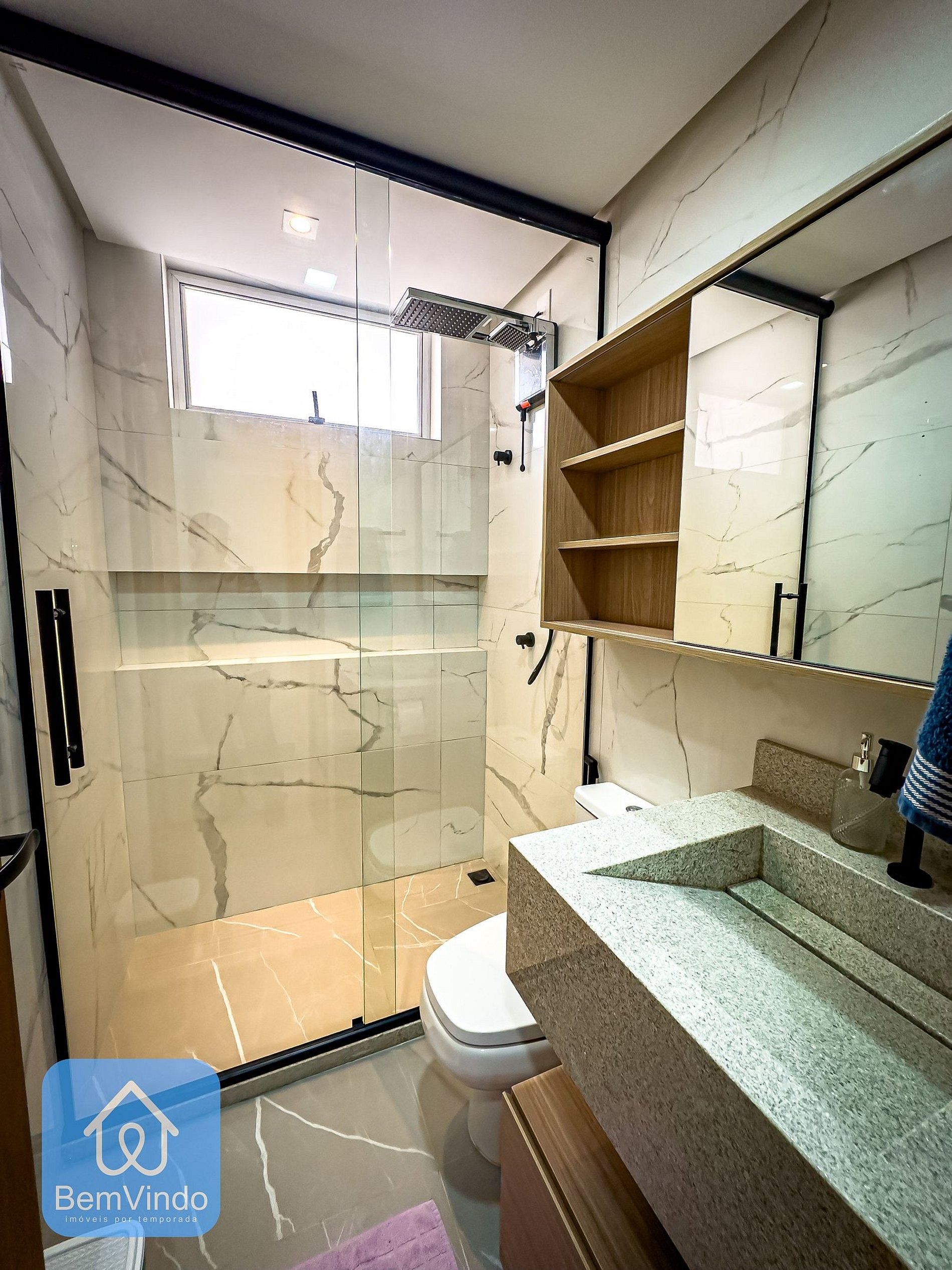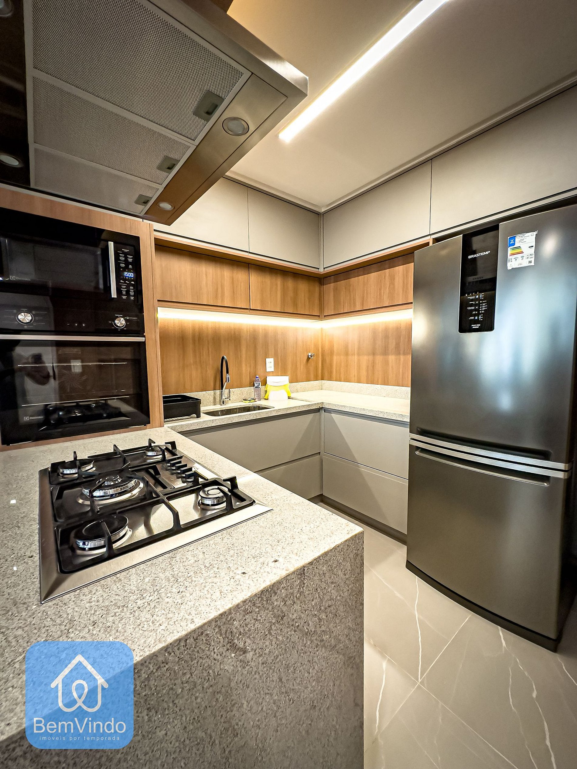 Nossa cozinha totalmente equipada proporciona tudo o que você precisa para preparar suas refeições, desde utensílios modernos até eletrodomésticos de última geração, incluindo geladeira, microondas, fogão e forno elétrico. O banheiro é impecável, complementando o luxo do apartamento.