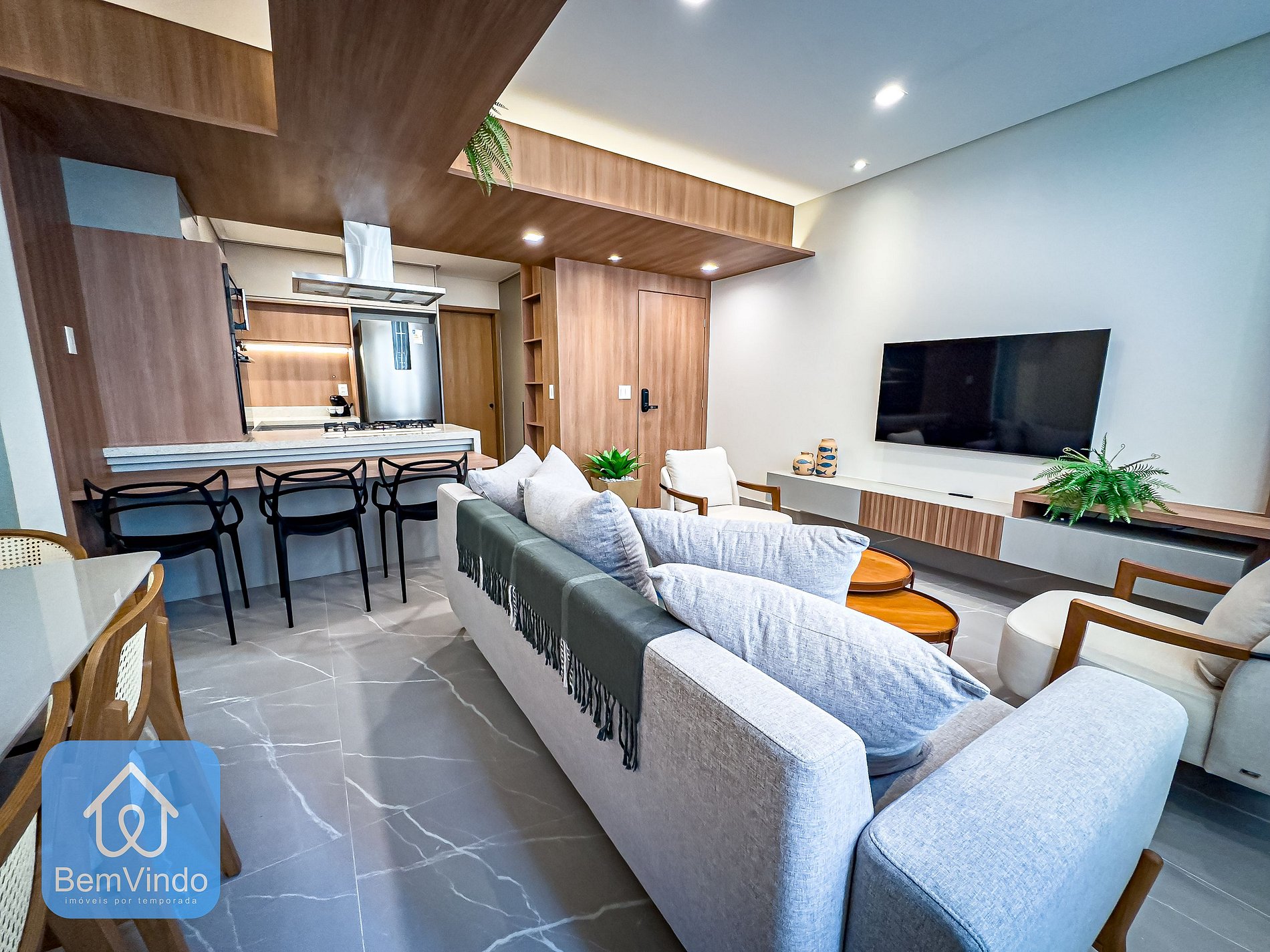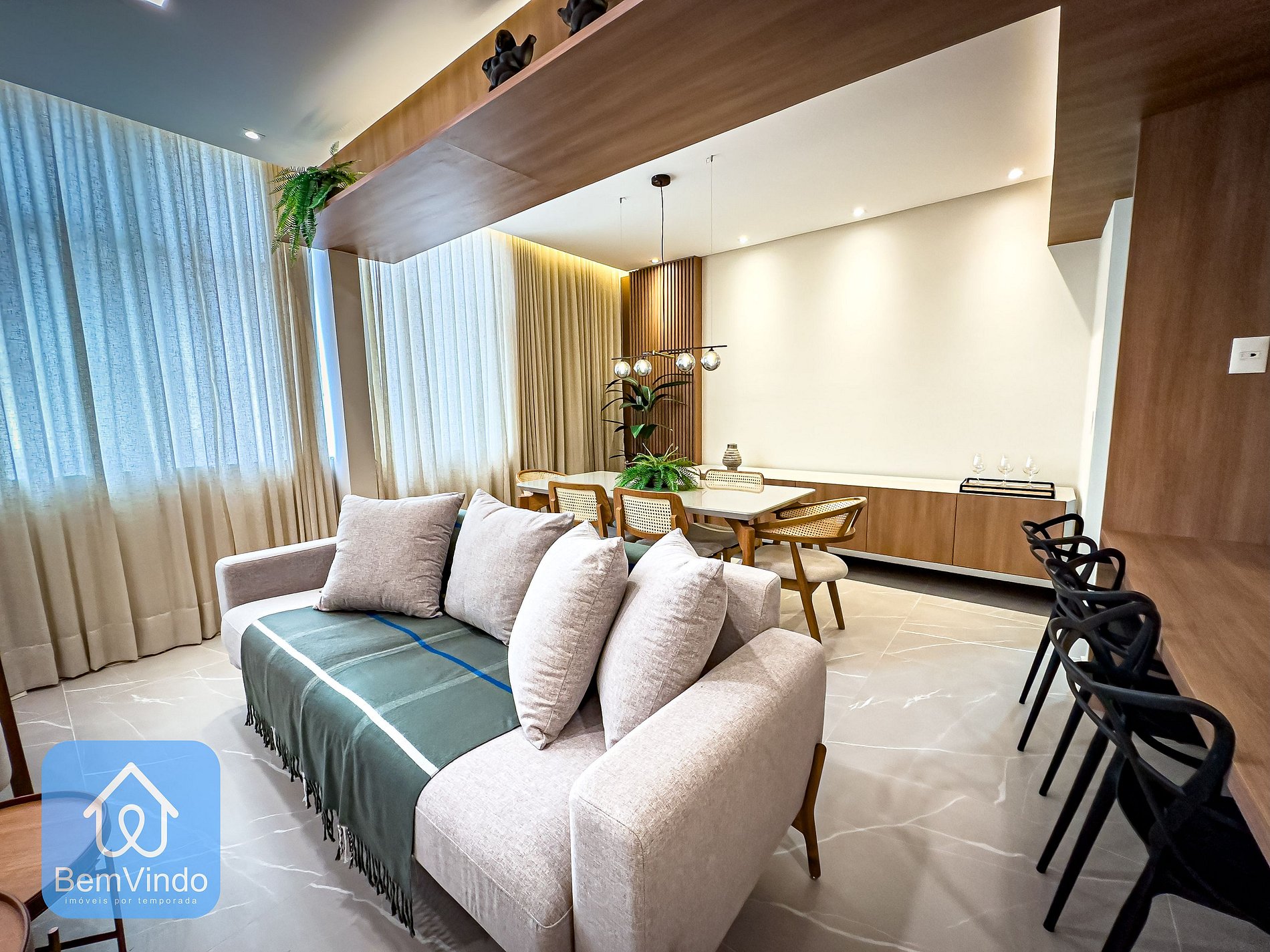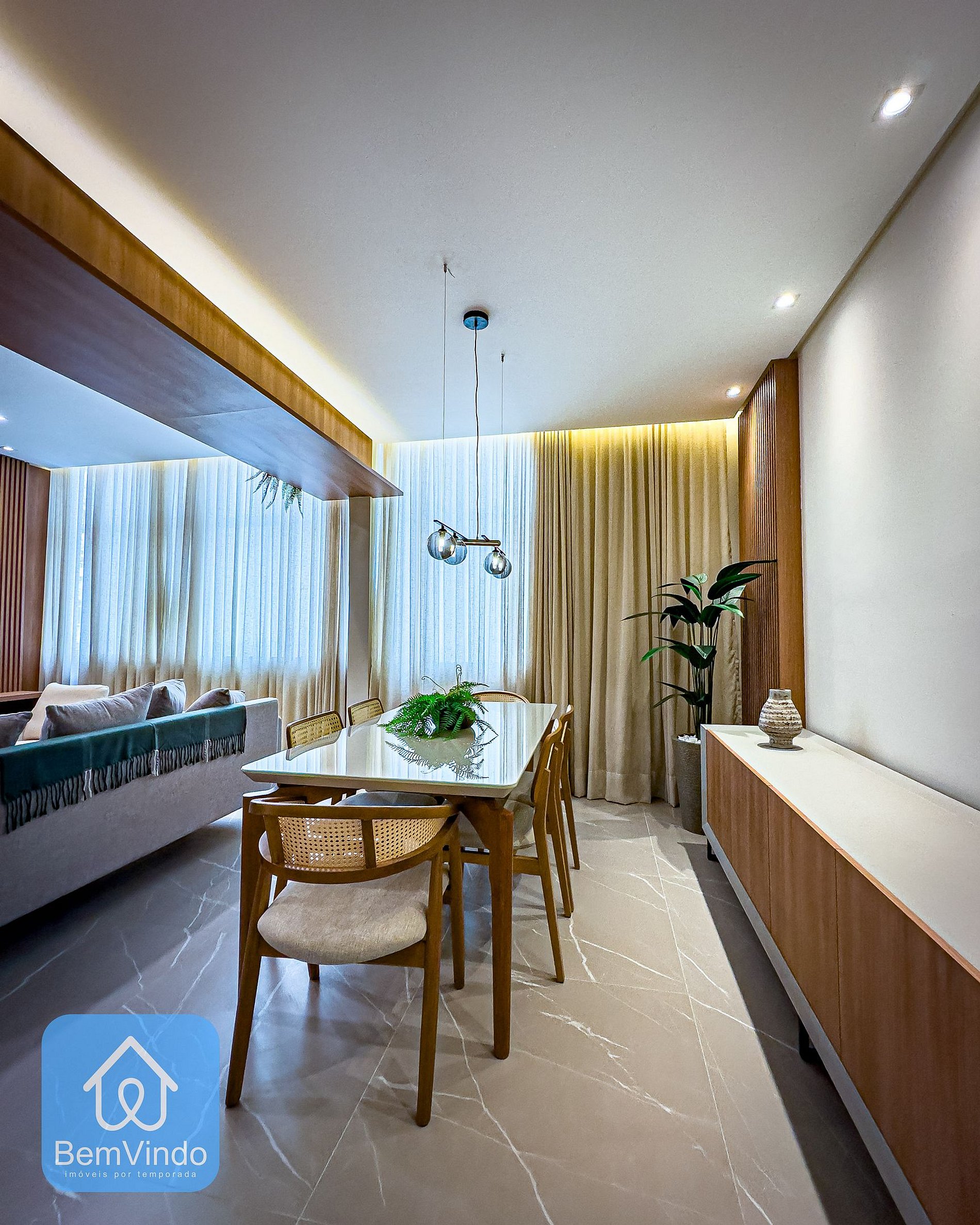 Ao adentrar nosso apartamento, você será recebido por uma atmosfera de elegância e sofisticação. Nossos dois quartos são cuidadosamente decorados, com uma cama de casal confortável em um e um sofá-cama de alta qualidade no outro. A sala espaçosa é um convite ao relaxamento, com um sofá de alto padrão e uma mesa de jantar para seis pessoas, perfeita para desfrutar de refeições em grande estilo.