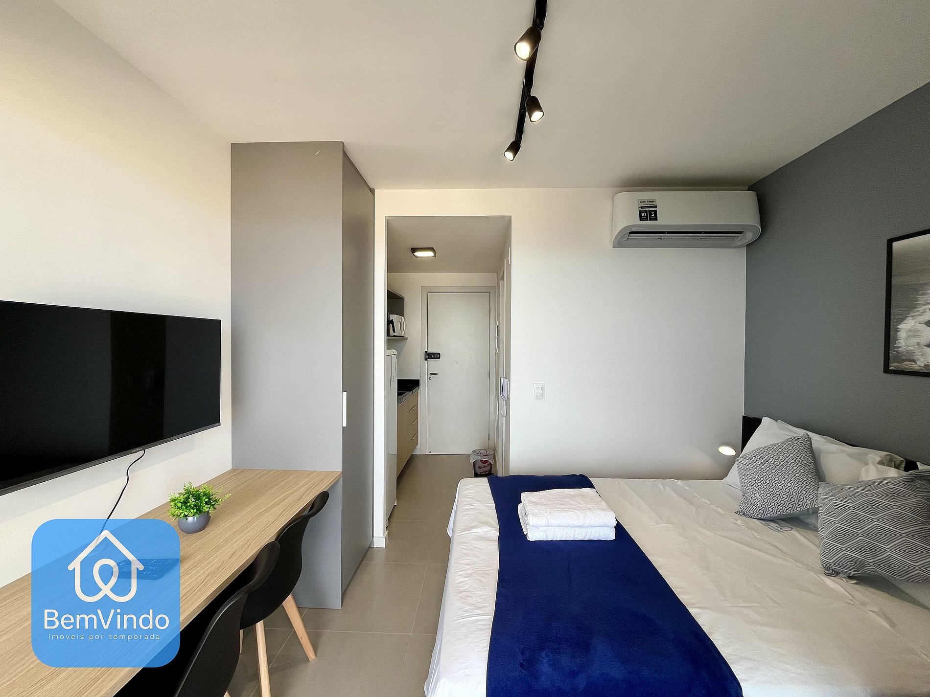 O espaço conta com uma cama de casal super confortável, Smart TV, ar condicionado, mesa de jantar para momentos de lazer e refeições aconchegantes.