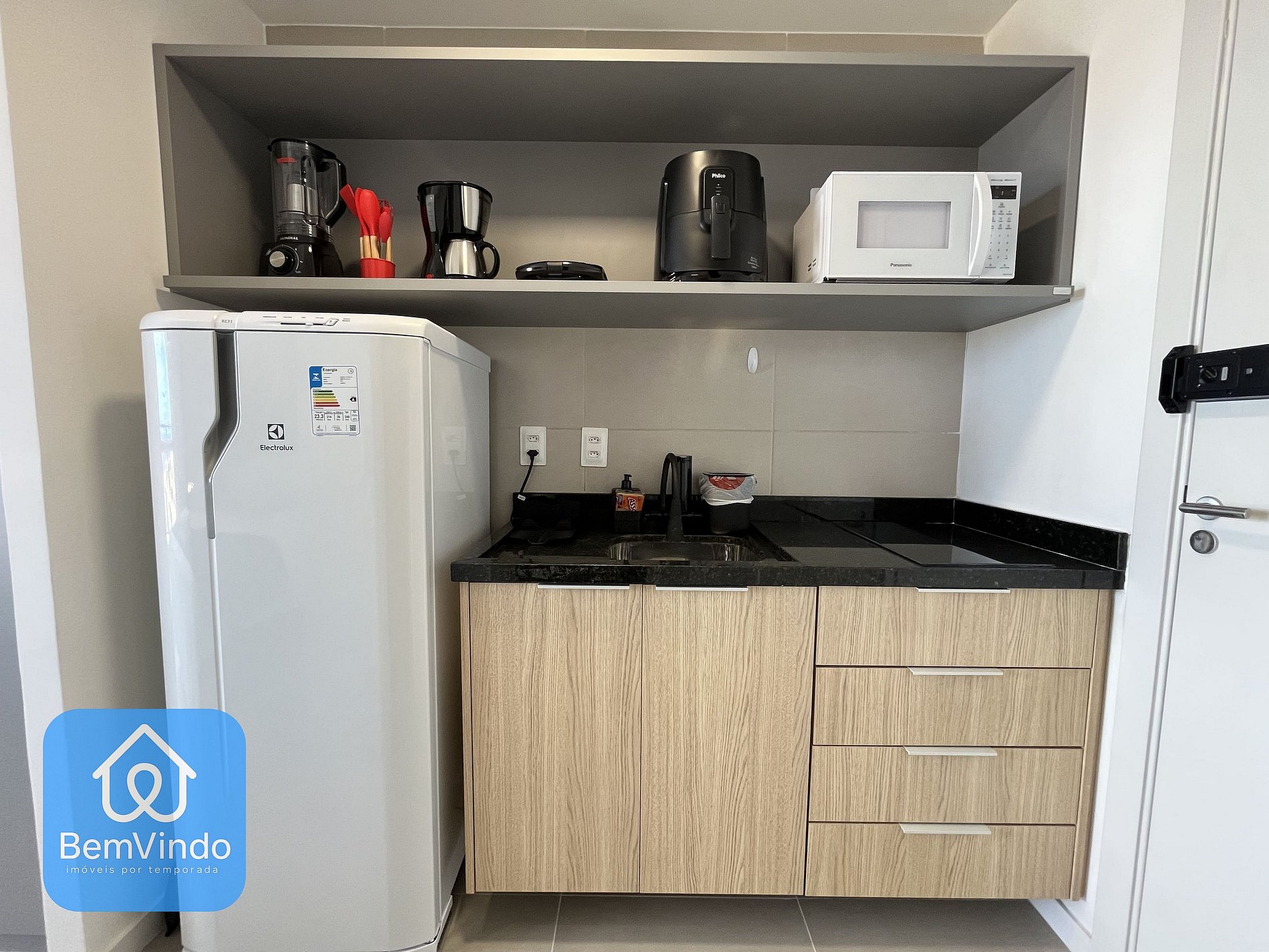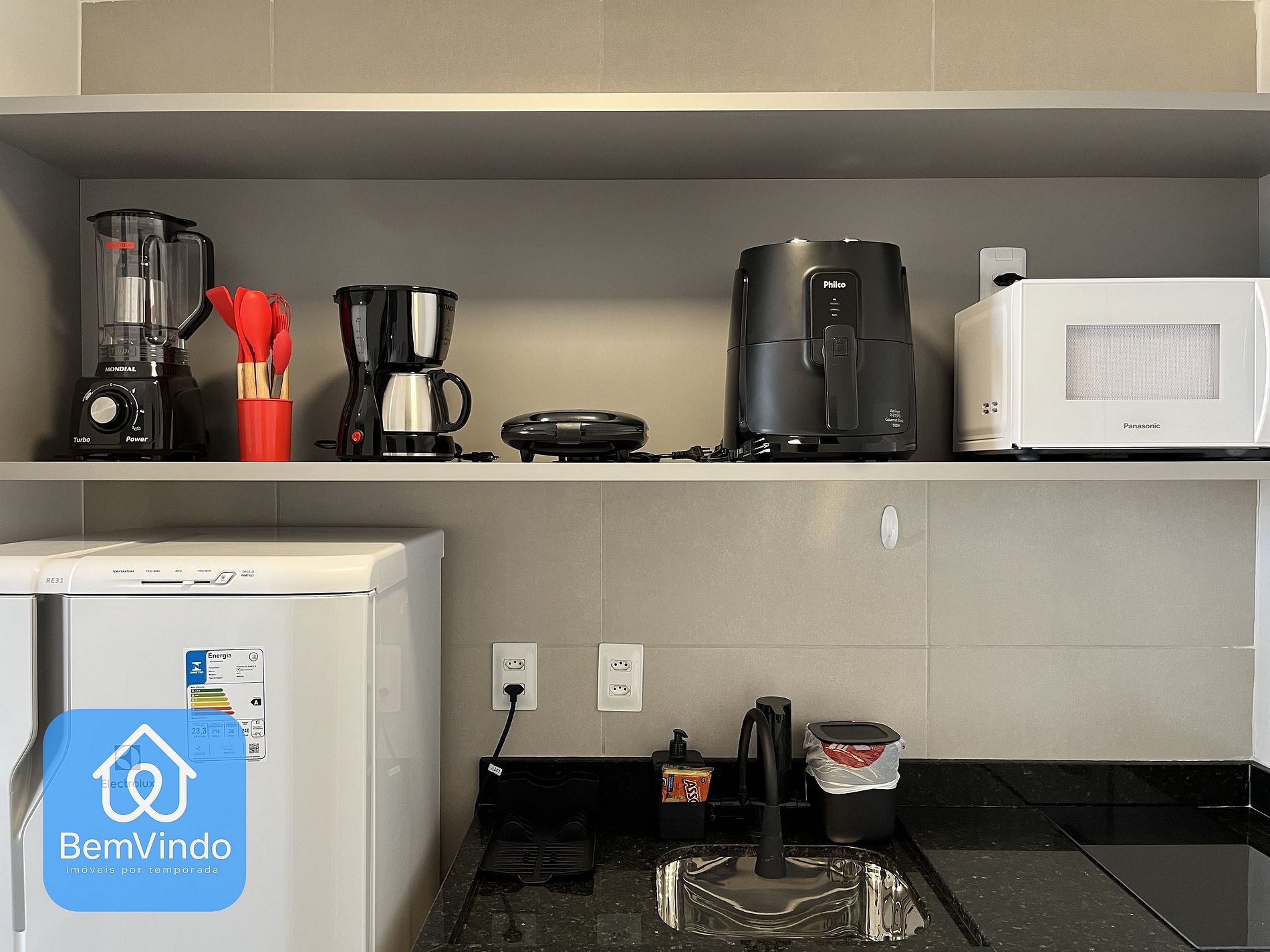A cozinha completa possui todos os utensílios e eletrodomésticos necessários para preparar refeições deliciosas, incluindo fogão cooktop, micro-ondas, liquidificador, sanduicheira, máquina de café e geladeira.