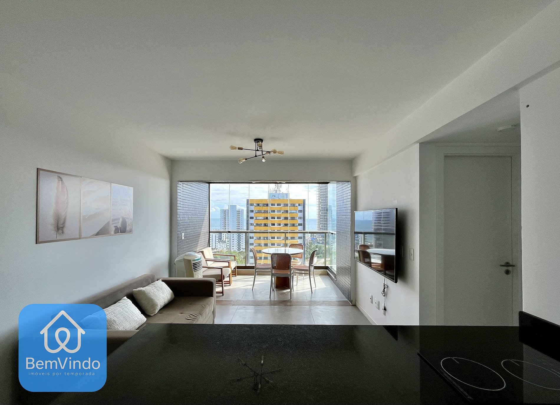 Sala e Varanda: A sala possui um sofá confortável, Smart TV para entretenimento, além de ser integrada à cozinha e à varanda espaçosa, onde você encontra uma mesa com cadeiras e uma vista agradável para o bairro da Barra.