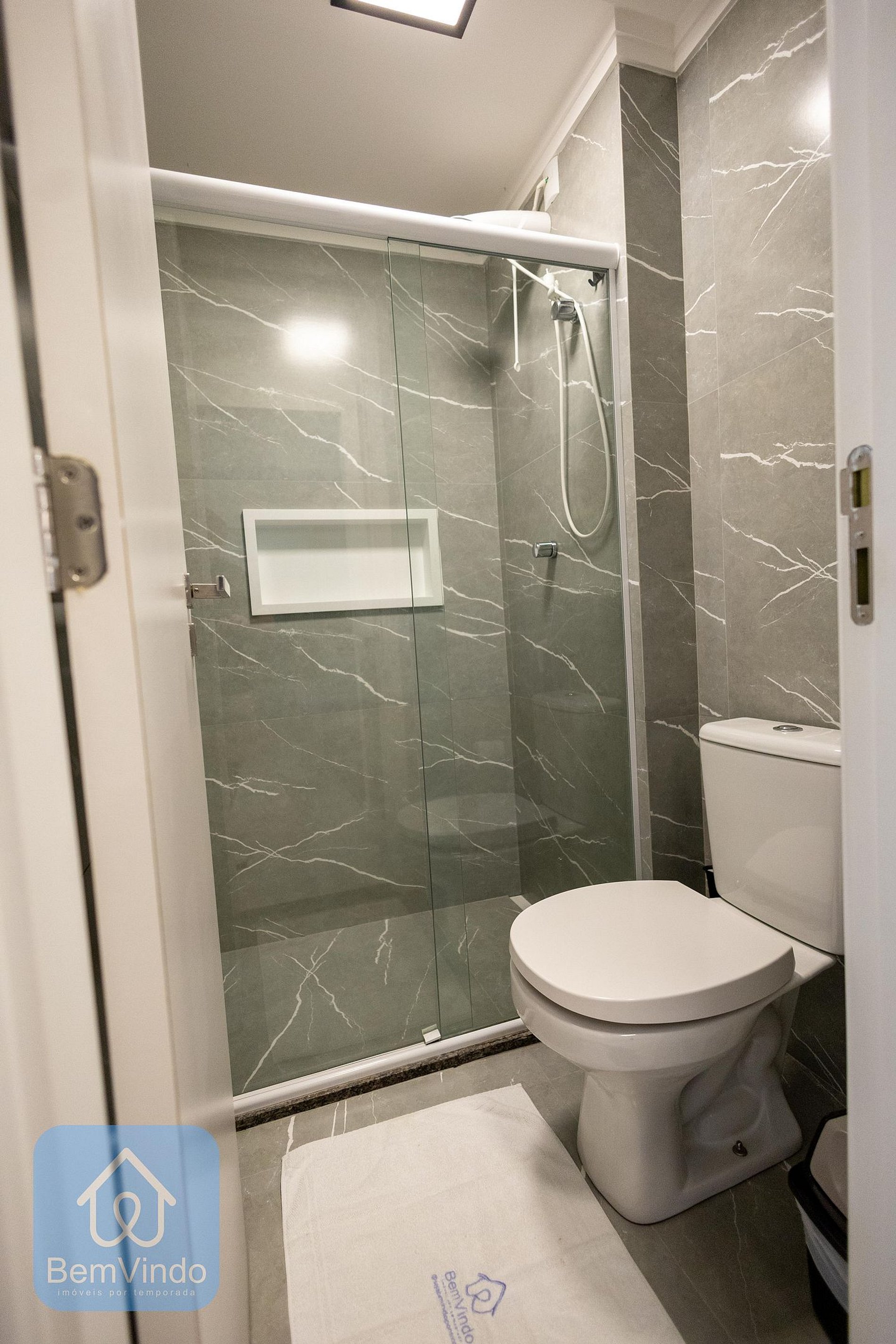 O banheiro privativo é moderno, bem iluminado e possui espelho amplo.