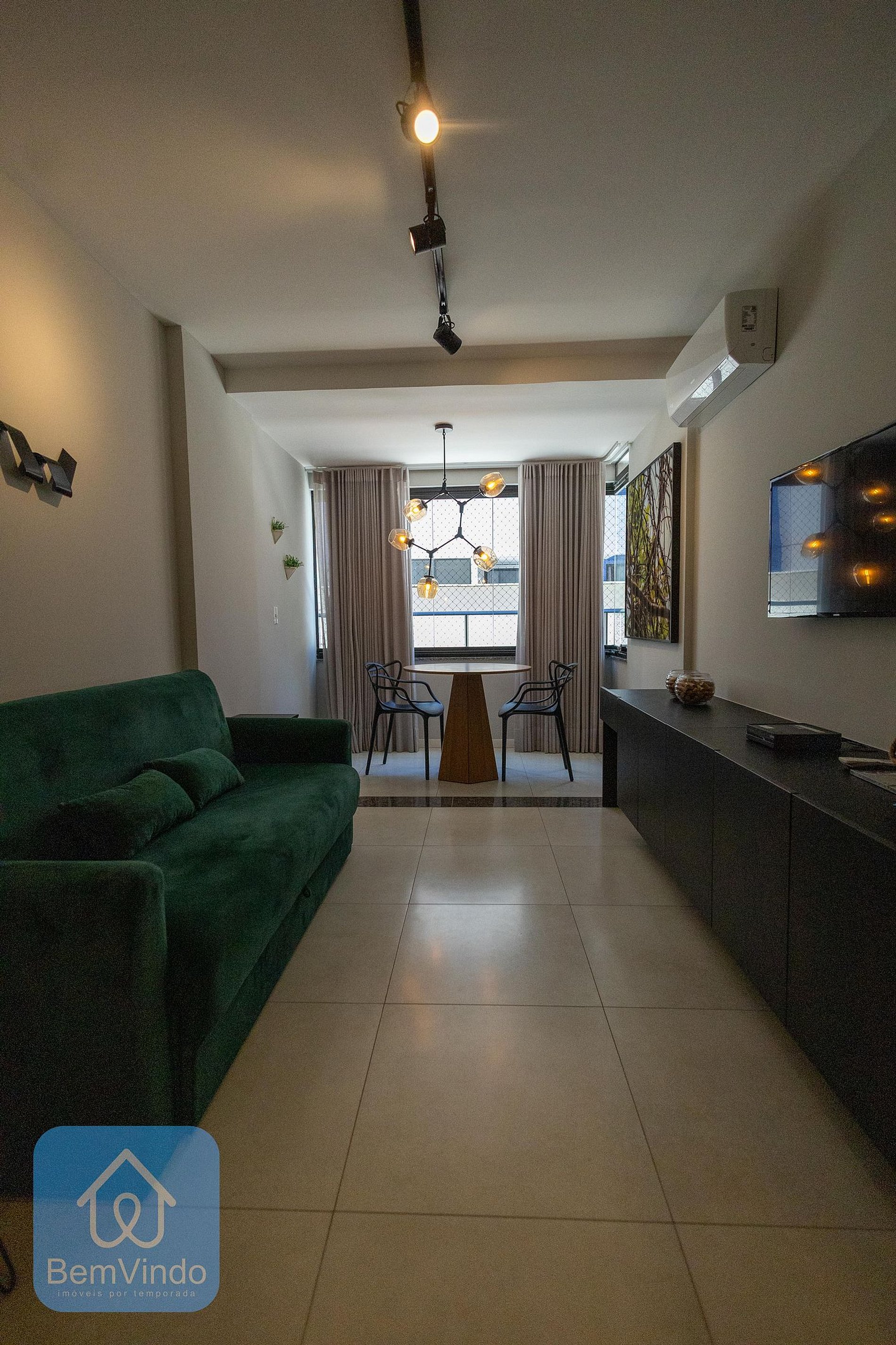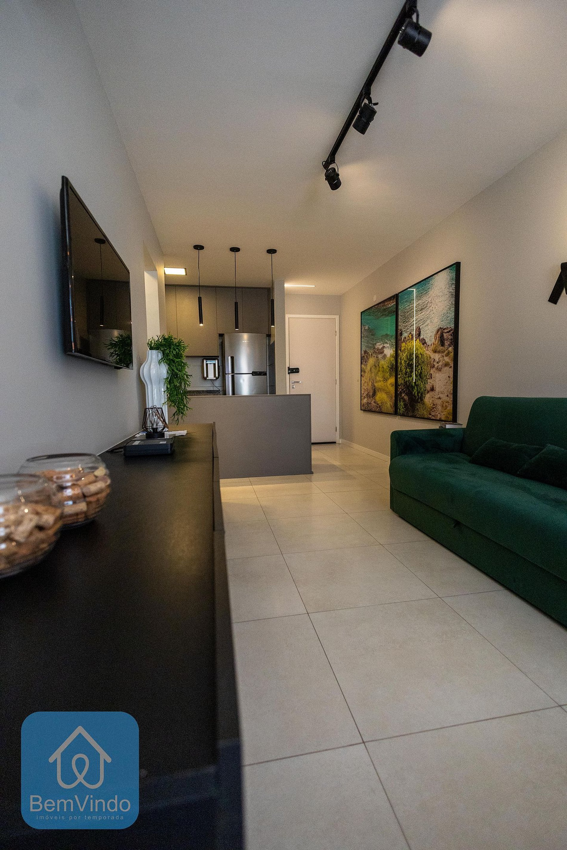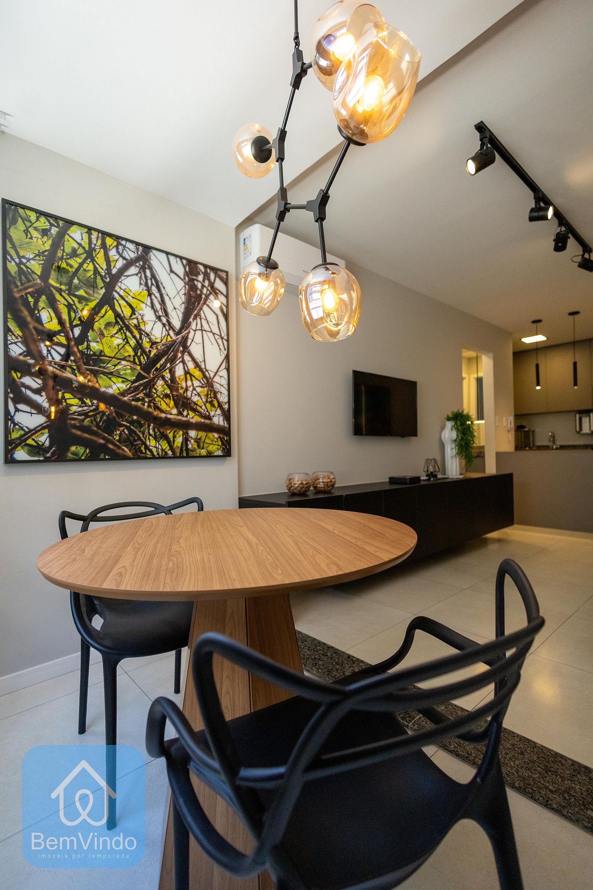 A sala possui um sofá confortável, Smart TV para entretenimento, além de ser integrada à cozinha, onde você encontra uma mesa com cadeiras para realizar refeições