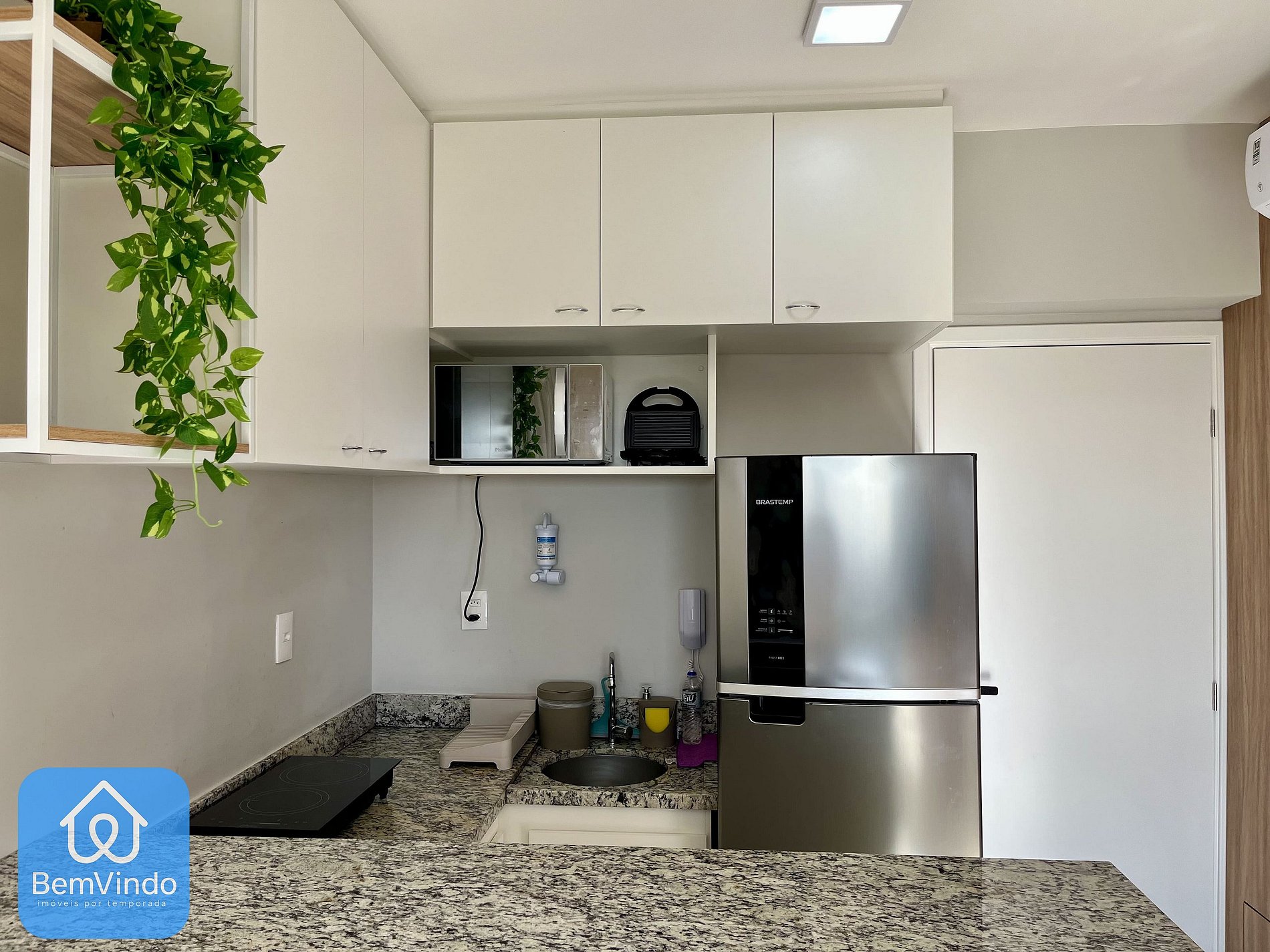 A cozinha, prática e completa, está equipada com cooktop elétrico, micro-ondas, geladeira, sanduicheira e todos os utensílios necessários para preparar suas refeições com conforto e praticidade.