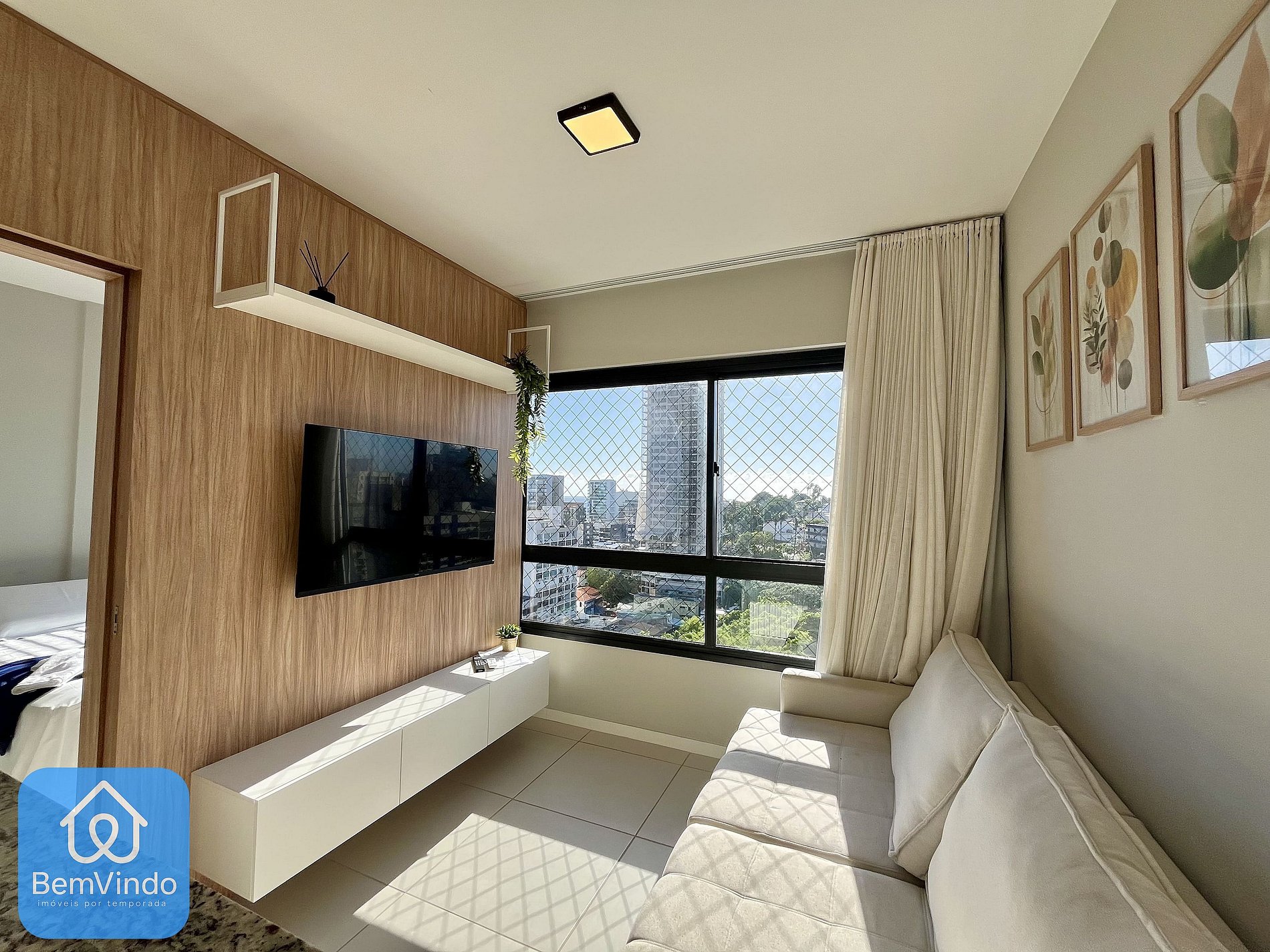 A sala de estar é espaçosa e aconchegante, com um sofá confortável e Smart TV, criando um ambiente acolhedor para relaxar.