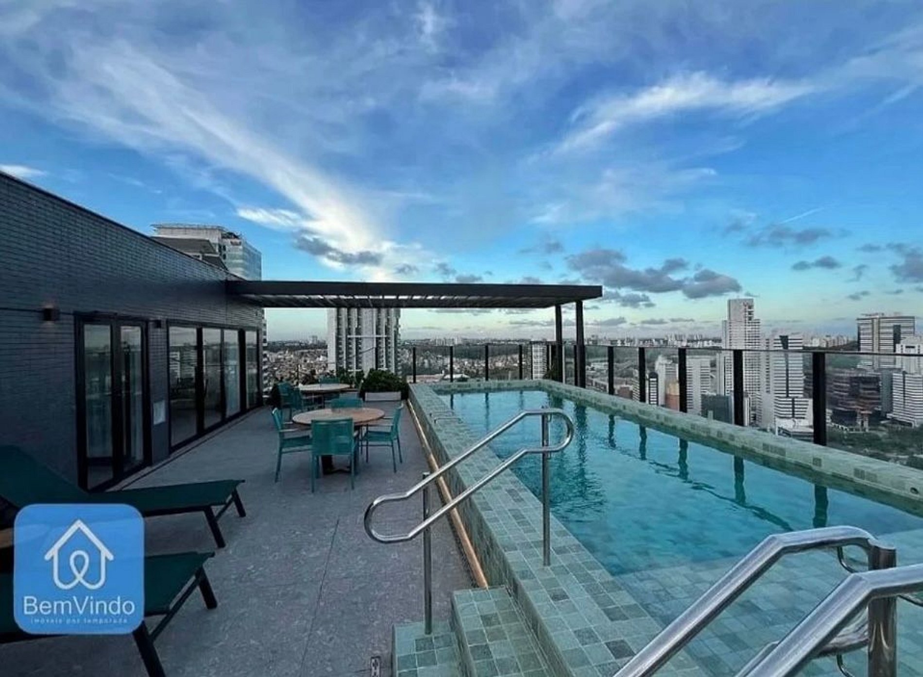 Piscina com espreguiçadeiras, ideal para momentos de lazer.