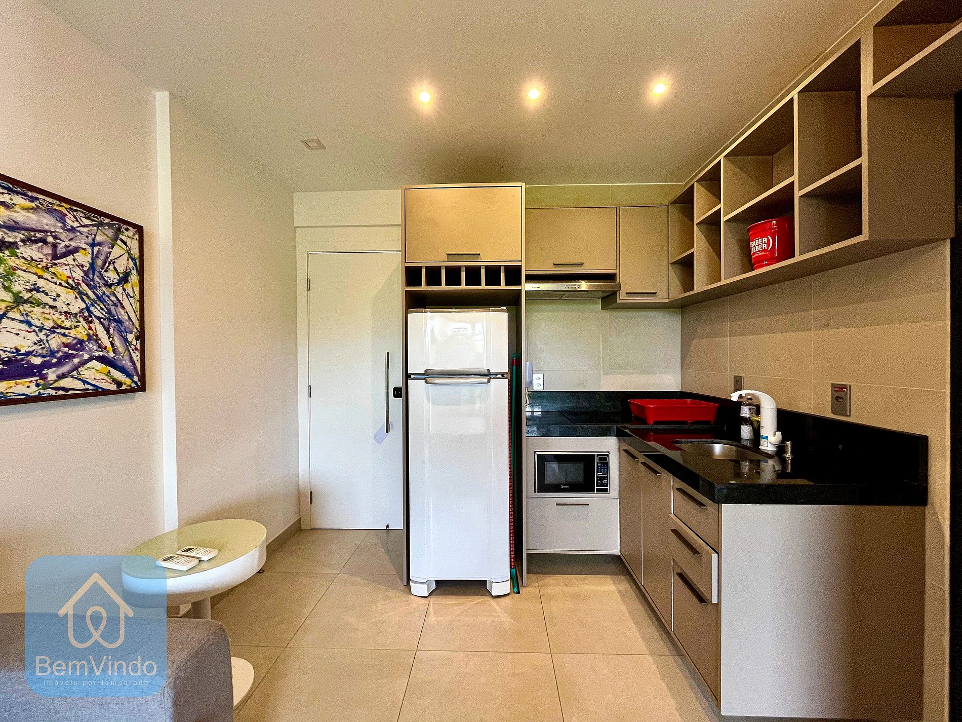 A cozinha, prática e completa, está equipada com cooktop elétrico, micro-ondas, geladeira e todos os utensílios necessários para preparar suas refeições com conforto e praticidade.