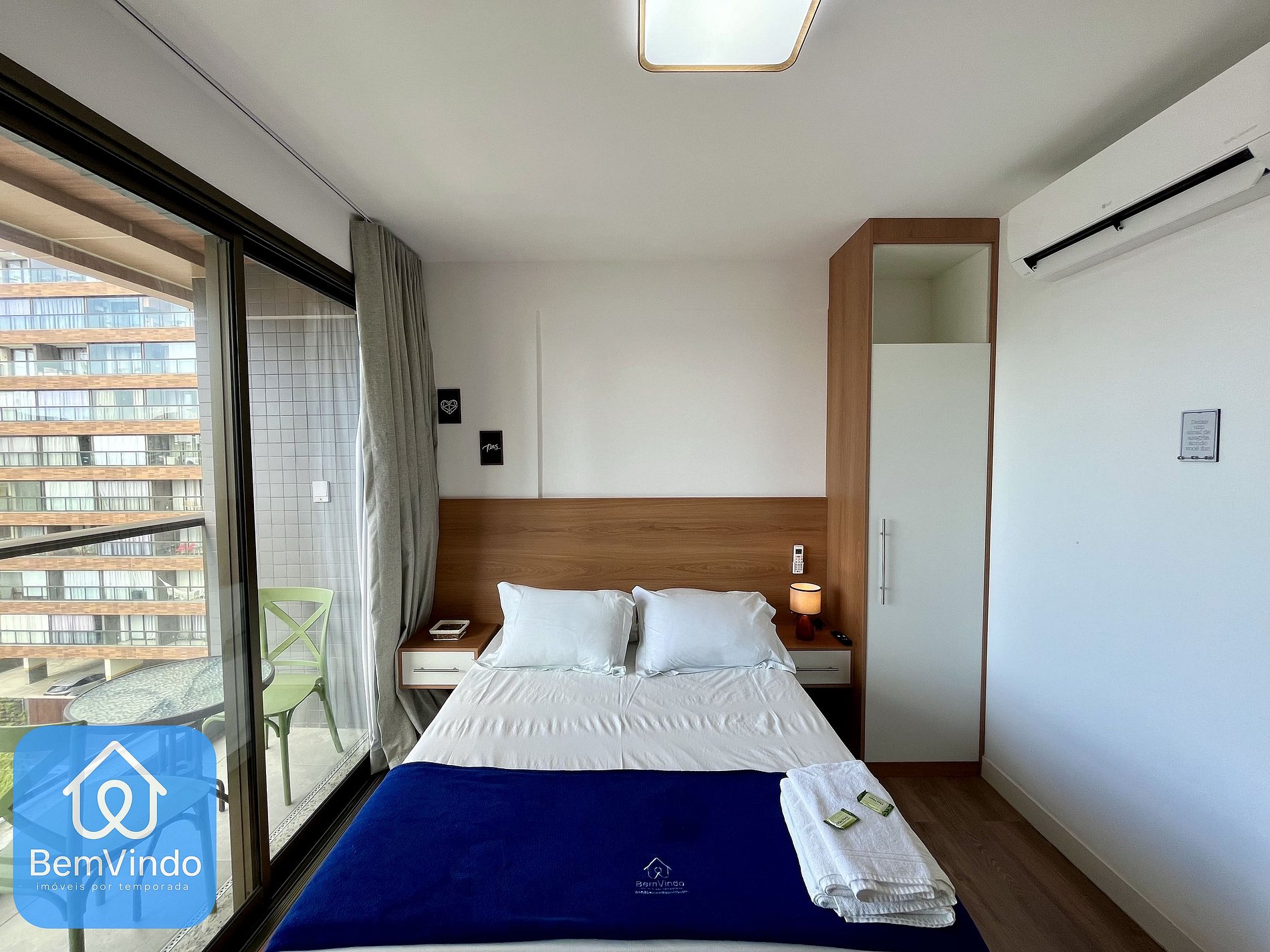 Acomode-se em uma cama de casal confortável enquanto assiste à TV ou relaxa com o ar-condicionado. A varanda panorâmica possui cortina blackout garantindo noites tranquilas e um despertar com uma vista espetacular pro mar e cidade.