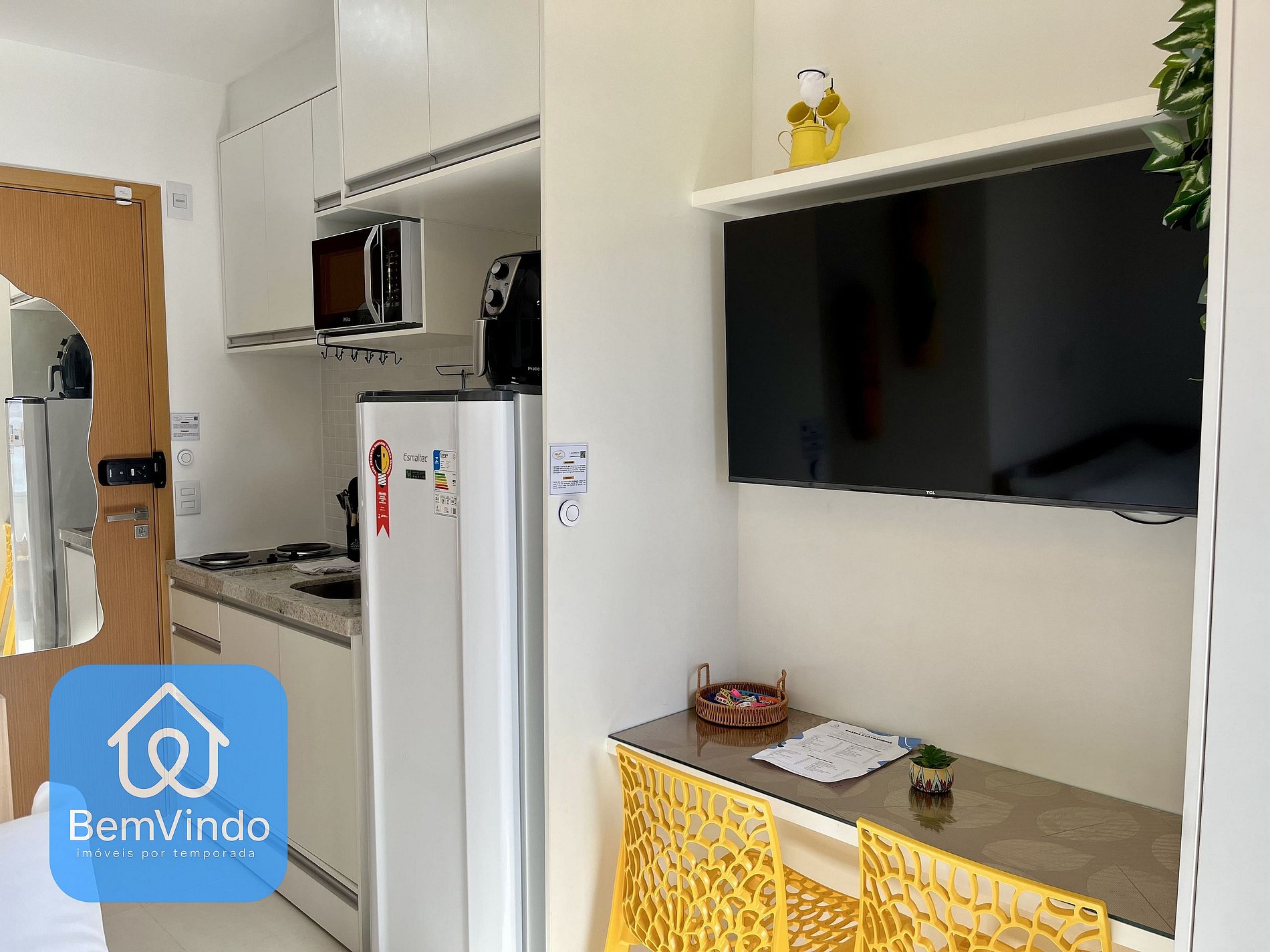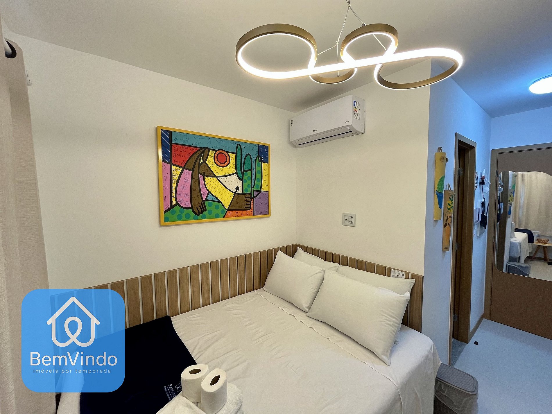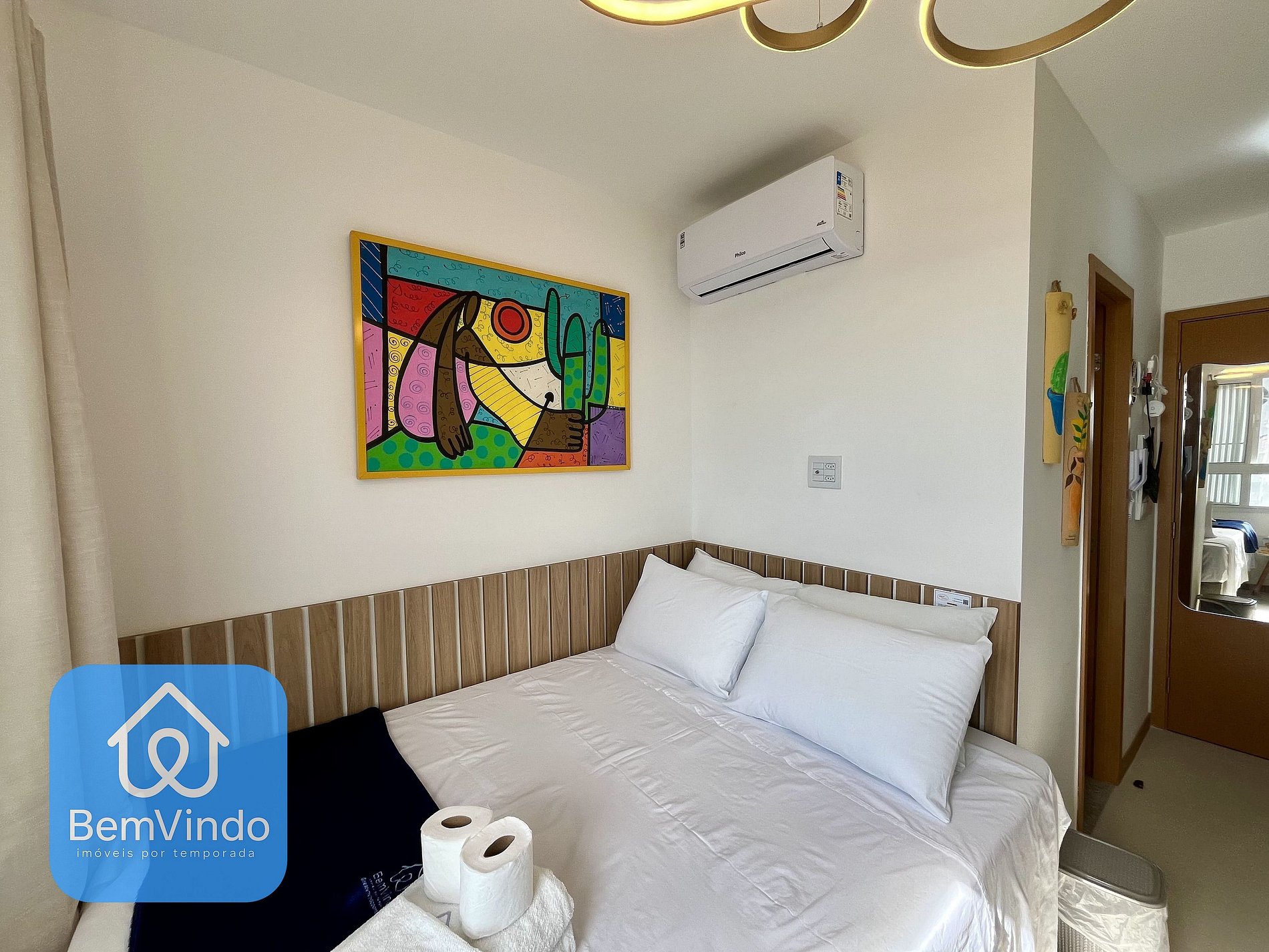 Quarto aconchegante Cama de casal nova e confortável, guarda-roupas amplo, Smart TV, ar-condicionado, internet Wi-Fi, cozinha equipada: Fogão cooktop, microondas, Airfryer, liquidificador, sanduicheira, geladeira e utensílios completos (panelas, pratos, copos, talheres e outros)