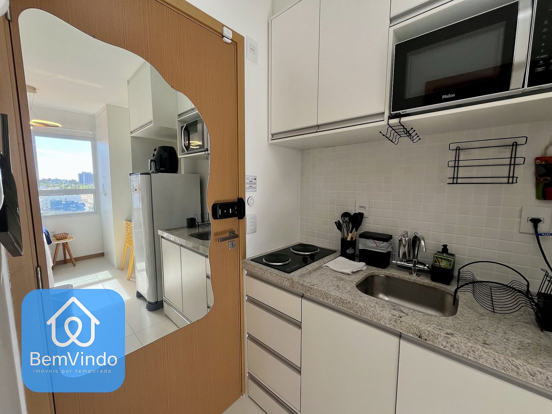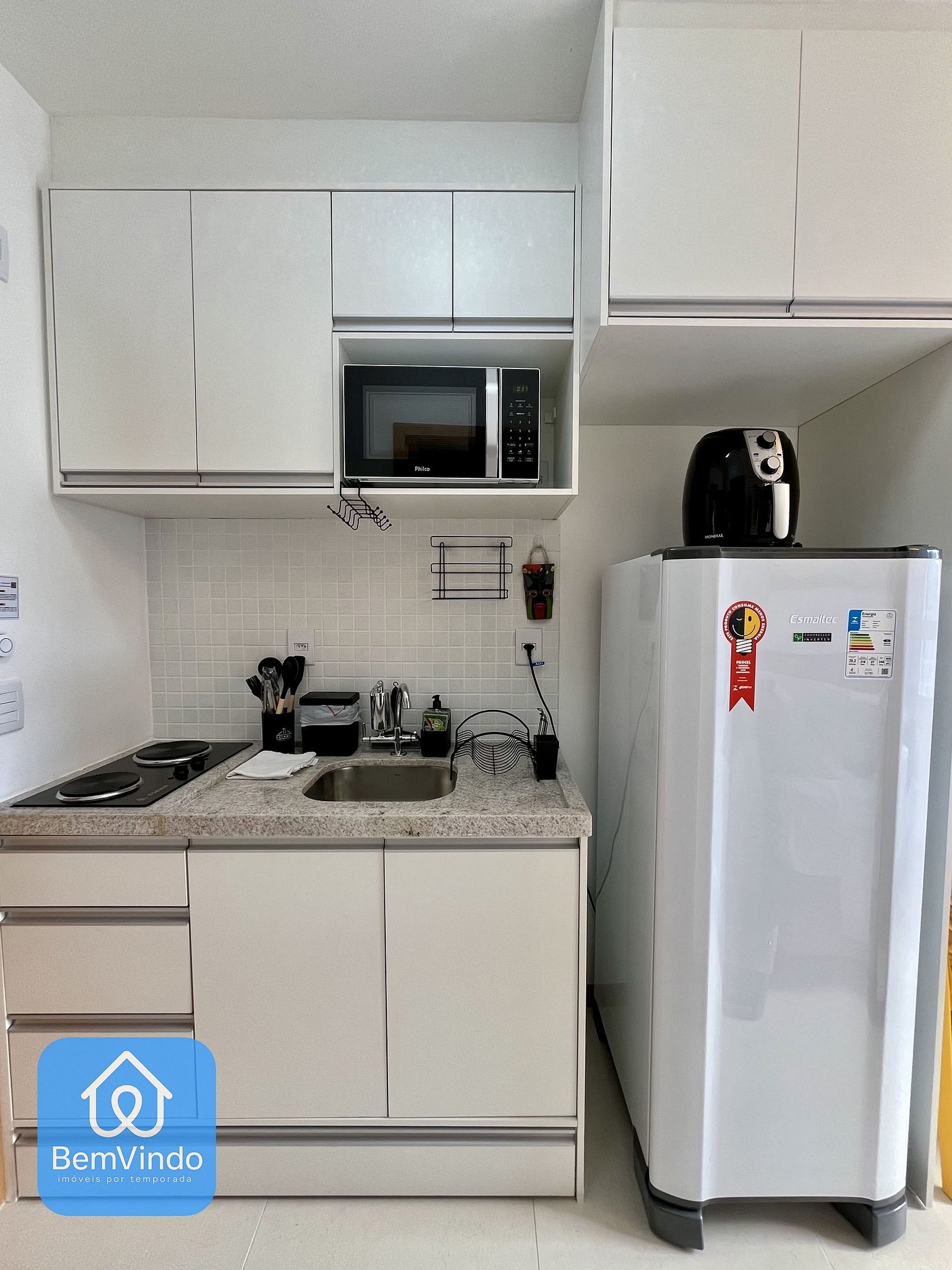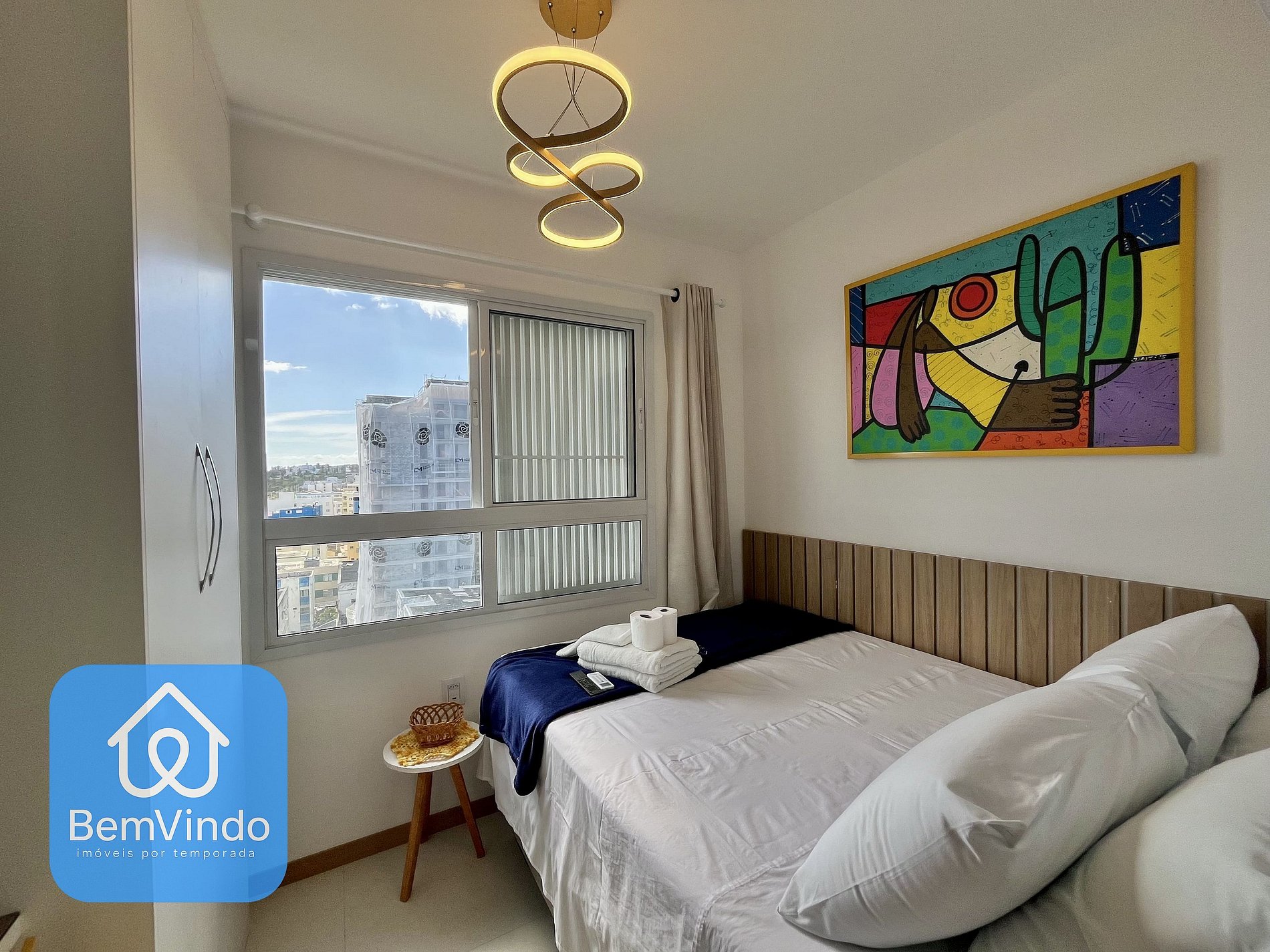Quarto aconchegante Cama de casal nova e confortável, guarda-roupas amplo, Smart TV, ar-condicionado, internet Wi-Fi, cozinha equipada: Fogão cooktop, microondas, Airfryer, liquidificador, sanduicheira, geladeira e utensílios completos (panelas, pratos, copos, talheres e outros)
