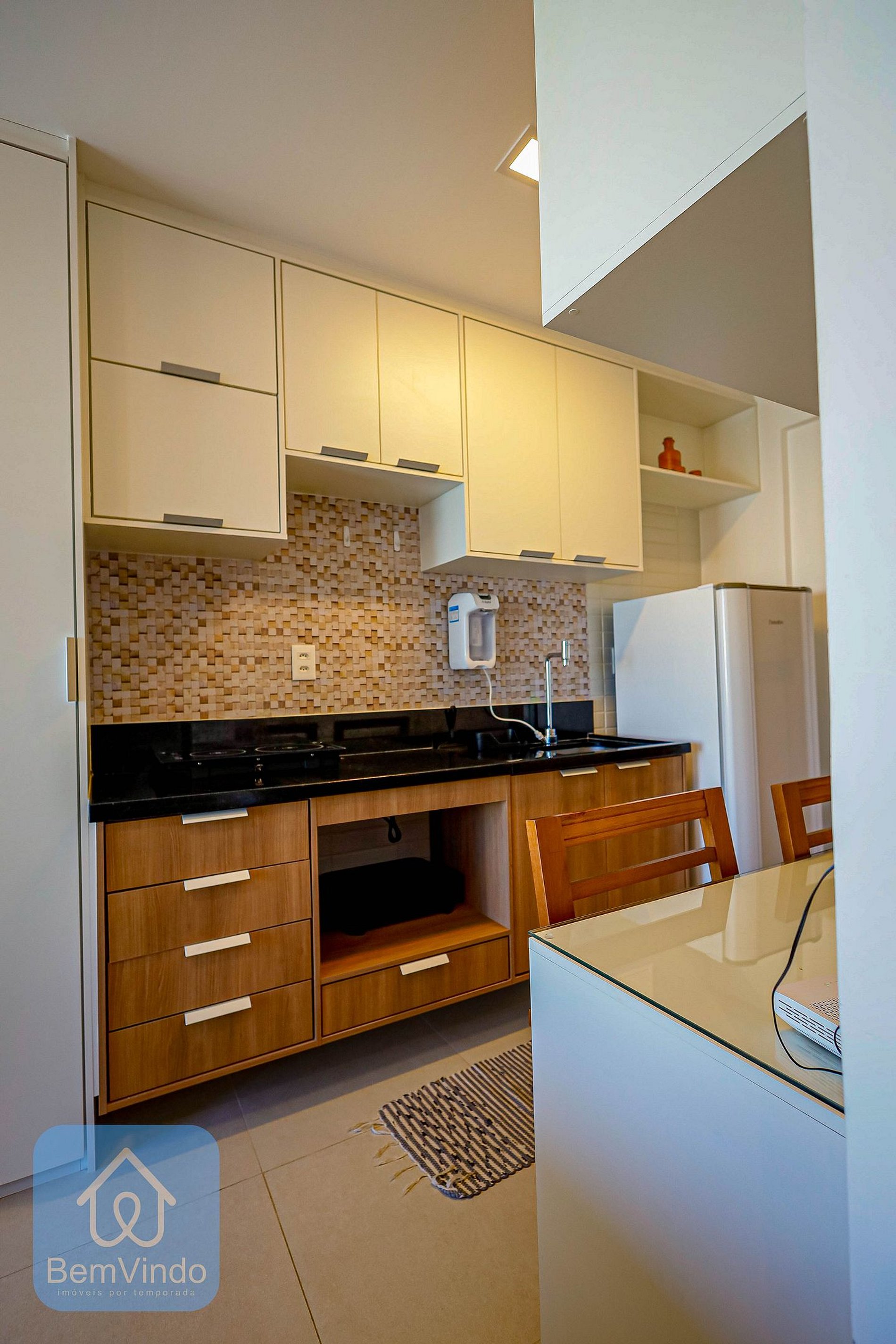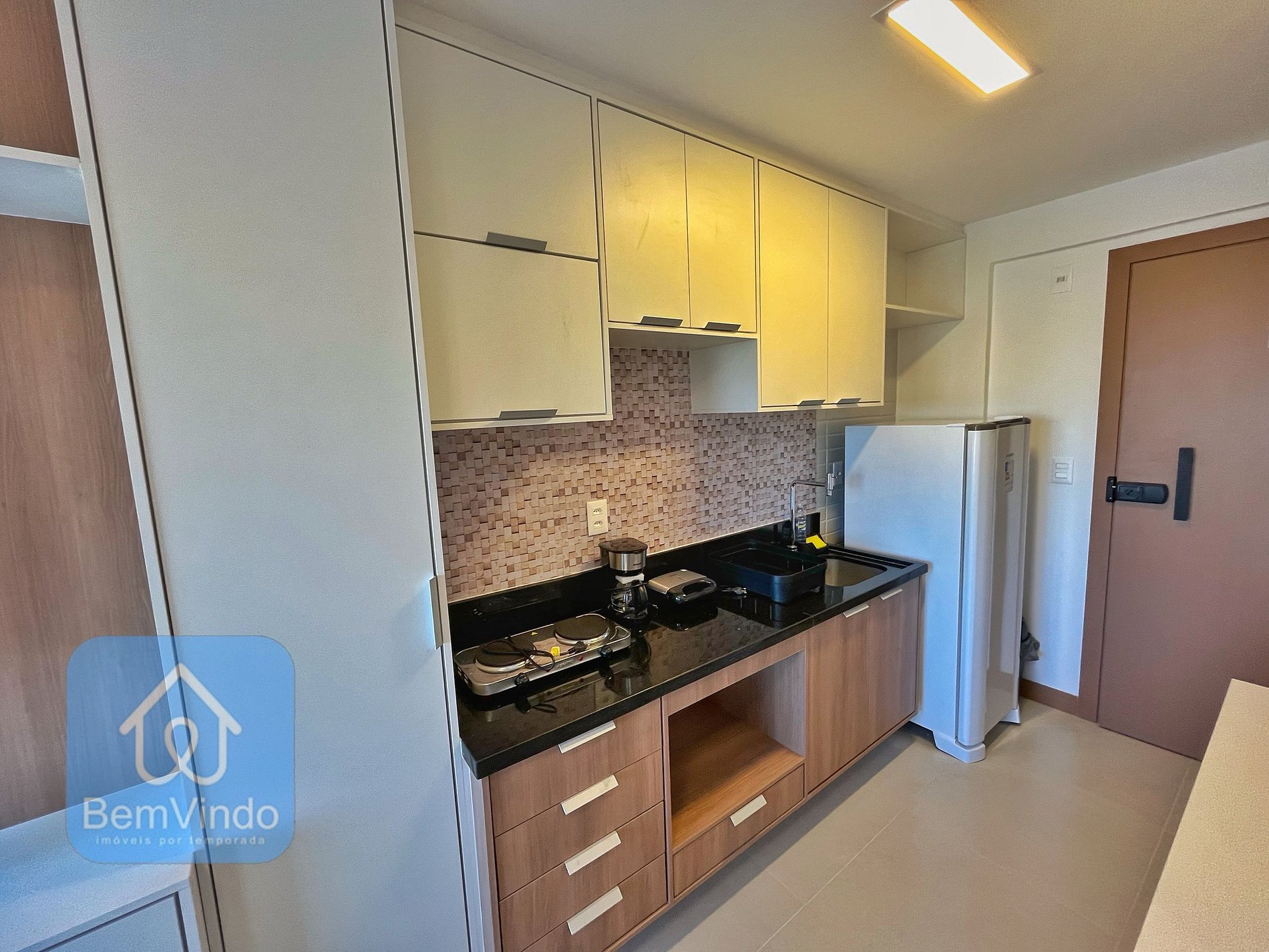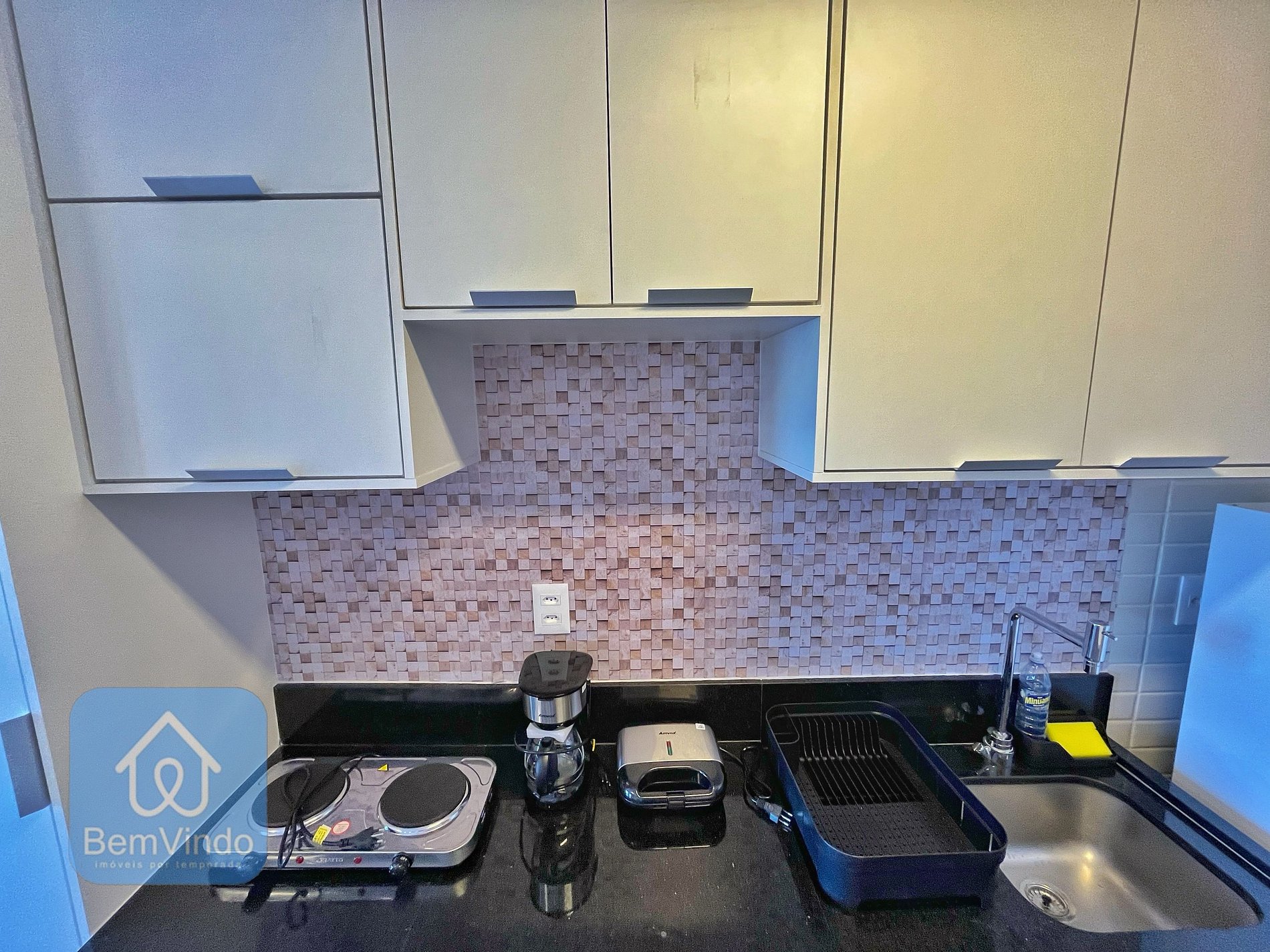 A cozinha foi planejada para atender todas as suas necessidades. Equipada com cafeteira, sanduicheira, cooktop de duas bocas, micro-ondas e todos os utensílios necessários, você terá a liberdade de preparar desde um café da manhã simples até refeições mais elaboradas.