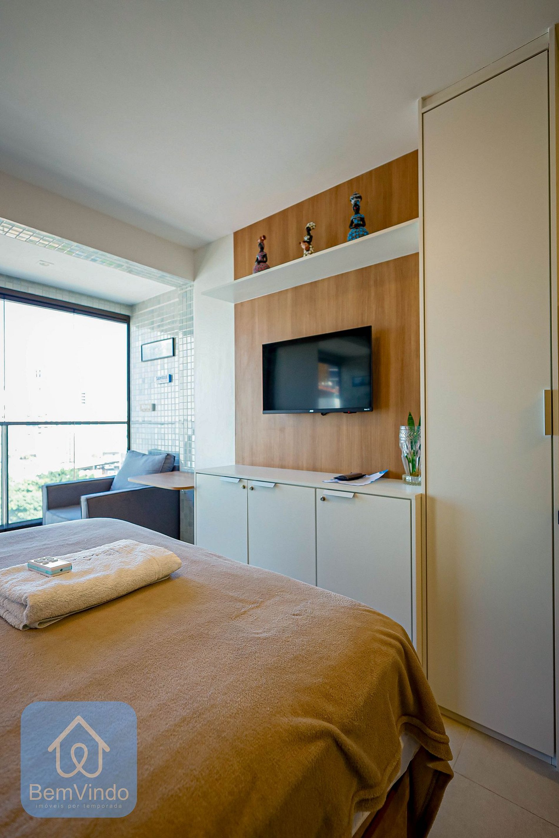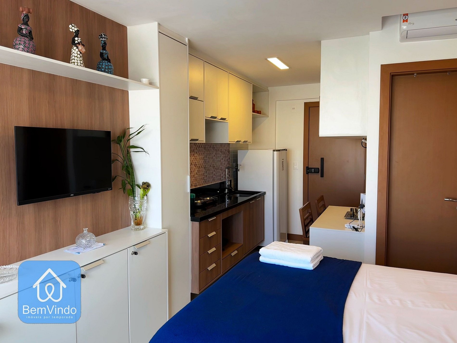 Nosso estúdio completo é decorado com uma iluminação requintada, proporcionando uma atmosfera acolhedora. Acomode-se em uma cama de casal confortável enquanto assiste à TV ou relaxa com o ar-condicionado. A janela panorâmica com cortina blackout garante noites tranquilas e um despertar com uma vista espetacular.