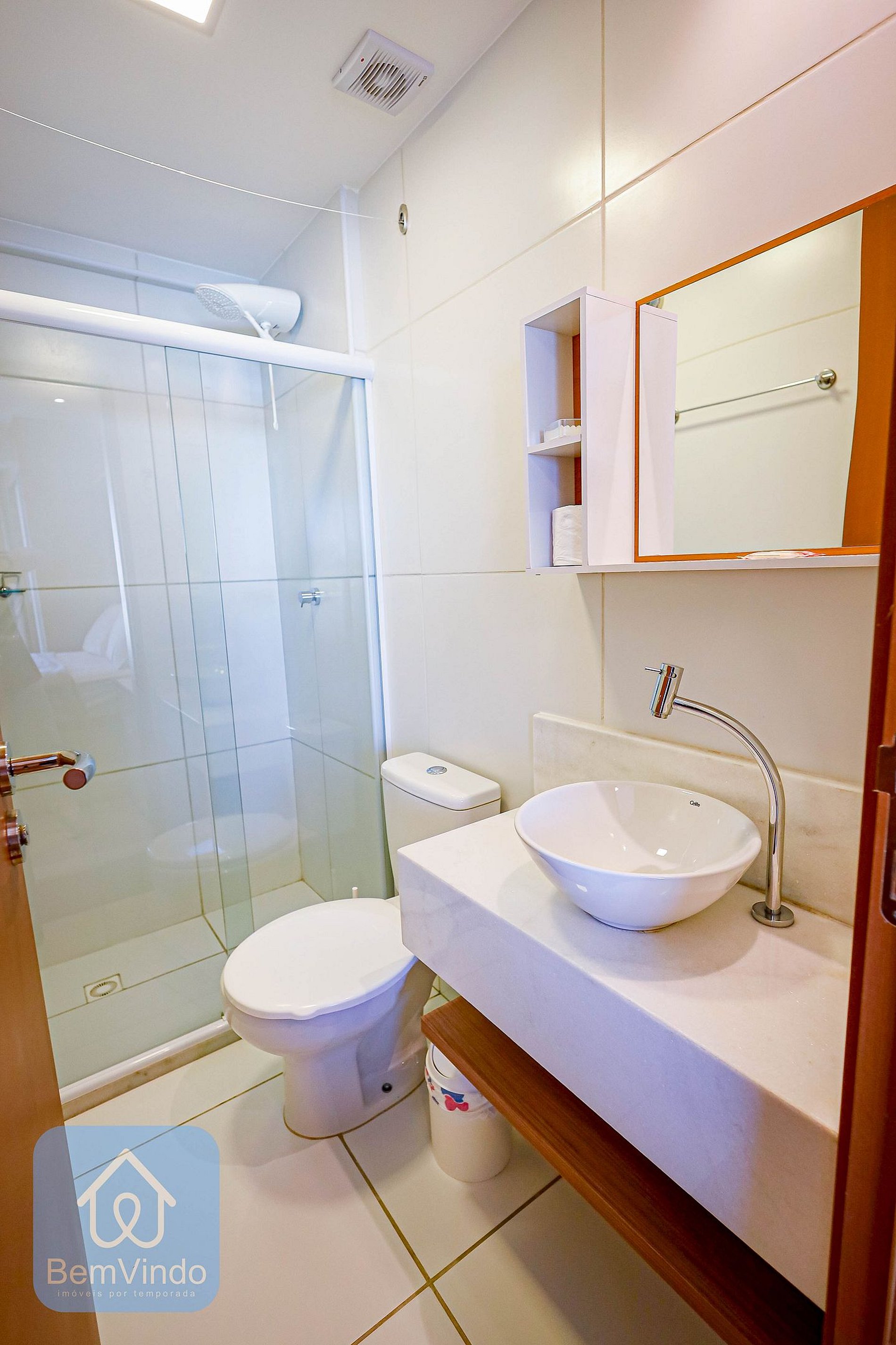 O banheiro é um espaço moderno e aconchegante, projetado para oferecer máximo conforto e praticidade.