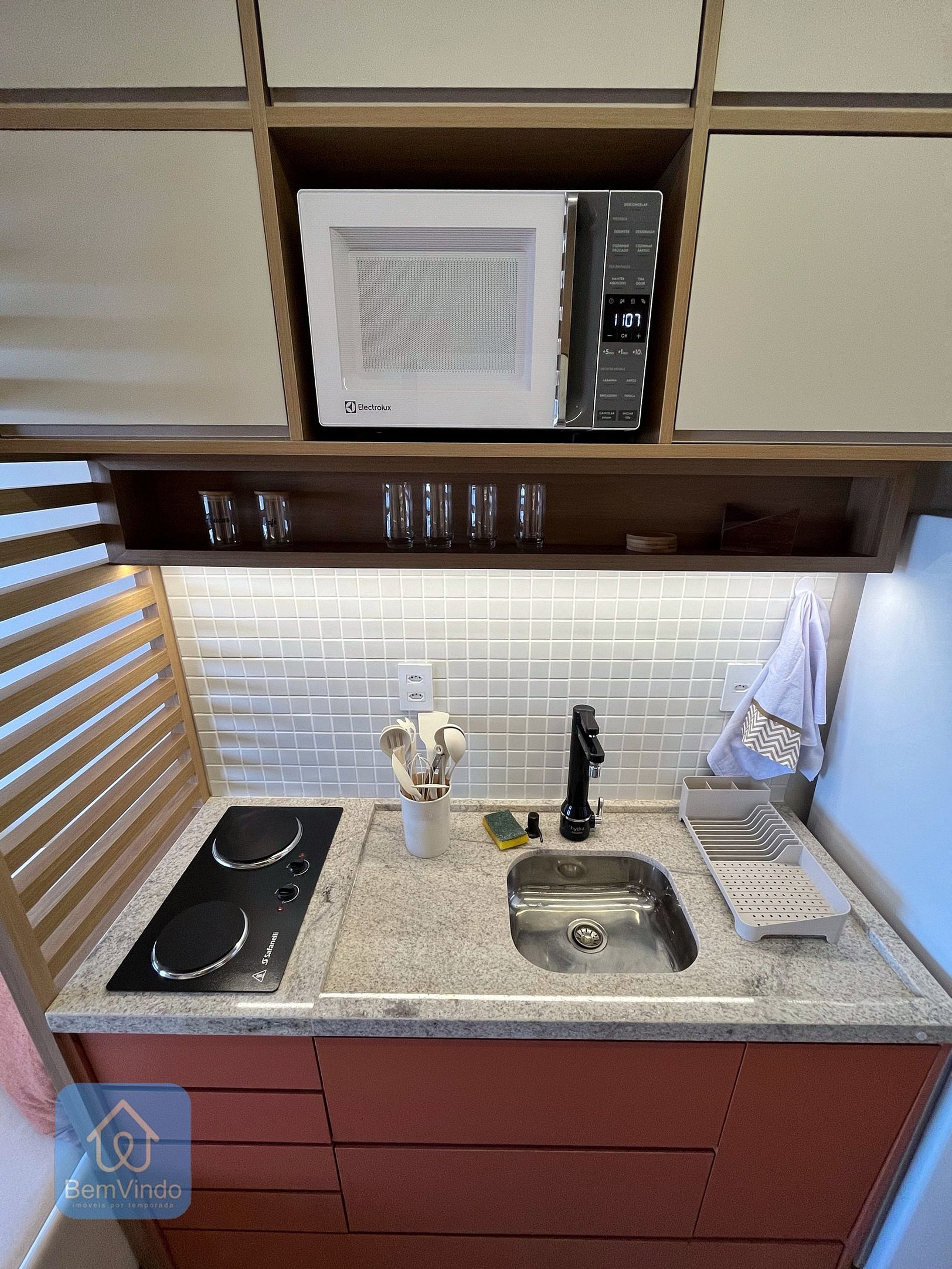 Nossa Cozinha é completa com cooktop, microondas, liquidificador, sanduicheira e todos os equipamentos que você pode precisar para preparar seu alimento. O edíficio ainda possui uma vaga de garagem rotativa por ordem de chegada (Essa informação é importante, pois em caso de lotação não podemos nos responsabilizar);
