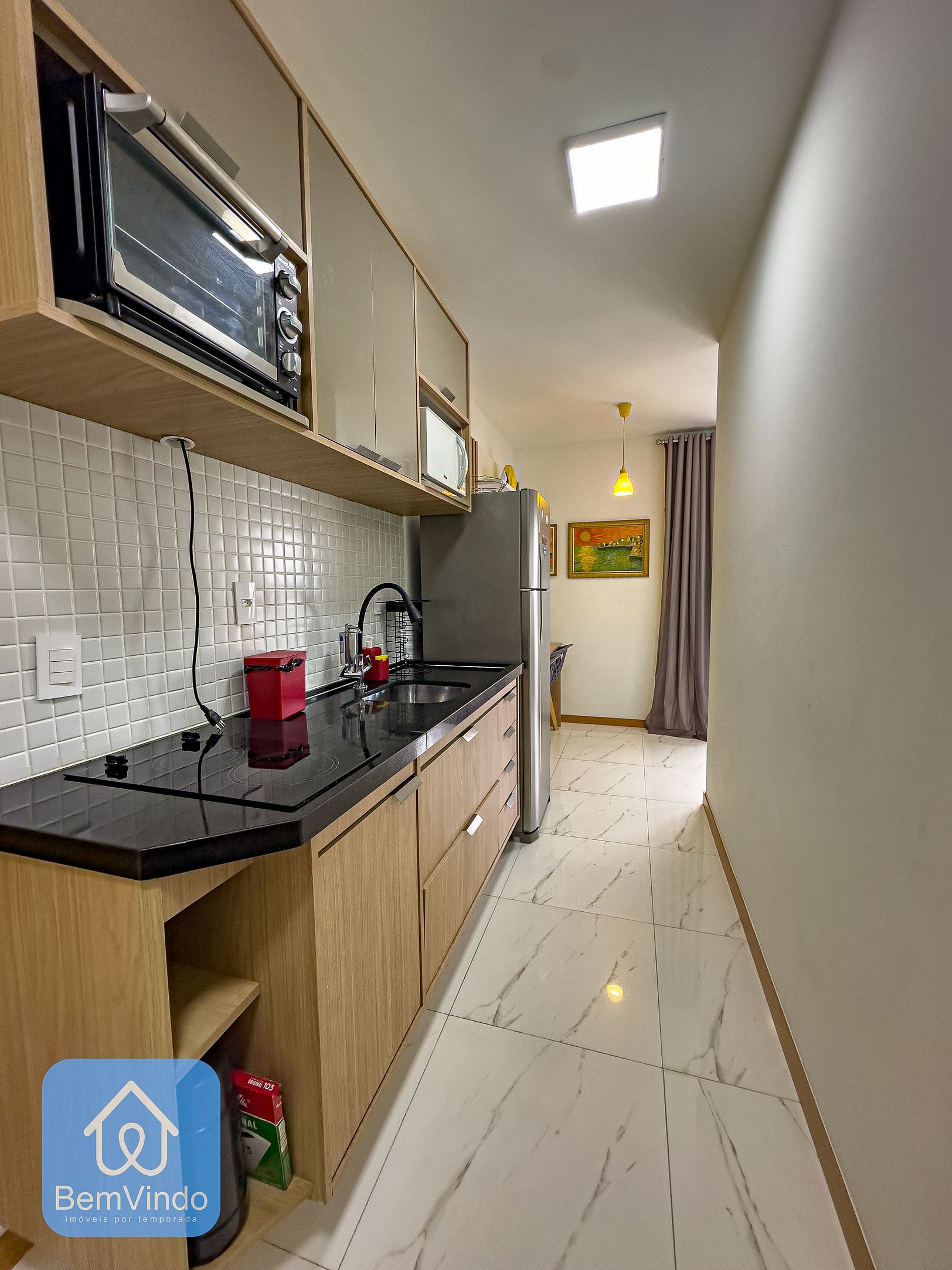 A cozinha é um convite à culinária, com cafeteira, cooktop elétrico, micro-ondas, forno elétrico geladeira, utensílios de cozinha, panelas, frigideira, liquidificador, sanduicheira e talheres. Tudo que você precisa para preparar suas refeições e aproveitar ao máximo sua estadia.