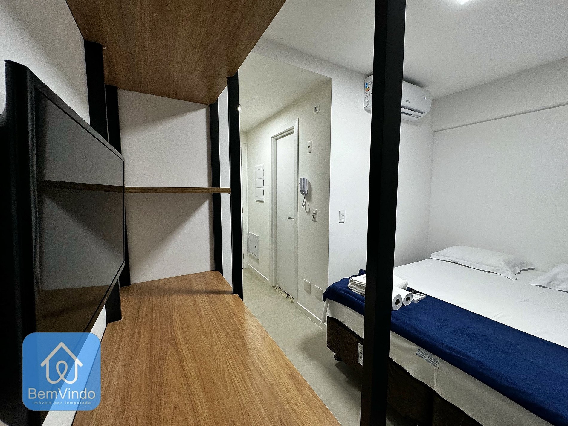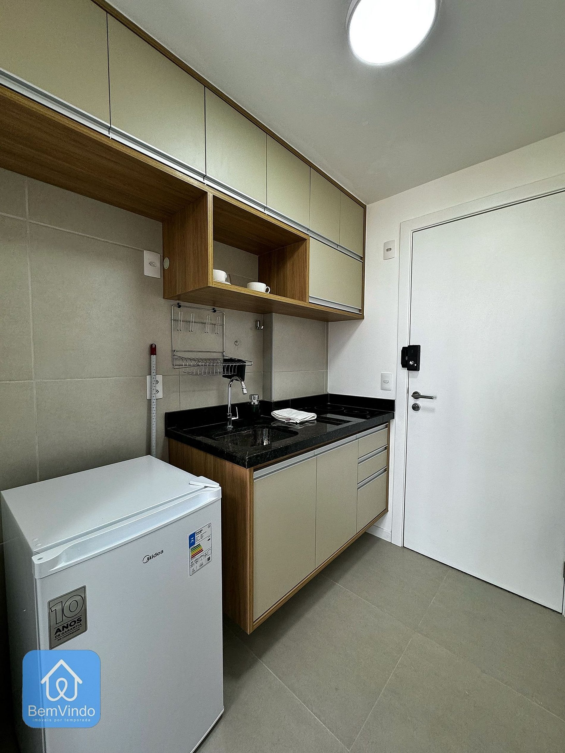A cozinha, compacta e eficiente, vem equipada com um cooktop elétrico, micro-ondas, geladeira e todos os utensílios necessários para preparar refeições deliciosas durante sua estadia. O banheiro do estúdio é outro destaque, oferecendo um espaço confortável com um chuveiro grande e um espelho com iluminação embutida, garantindo praticidade e um toque de sofisticação.