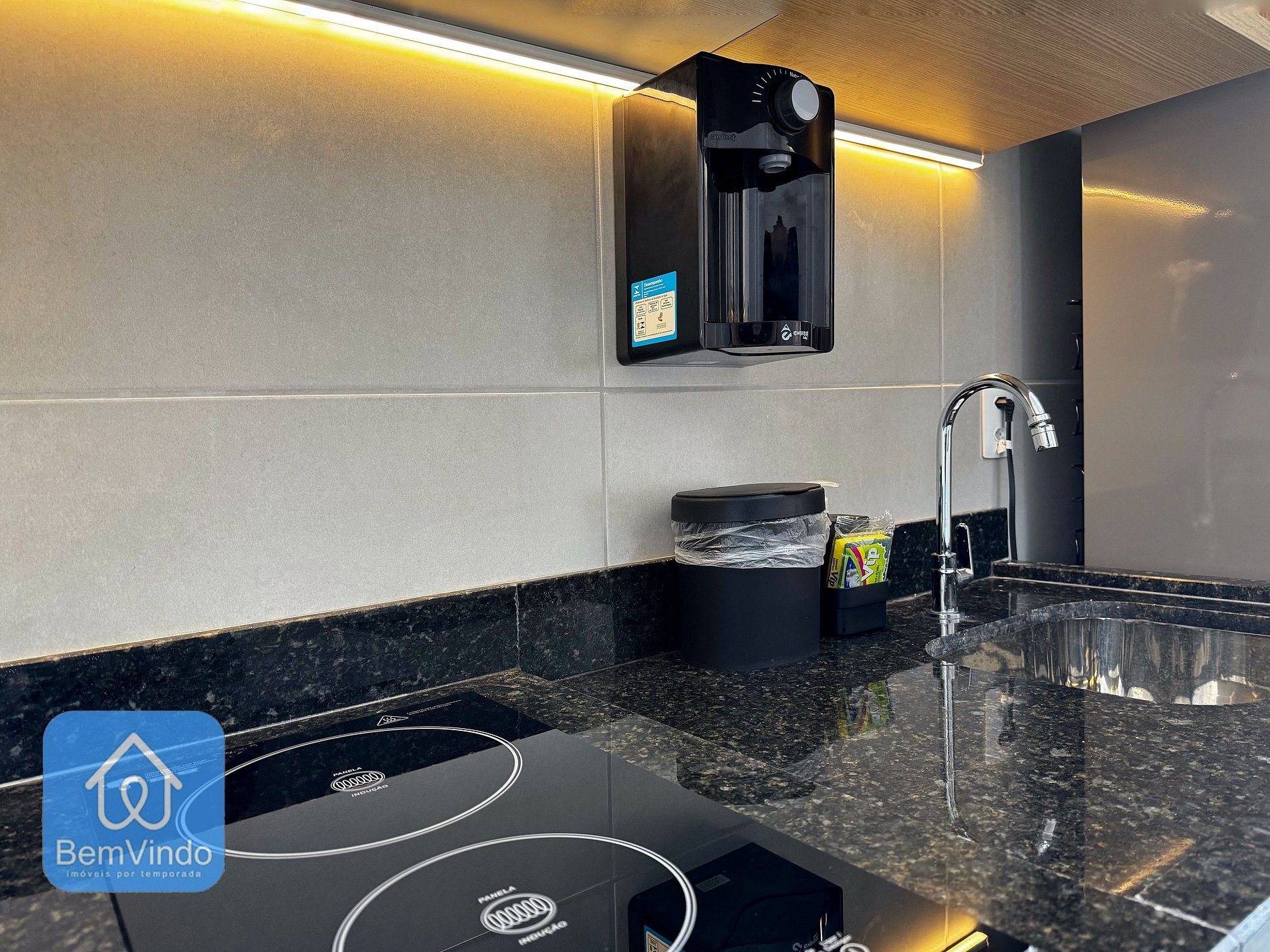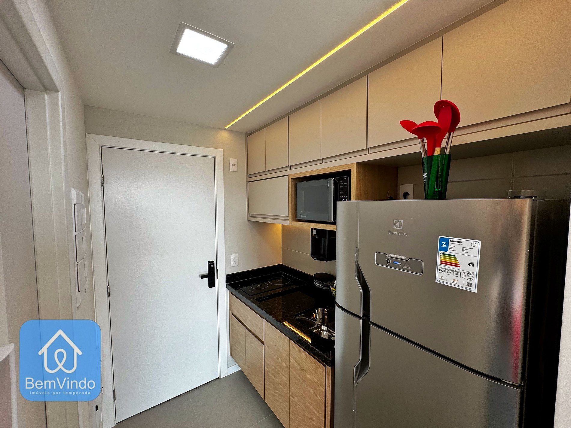 A cozinha, compacta e eficiente, vem equipada com um cooktop elétrico, micro-ondas, geladeira e todos os utensílios necessários para preparar refeições deliciosas. O banheiro do estúdio também é um destaque, oferecendo um espaço confortável com um chuveiro grande e um espelho com iluminação embutida, garantindo praticidade e um toque de sofisticação.