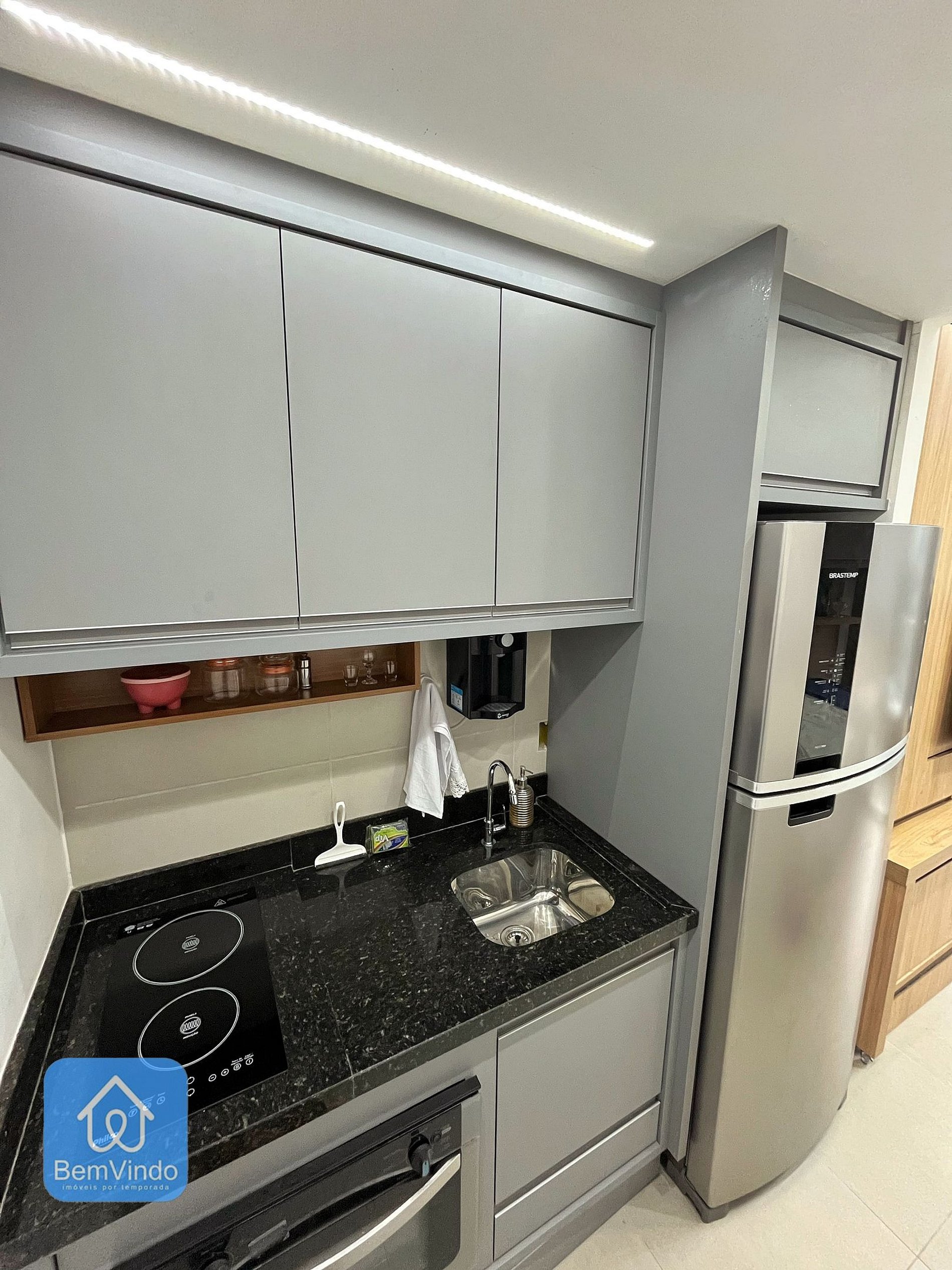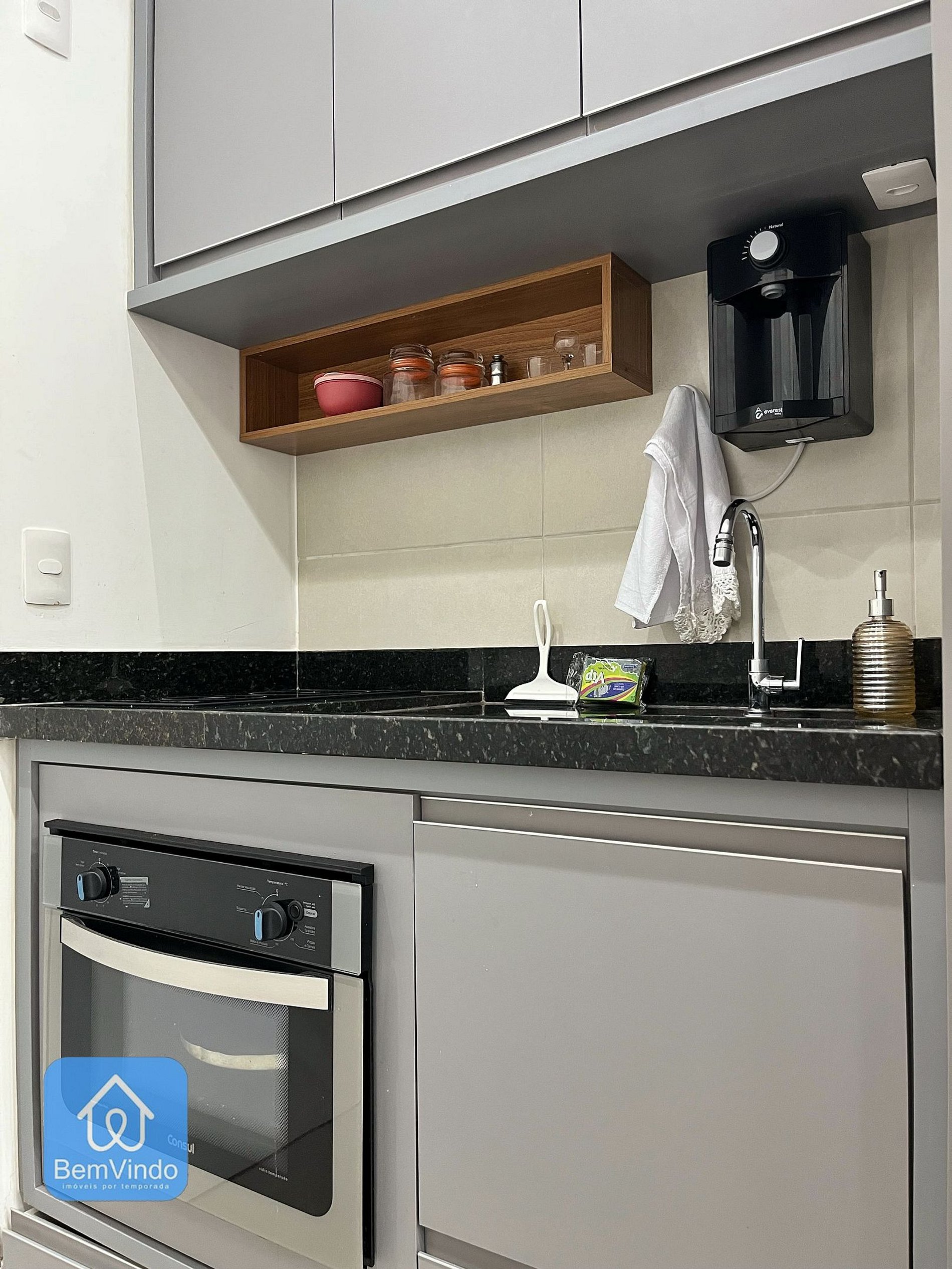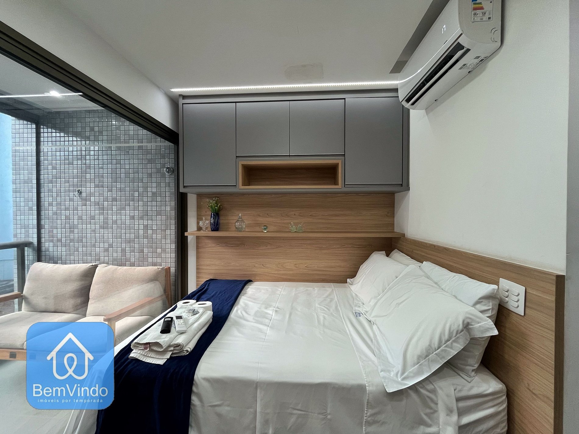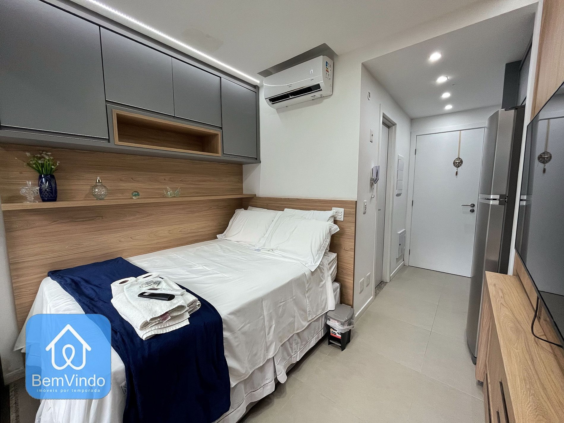 A cozinha, compacta e eficiente, vem equipada com um cooktop elétrico, micro-ondas, geladeira e todos os utensílios necessários para preparar refeições deliciosas durante sua estadia. O banheiro do estúdio é outro destaque, oferecendo um espaço confortável com um chuveiro grande e um espelho com iluminação embutida, garantindo praticidade e um toque de sofisticação.