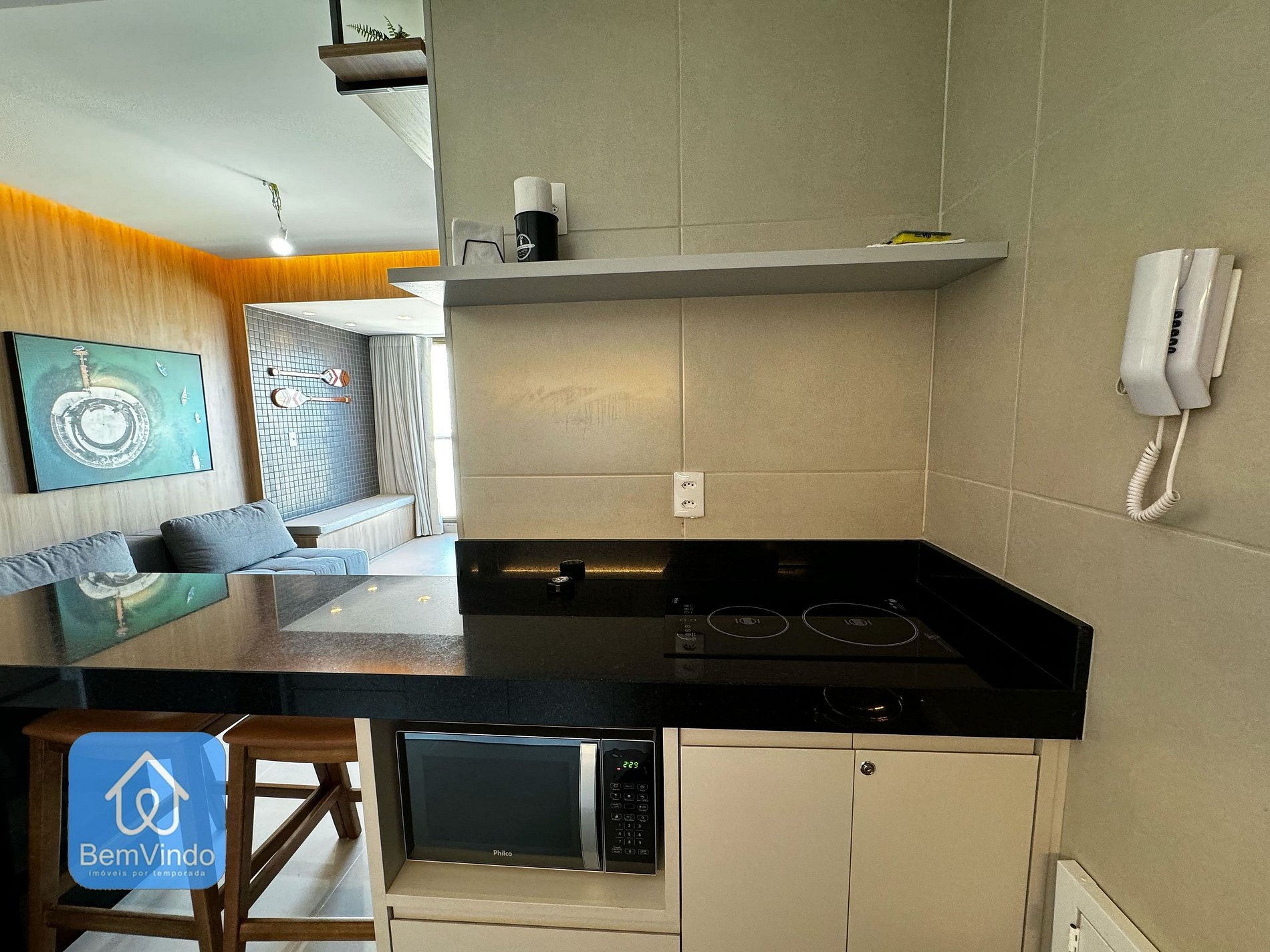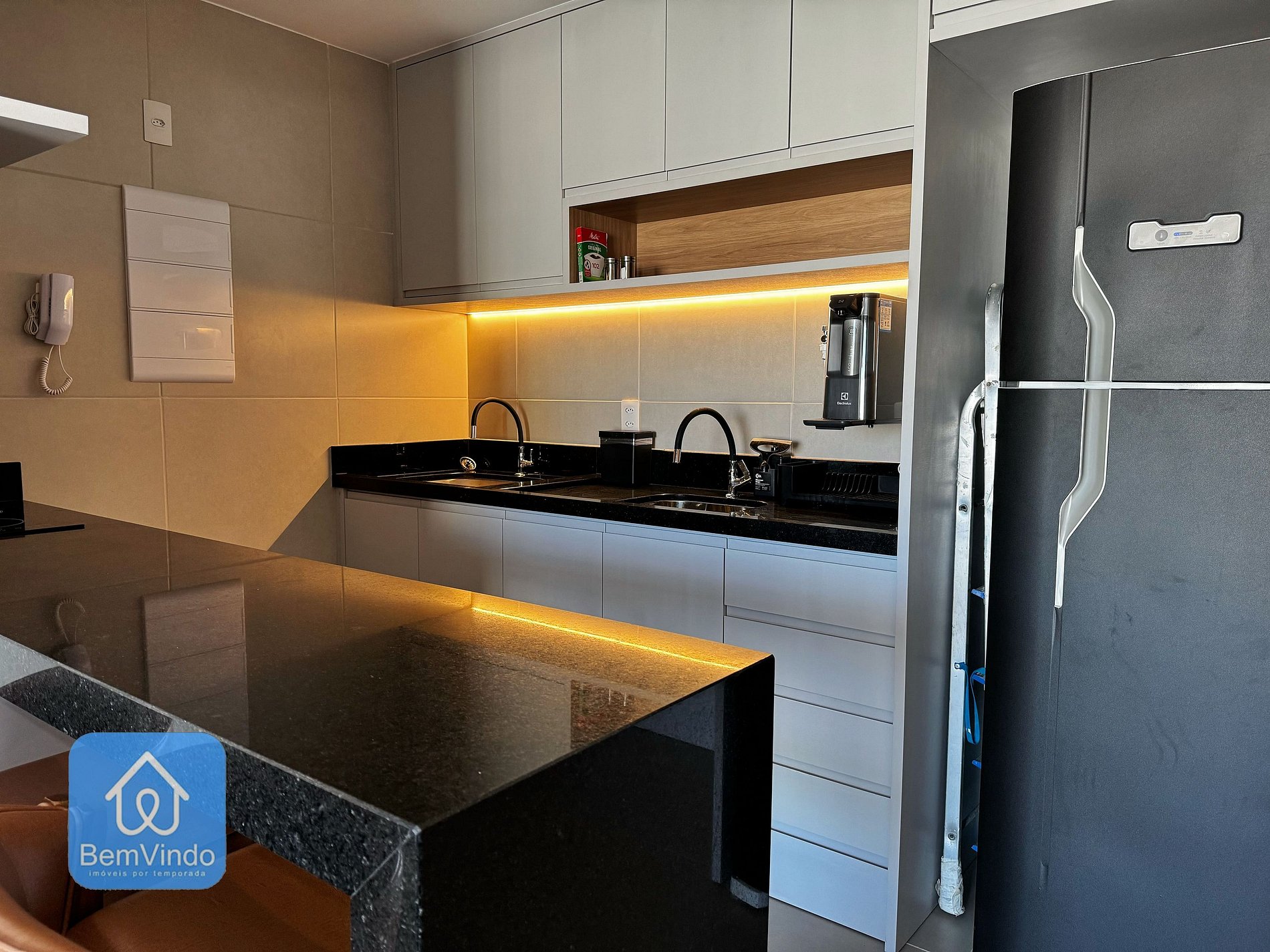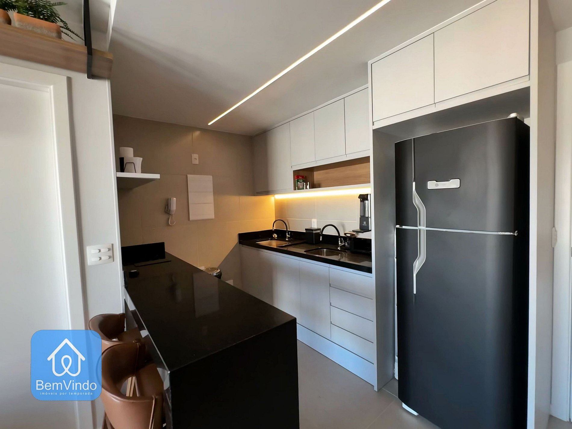 A cozinha prática e completa está equipada com cooktop elétrico, micro-ondas, geladeira, cafeteira, liquidificador, sanduicheira e todos os utensílios necessários para preparar refeições com conforto e praticidade.