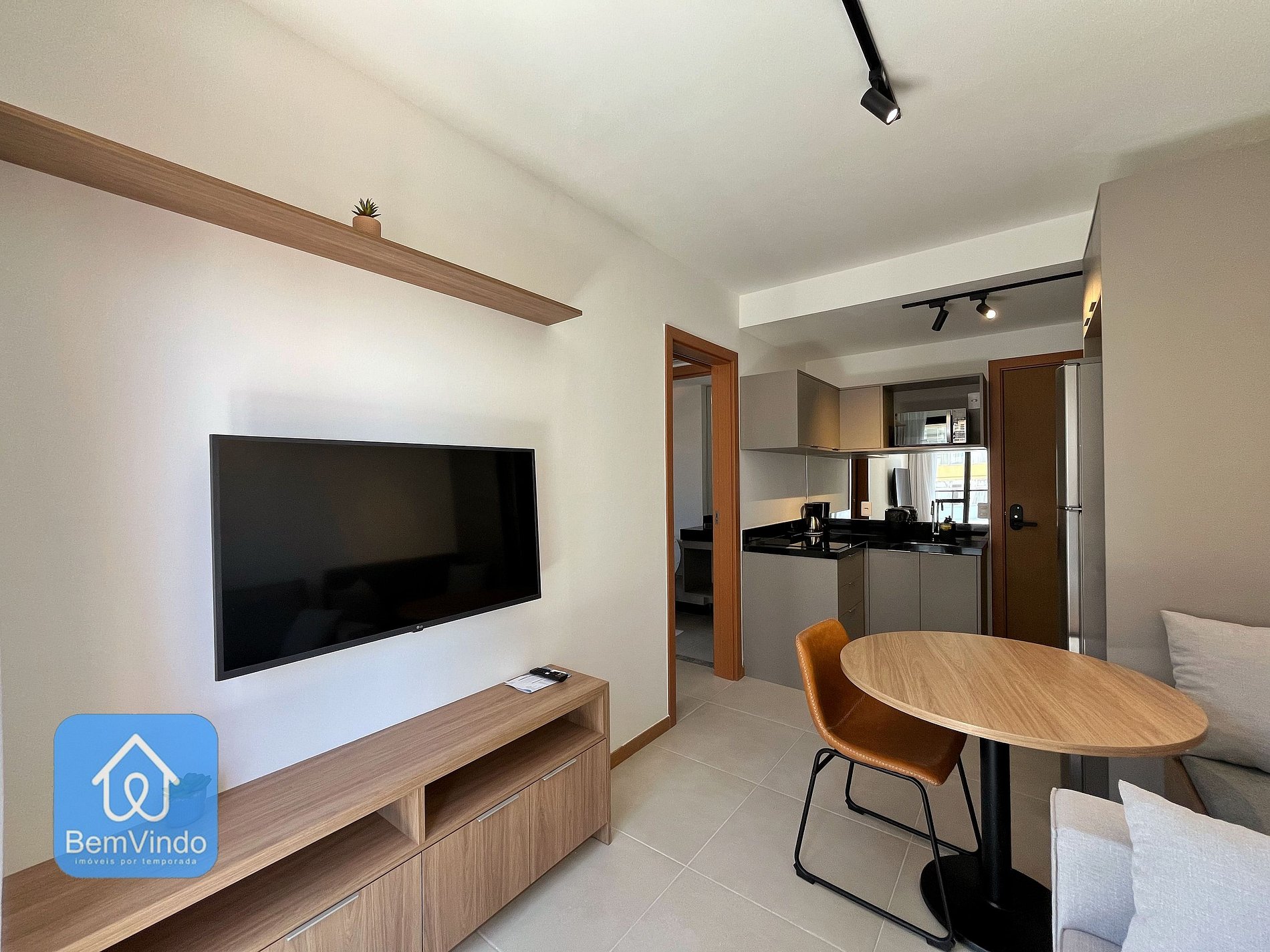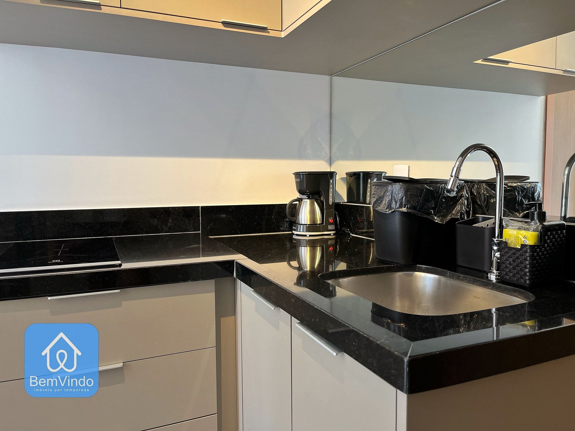 Sala de Estar e Cozinha Integrada: Com um ambiente acolhedor e bem iluminado, a sala está equipada com mesa e cadeiras para refeições, integrando-se à cozinha completa com fogão cooktop, micro-ondas, geladeira, cafeteira e todos os utensílios necessários.