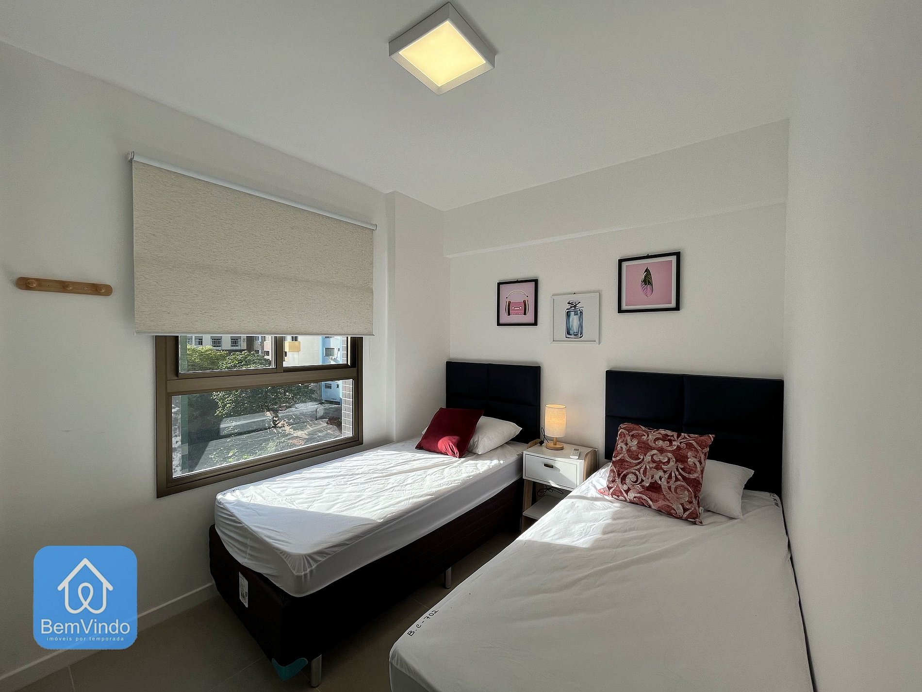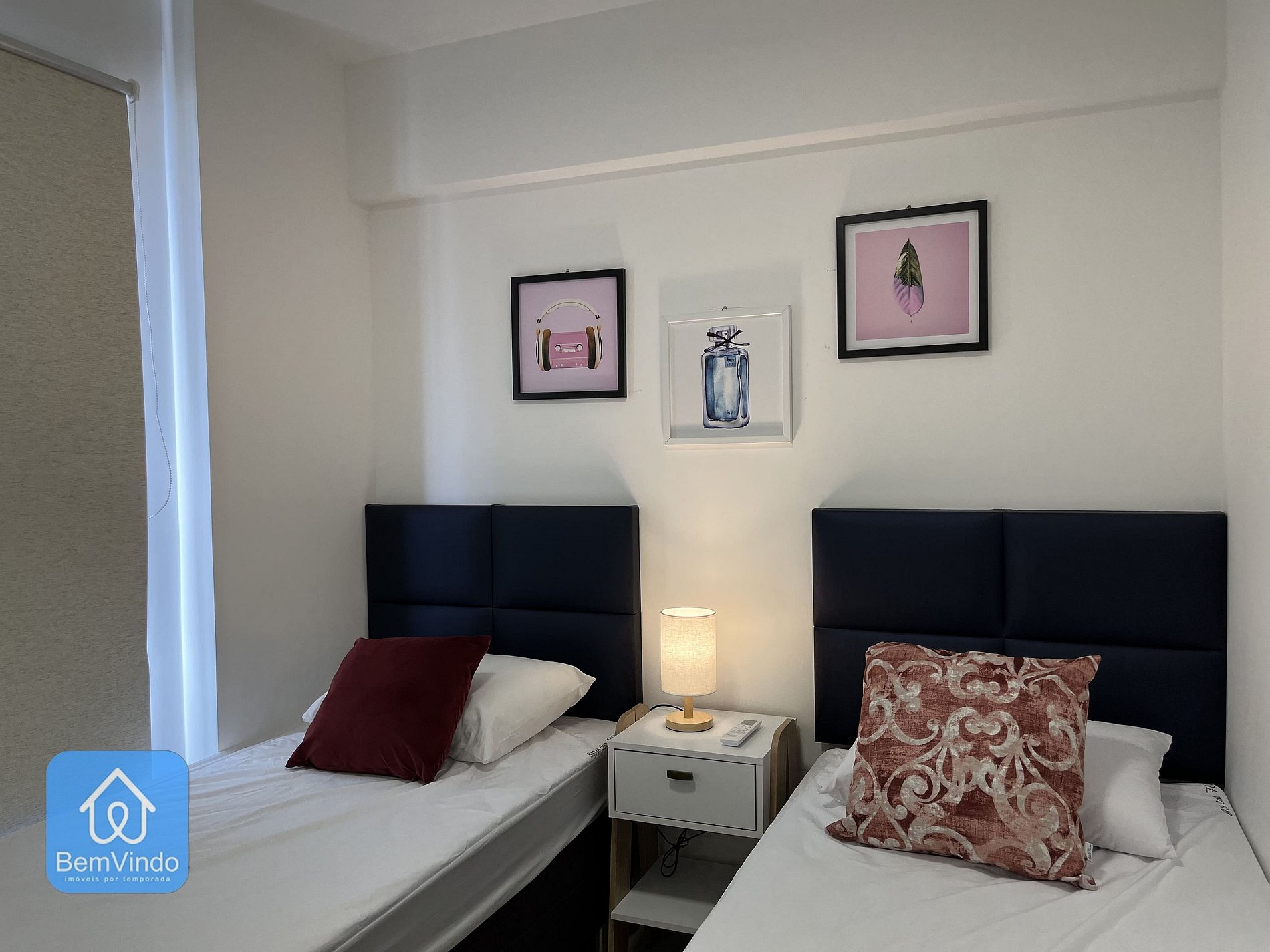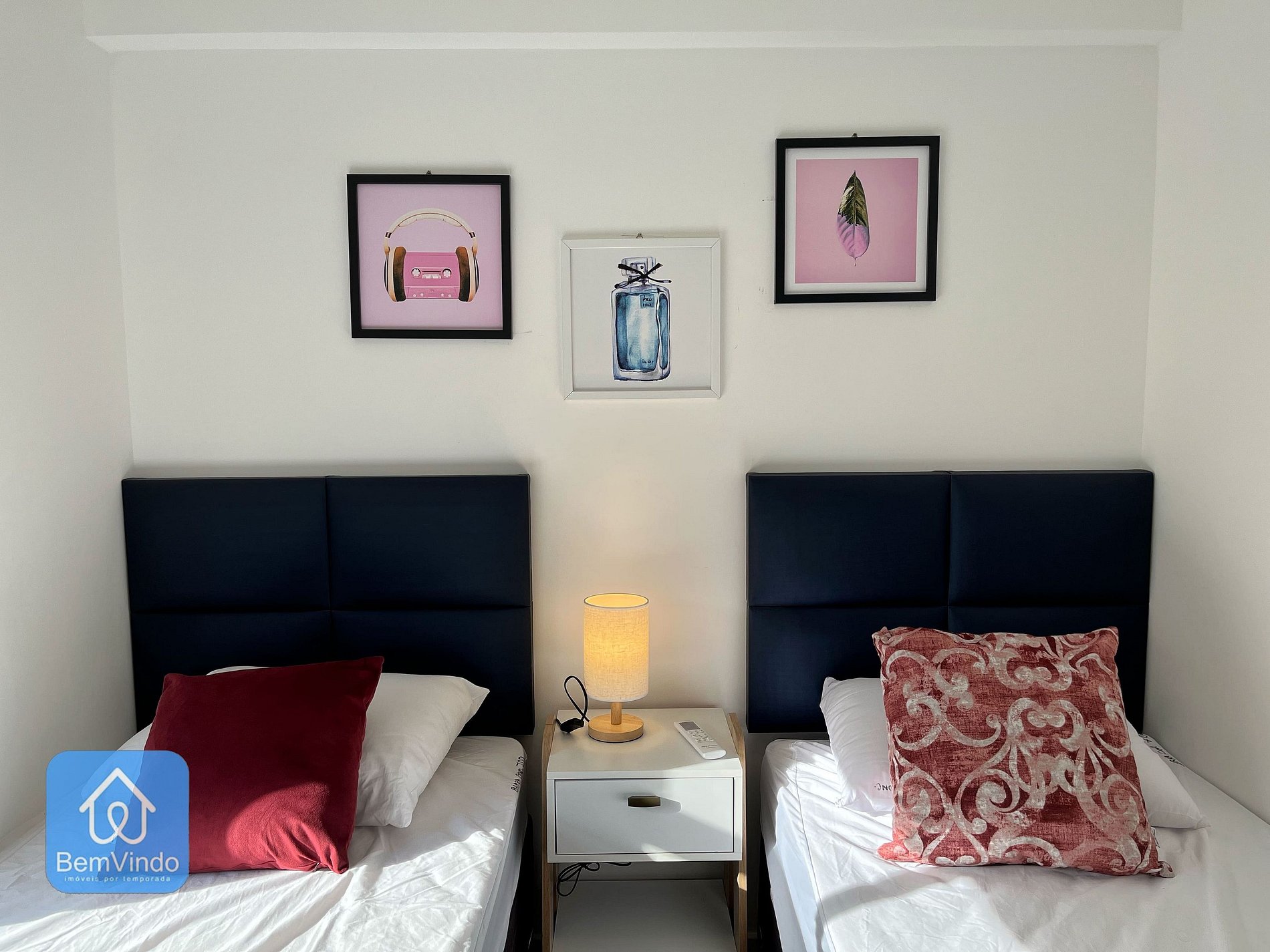 Segundo Quarto e Banheiro: O segundo quarto dispõe de duas camas de solteiro, guarda-roupas e cortina blackout, perfeito para o descanso dos hóspedes. O apartamento possui também um segundo banheiro confortável e com espelho.