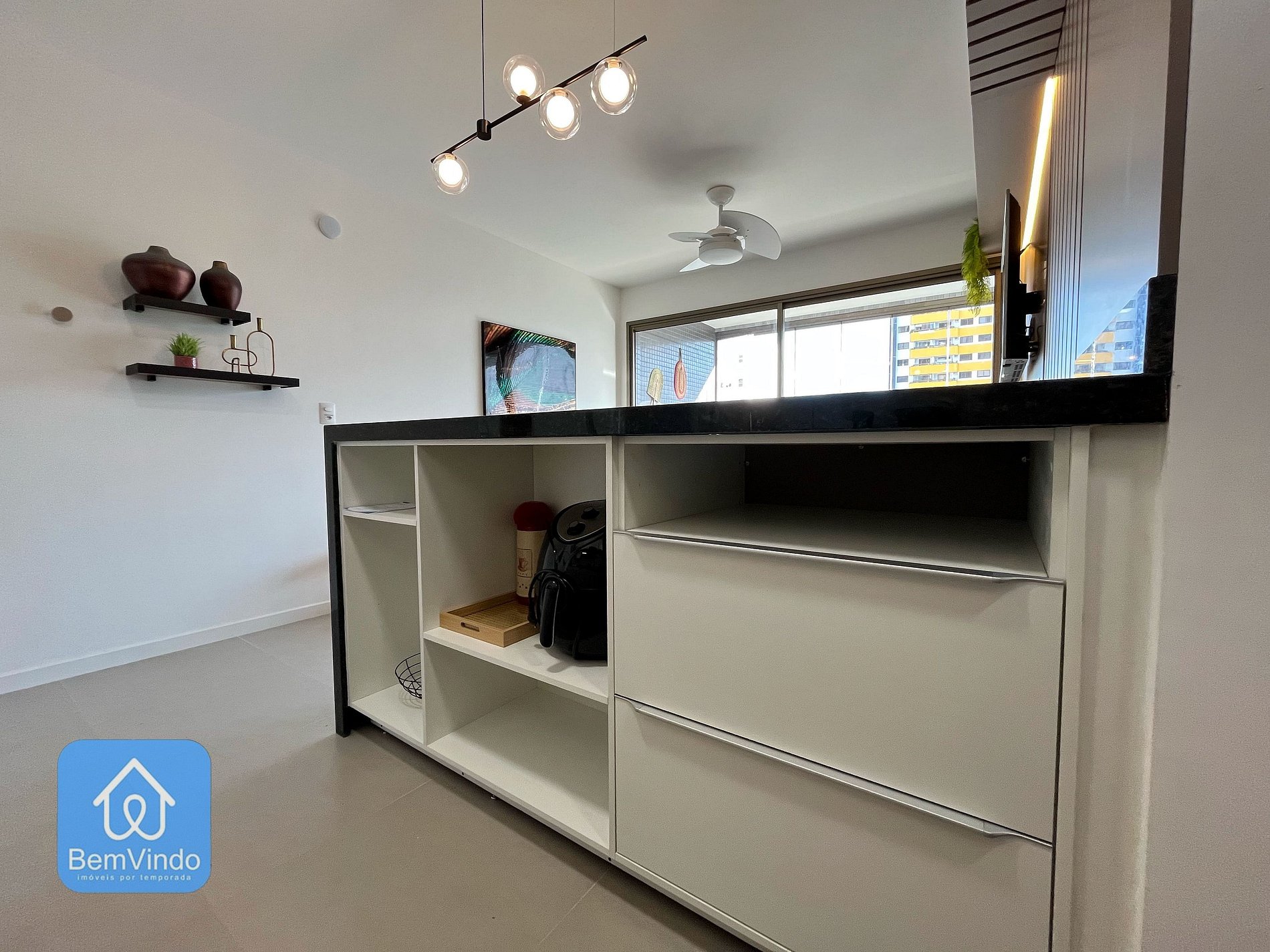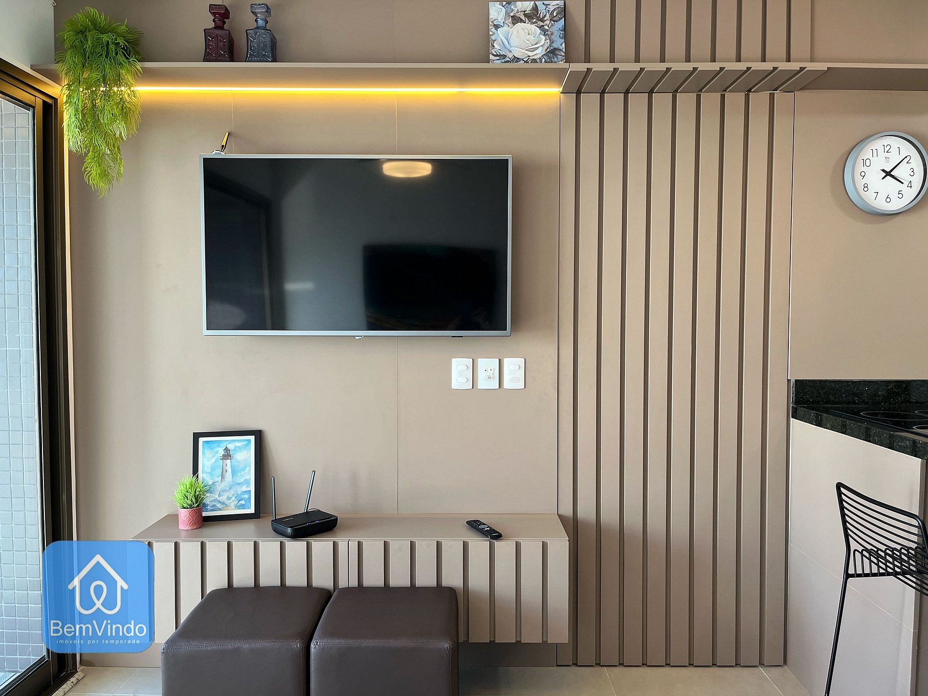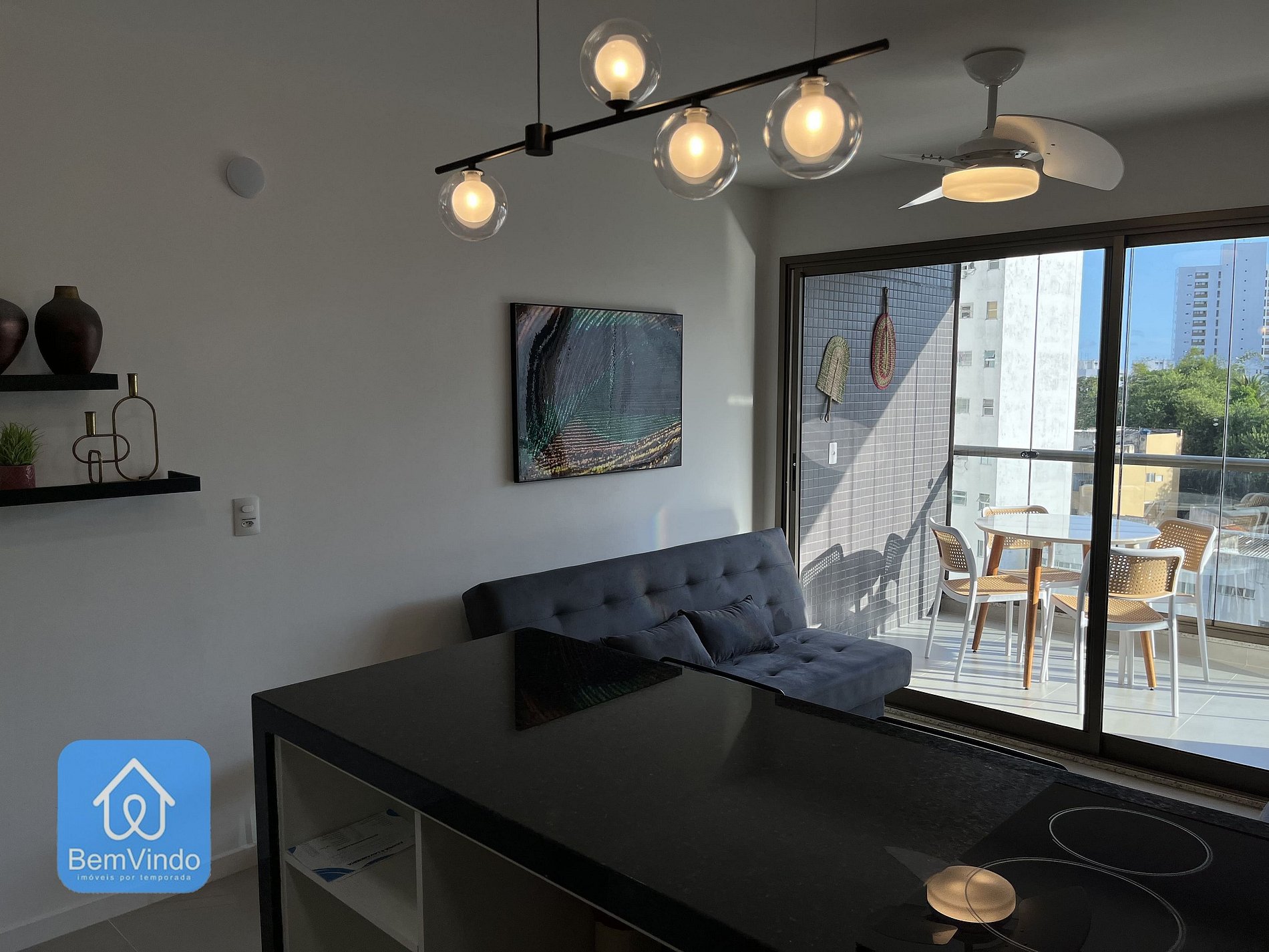 Sala e Varanda: A sala possui um sofá confortável, Smart TV para entretenimento, além de ser integrada à cozinha e à varanda espaçosa, onde você encontra uma mesa com cadeiras e uma vista agradável para o bairro da Barra.