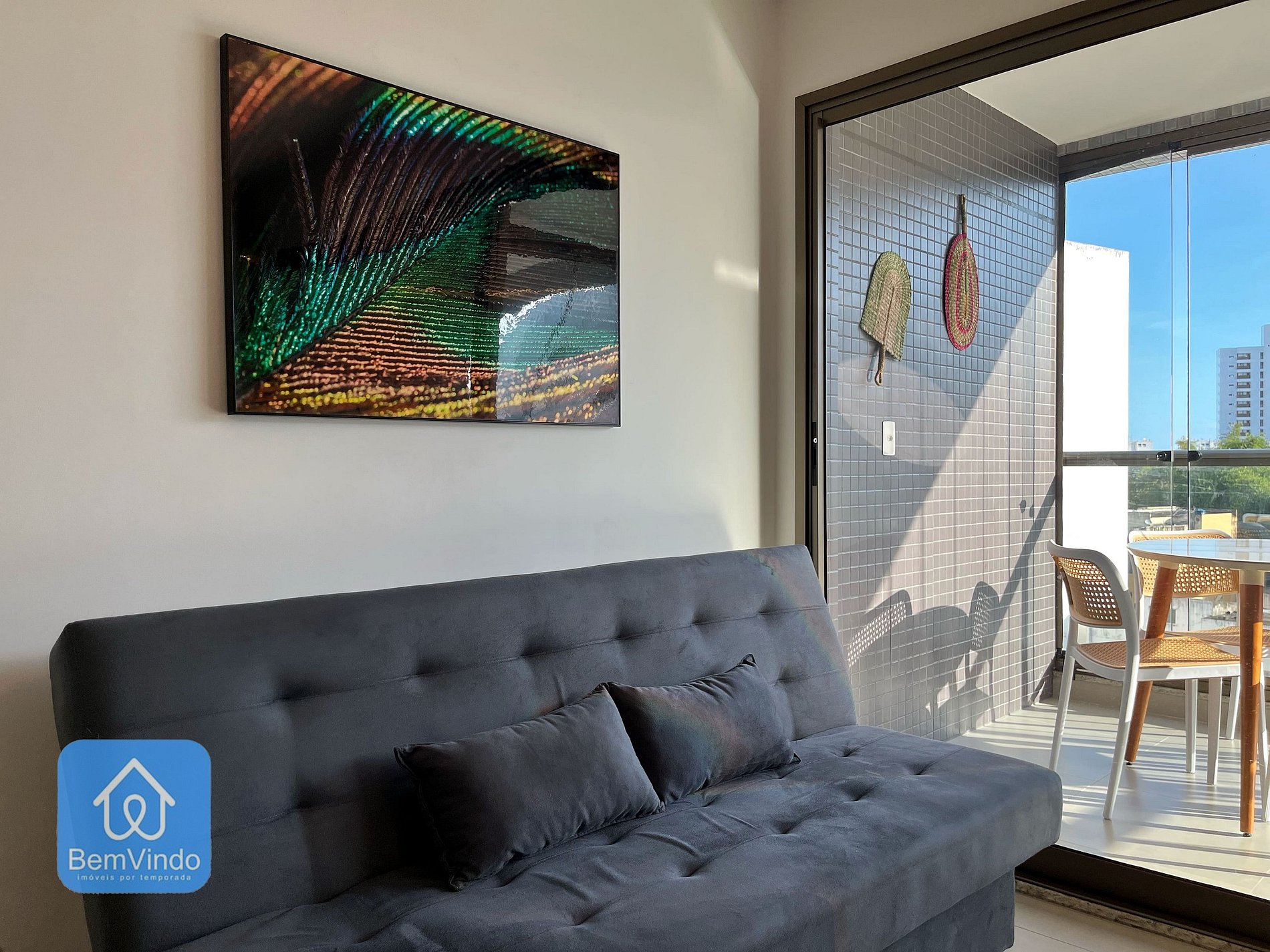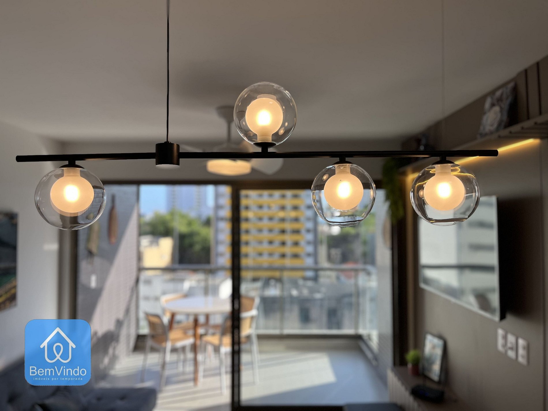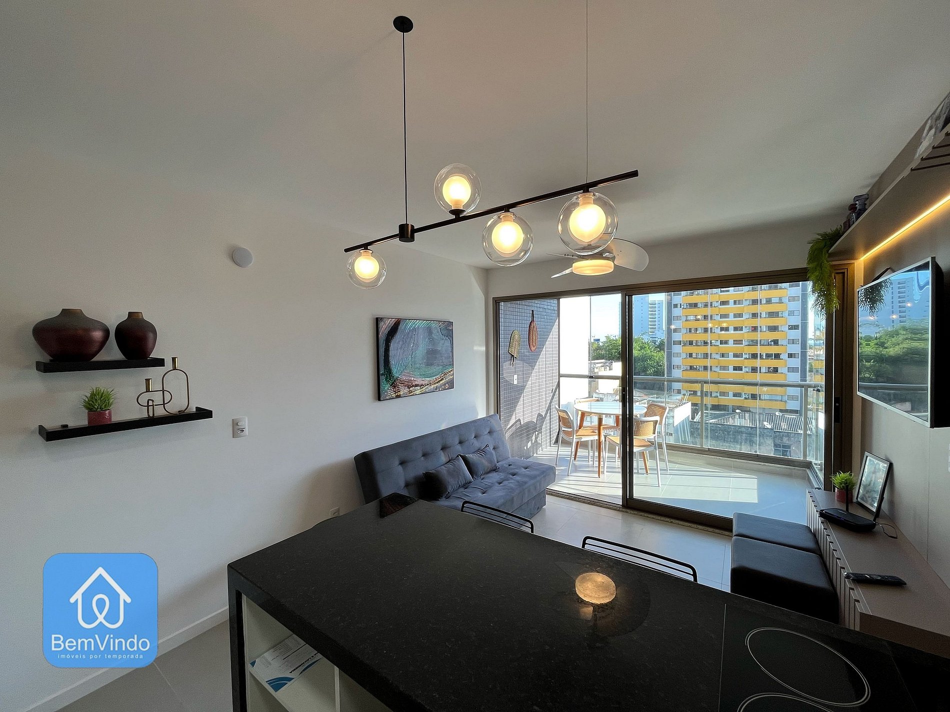 Sala e Varanda: A sala possui um sofá confortável, Smart TV para entretenimento, além de ser integrada à cozinha e à varanda espaçosa, onde você encontra uma mesa com cadeiras e uma vista agradável para o bairro da Barra.