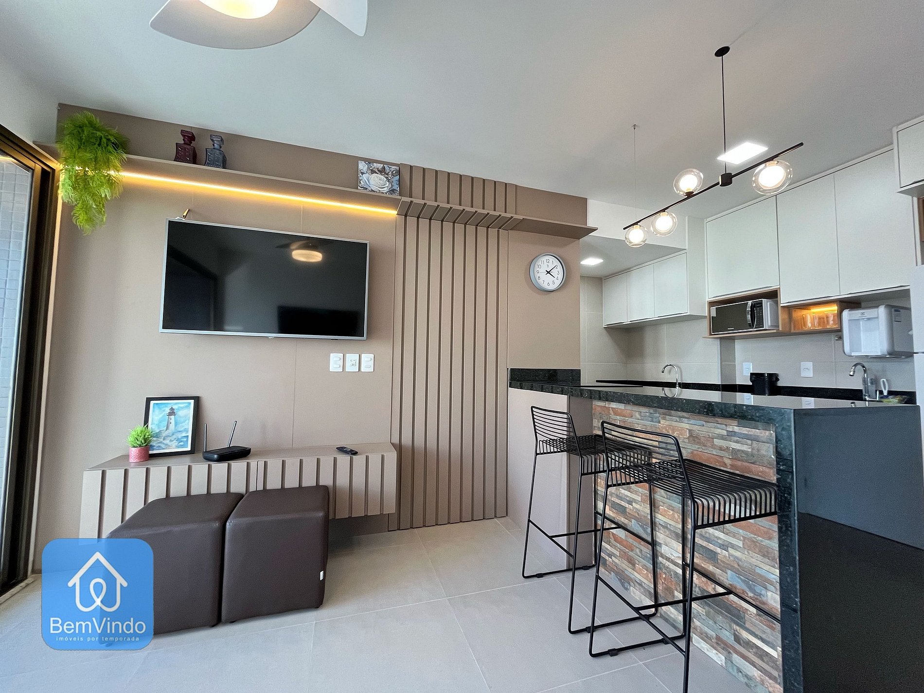 Sala e Varanda: A sala possui um sofá confortável, Smart TV para entretenimento, além de ser integrada à cozinha e à varanda espaçosa, onde você encontra uma mesa com cadeiras e uma vista agradável para o bairro da Barra.