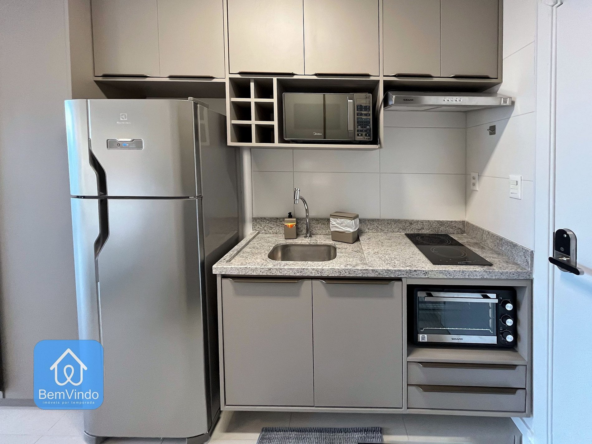 • Fogão cooktop, micro-ondas, forno e geladeira.