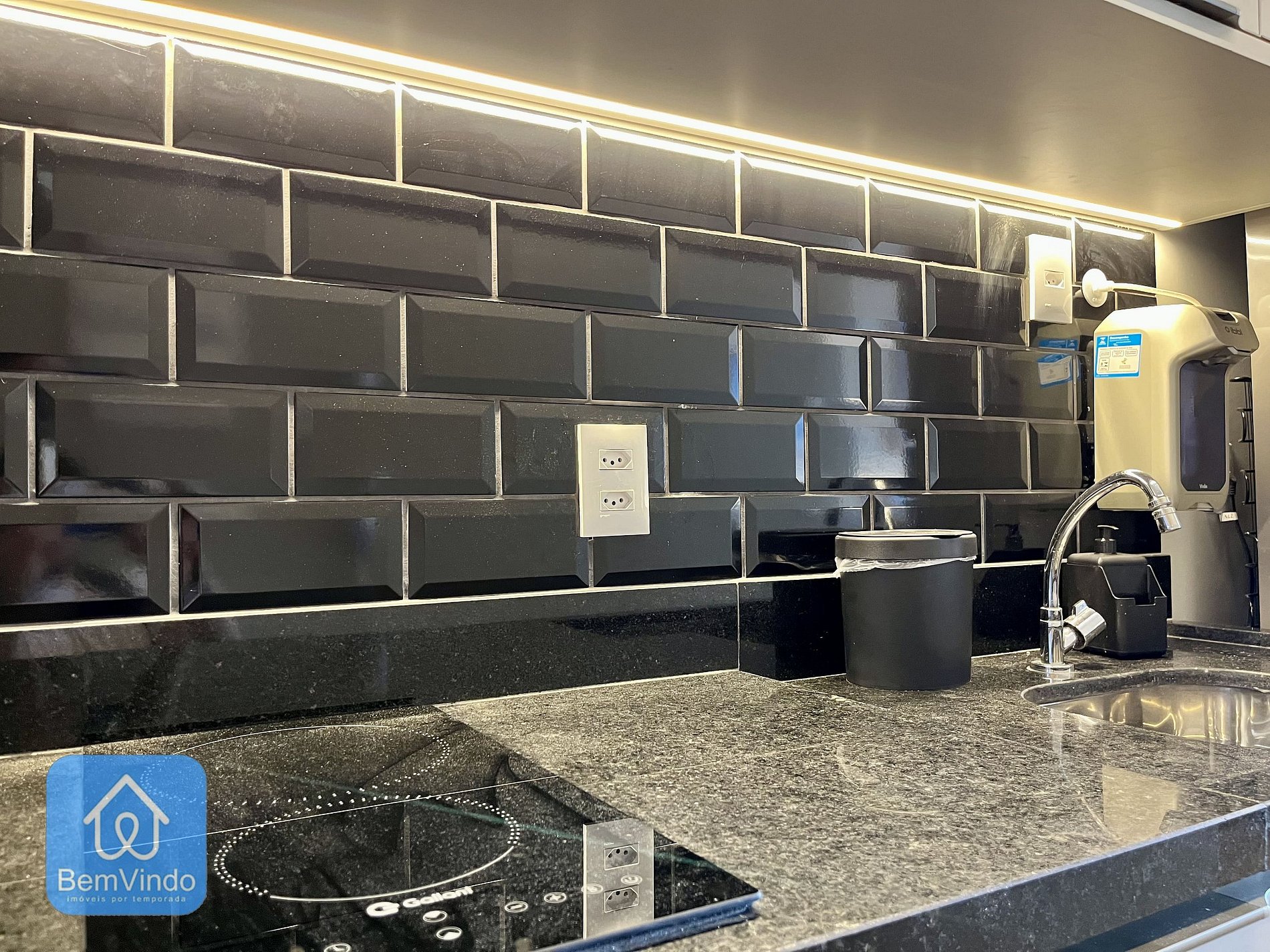 Fogão cooktop, micro-ondas e geladeira.