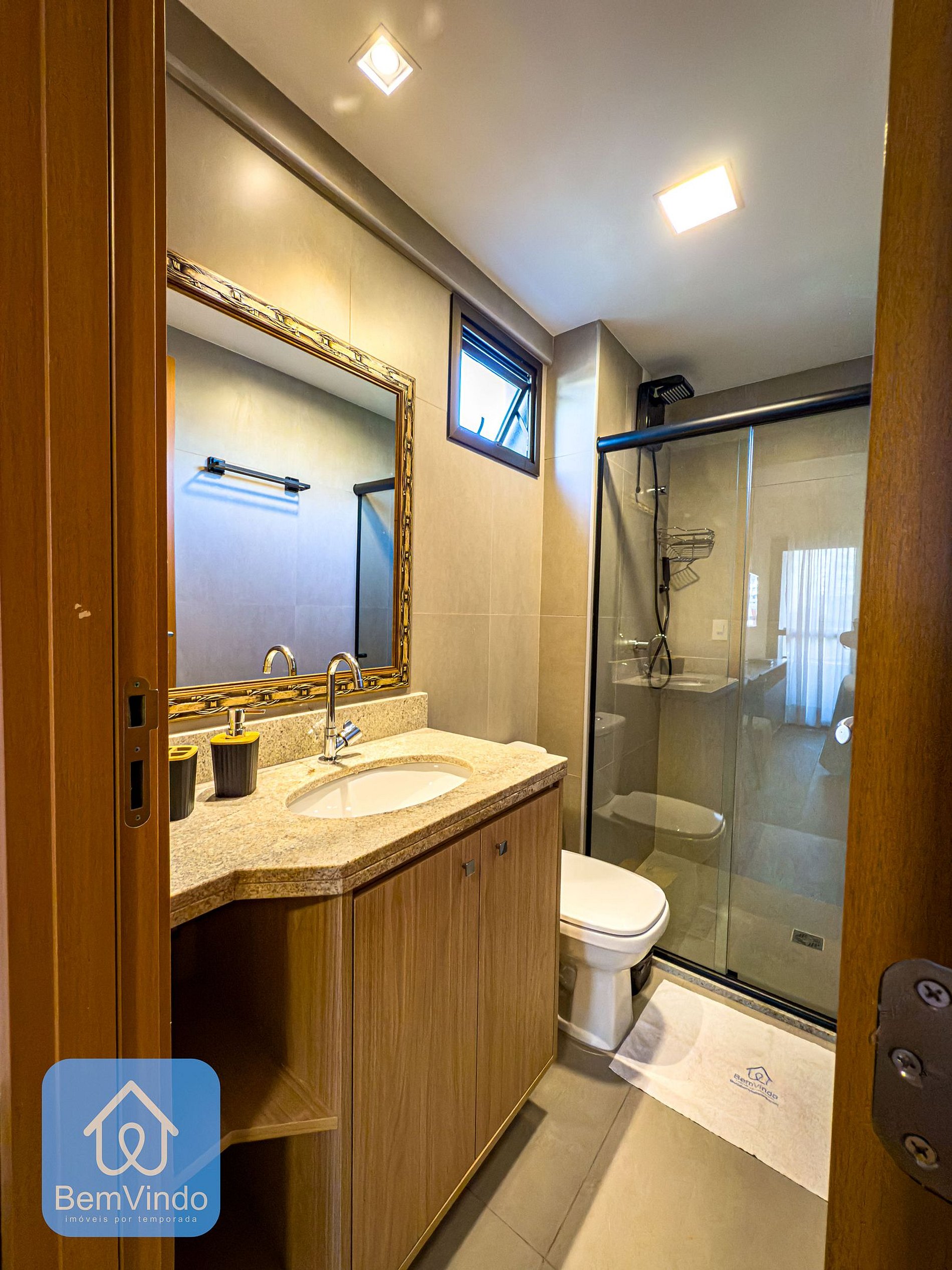 O banheiro é amplo e confortável, com todos os itens essenciais para uma estadia agradável.