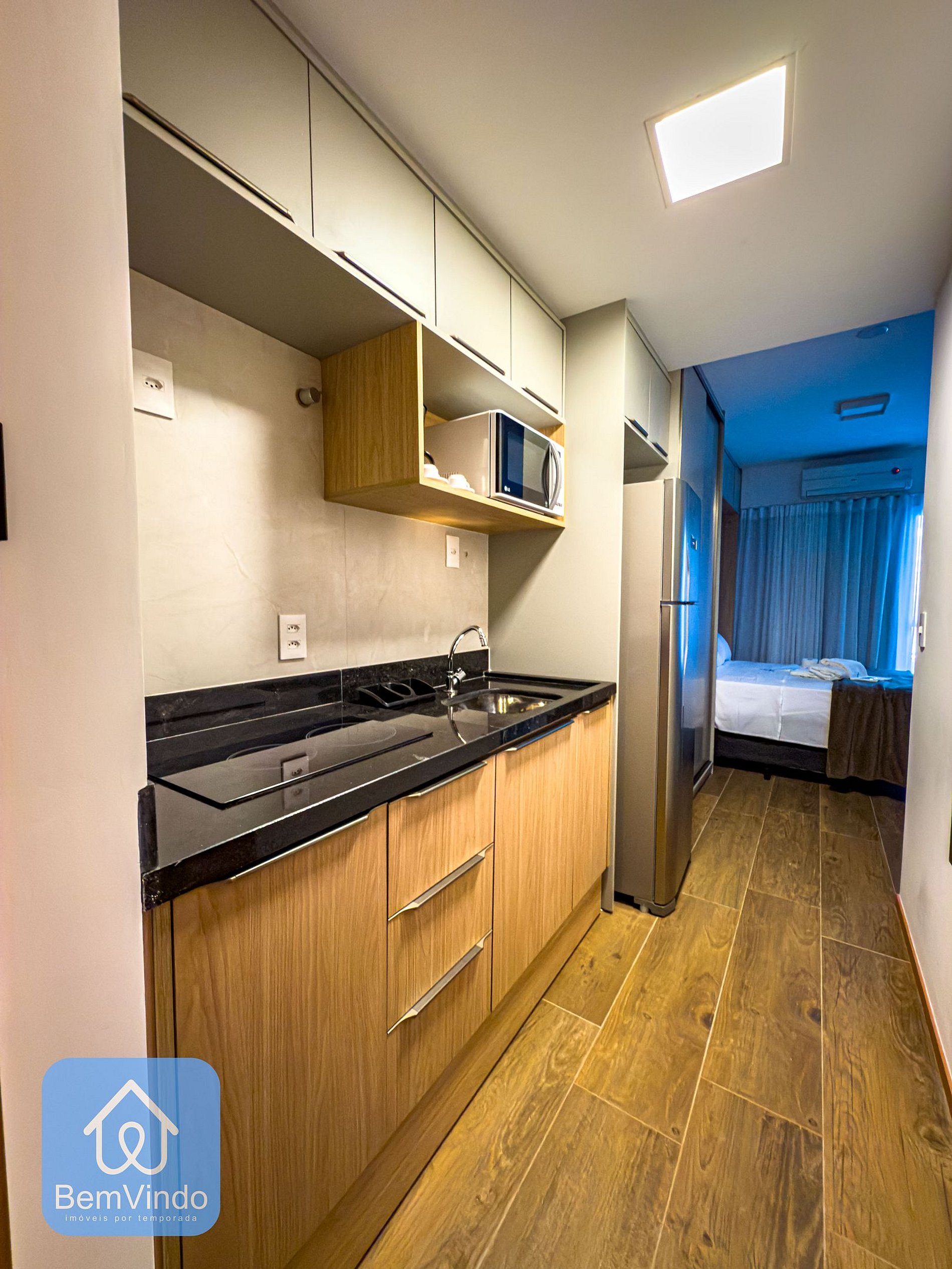A cozinha é completa, oferecendo: Fogão cooktop, micro-ondas e geladeira. Todos os utensílios necessários para preparar suas refeições com praticidade (panelas, pratos, talheres, etc.).