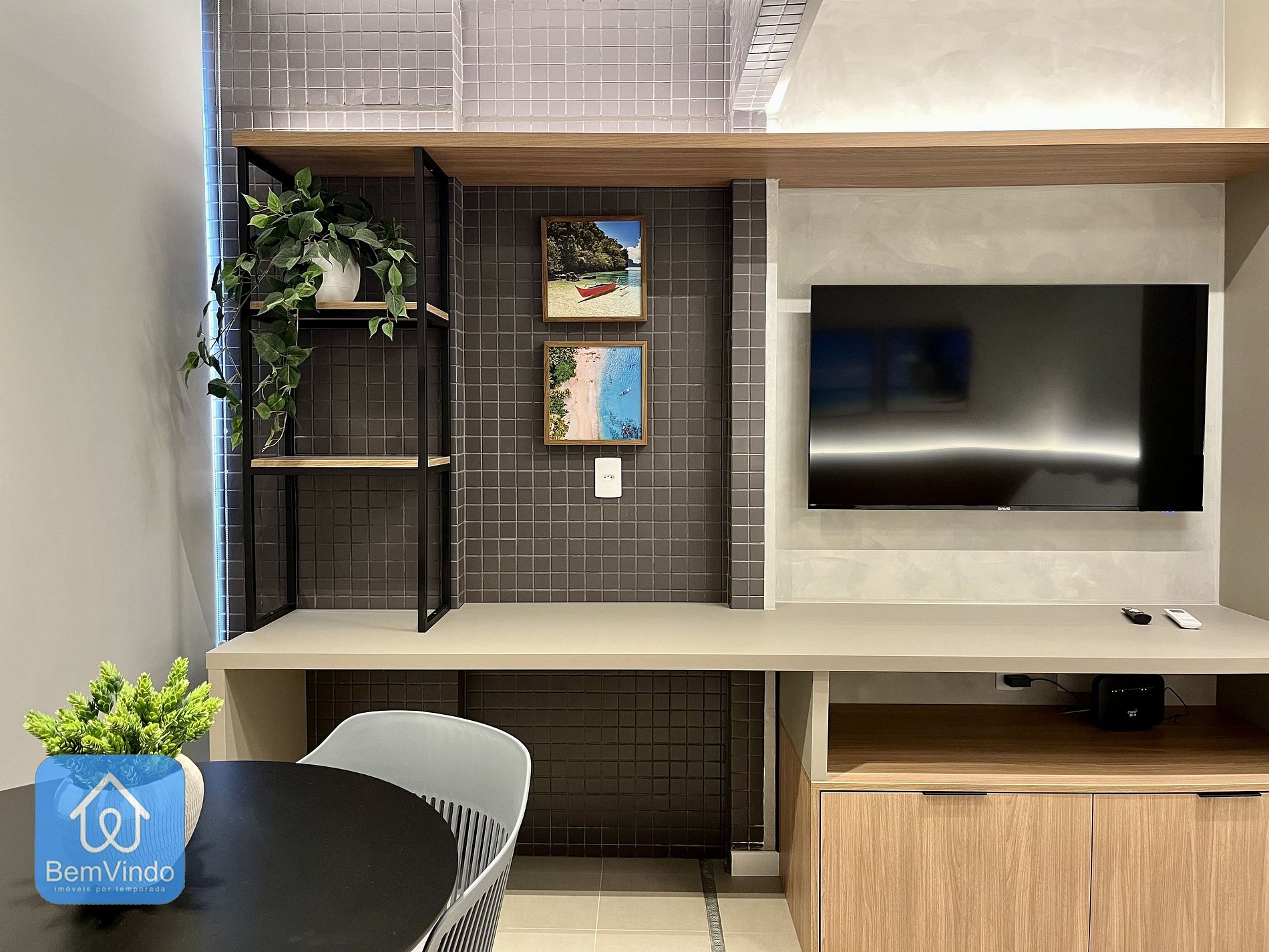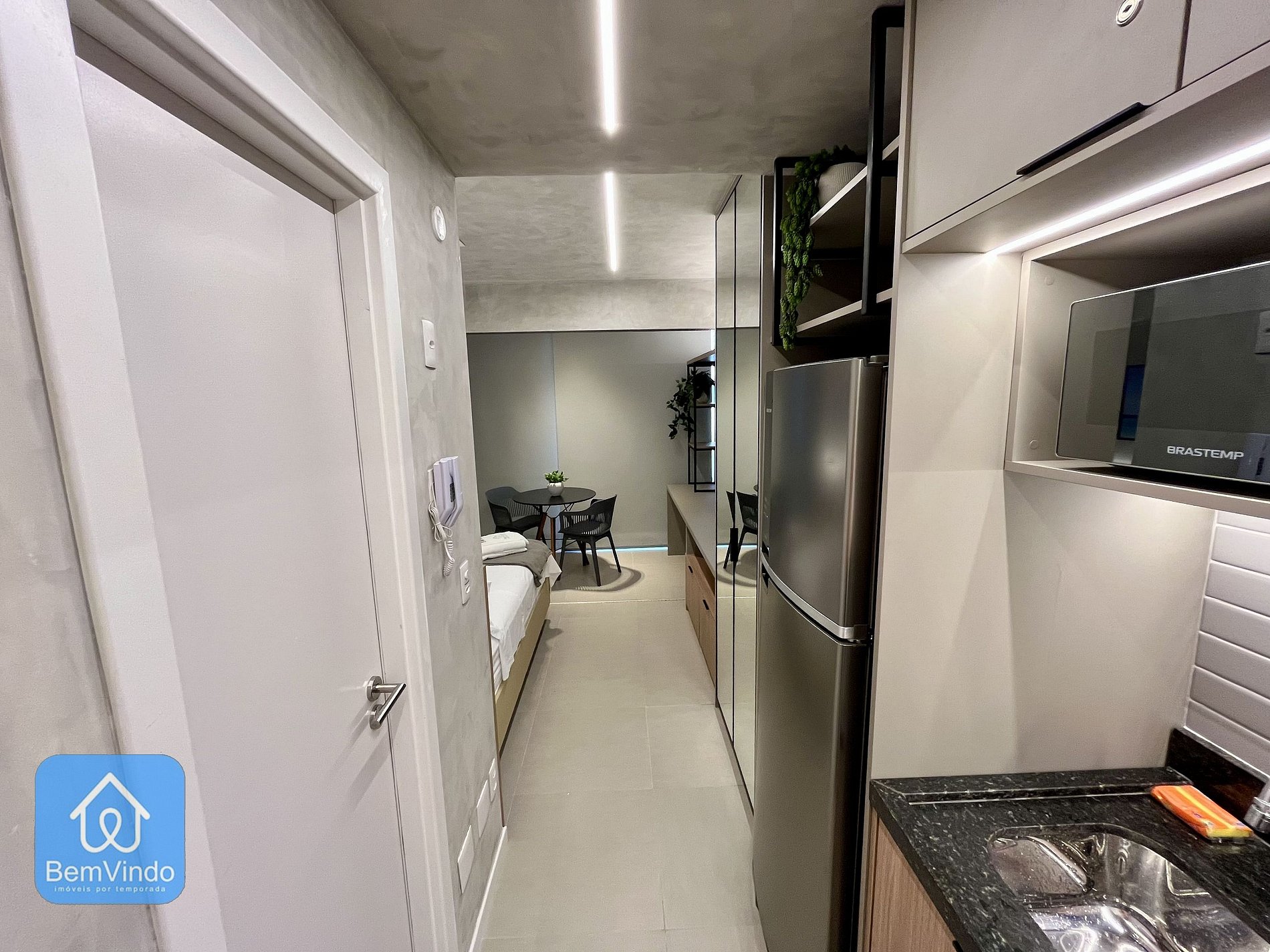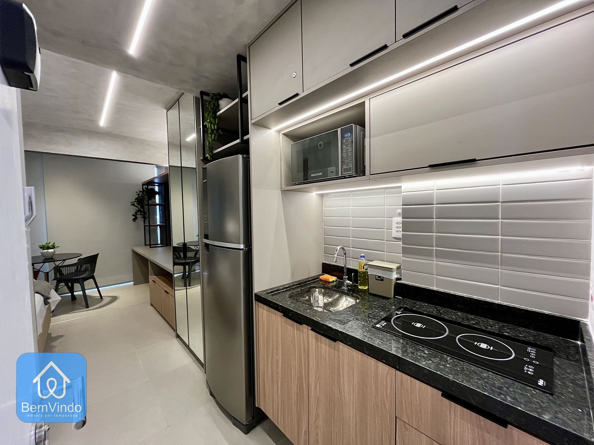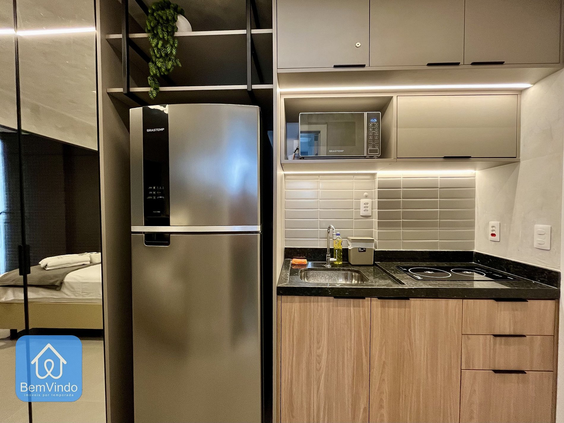 Para seus momentos de lazer, o ambiente dispõe de uma TV moderna. A cozinha, compacta e eficiente, vem equipada com um cooktop elétrico, micro-ondas, geladeira e todos os utensílios necessários para preparar refeições deliciosas durante sua estadia.