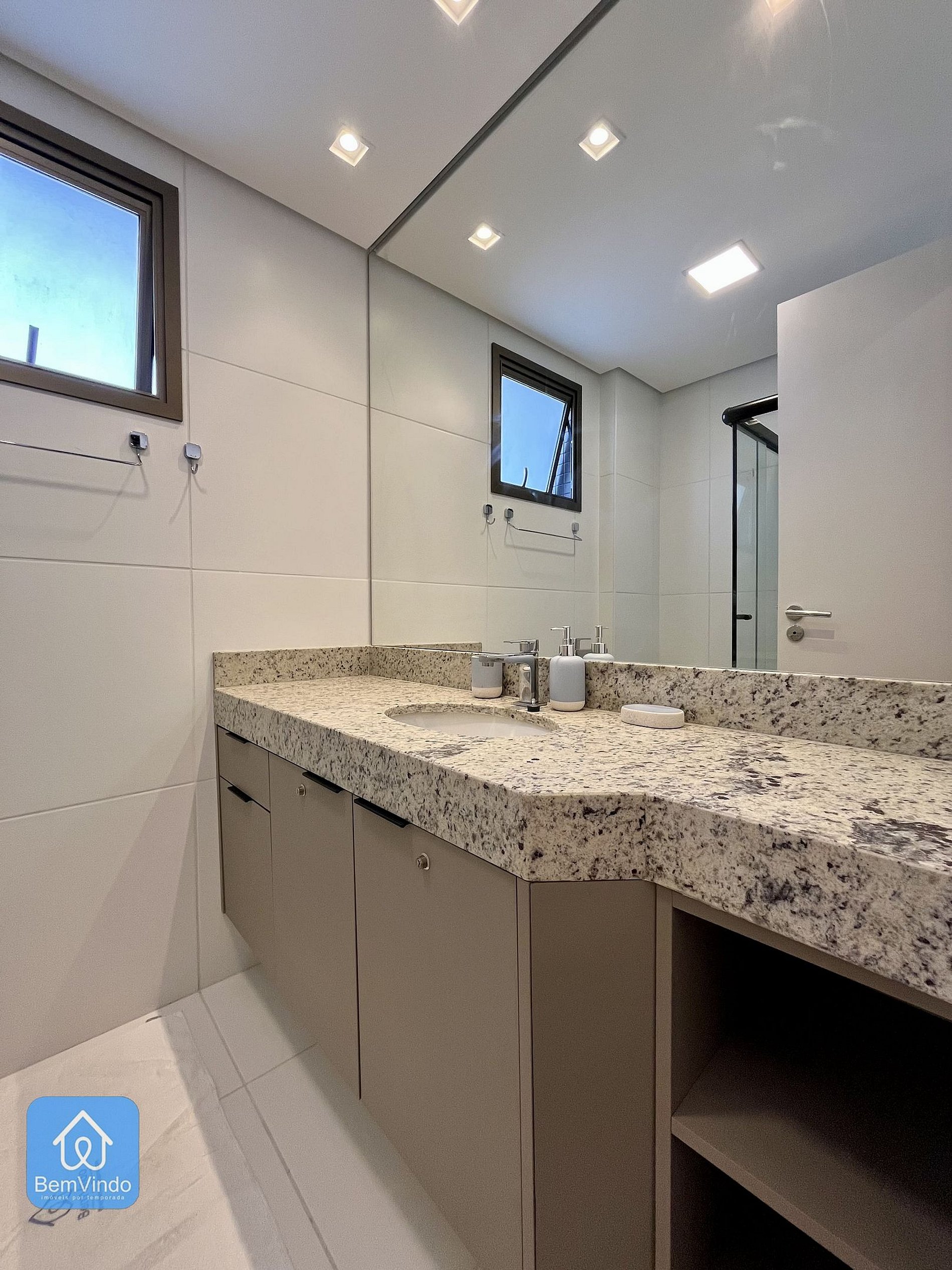 O banheiro do estúdio é outro destaque, oferecendo um espaço confortável com um chuveiro e um espelho amplo, garantindo praticidade e um toque de sofisticação.