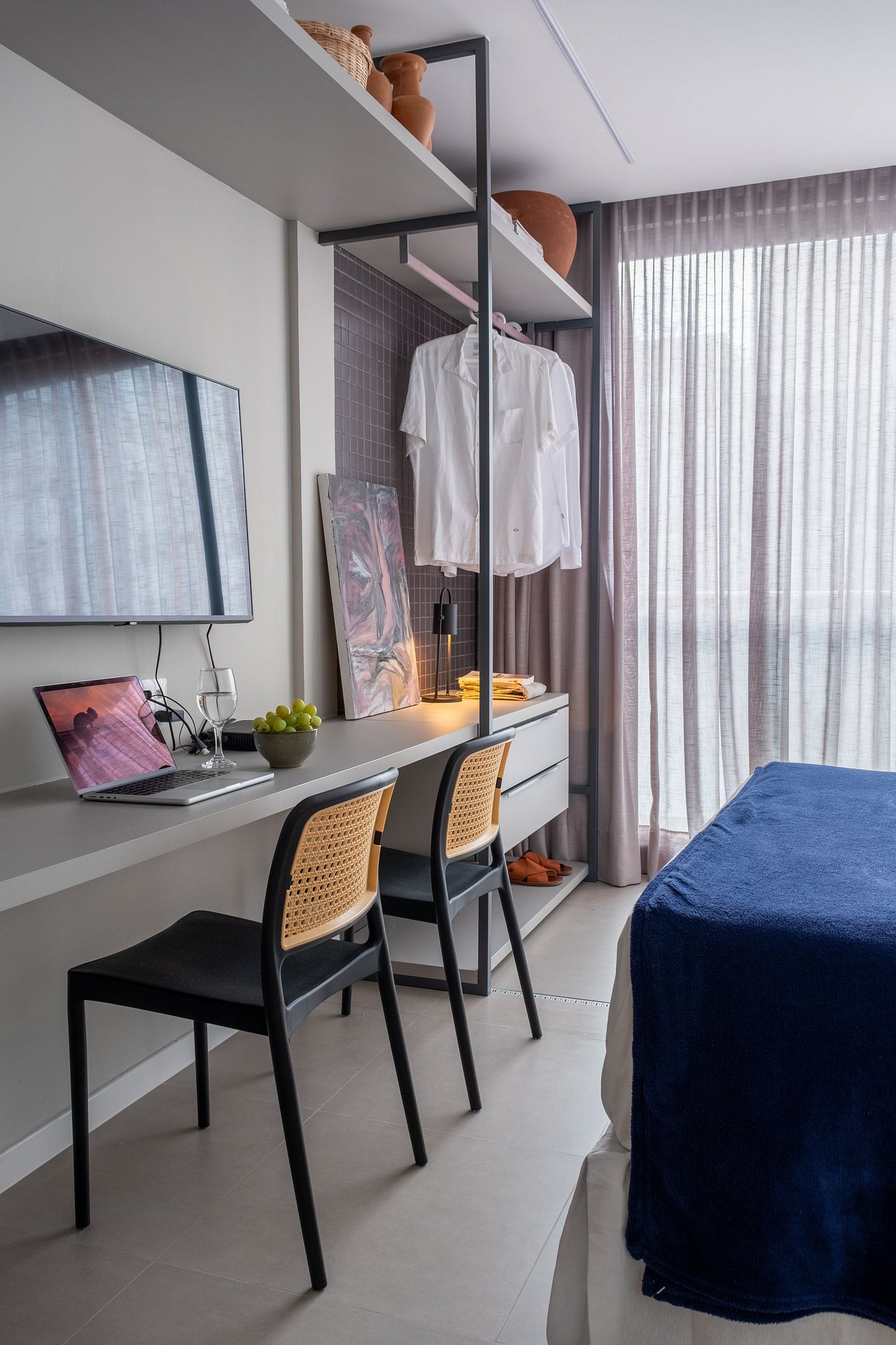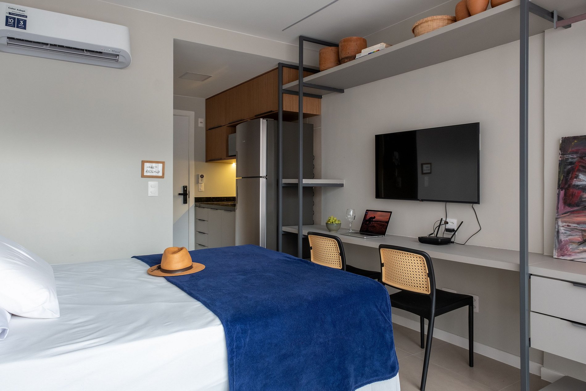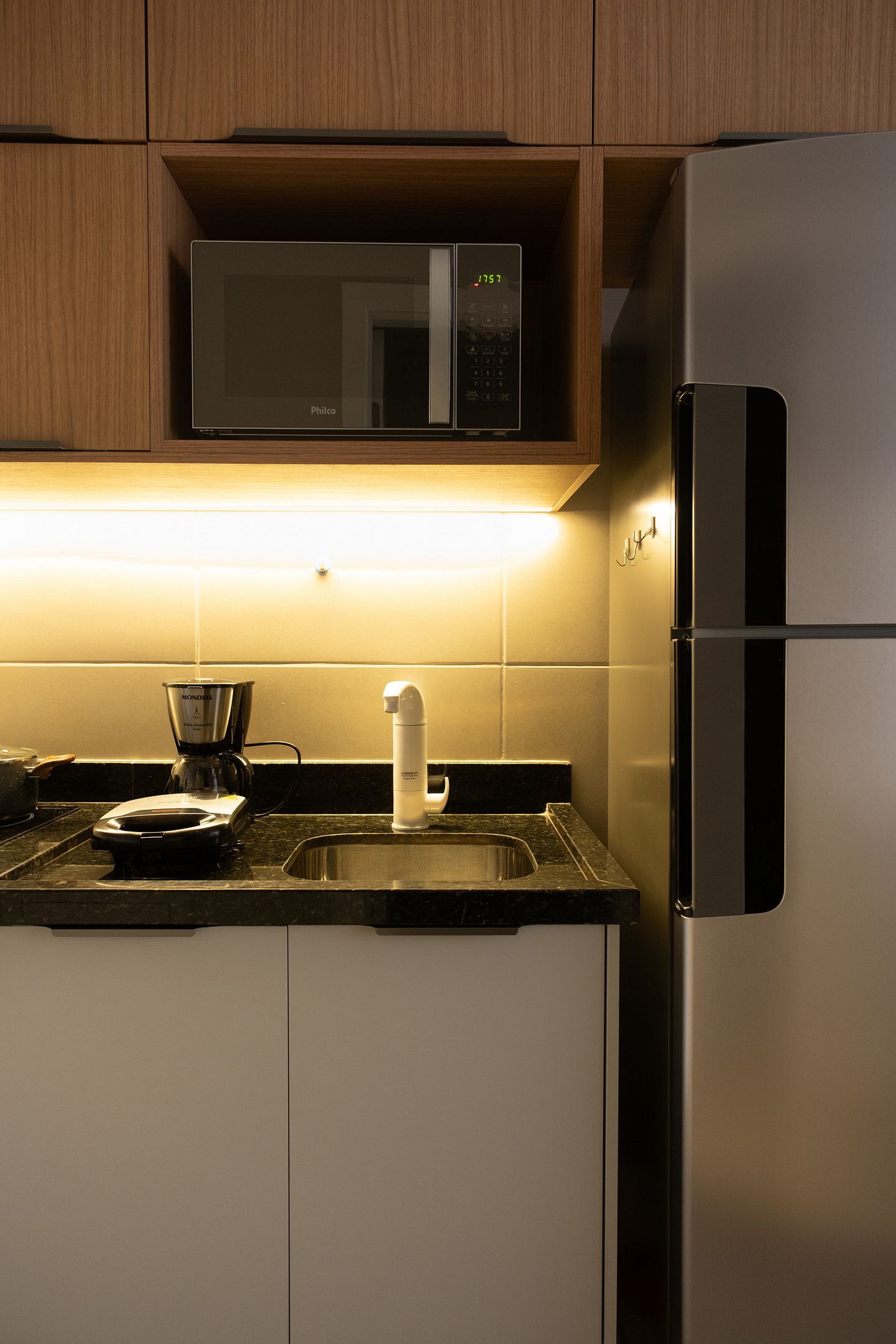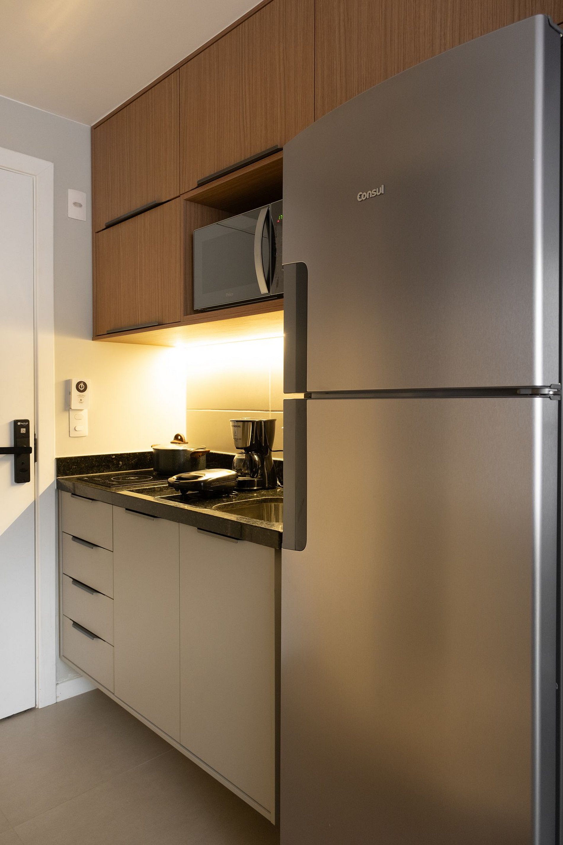 A cozinha, compacta e eficiente, vem equipada com um cooktop elétrico, micro-ondas, geladeira e todos os utensílios necessários para preparar refeições deliciosas durante sua estadia. O banheiro do estúdio é outro destaque, oferecendo um espaço confortável com um chuveiro grande e um espelho amplo, garantindo praticidade e um toque de sofisticação.