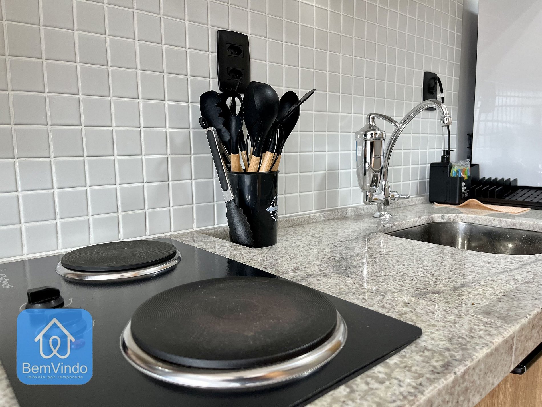 - Cozinha completa com fogão cooktop, micro-ondas, geladeira e todos os utensílios necessários para refeições