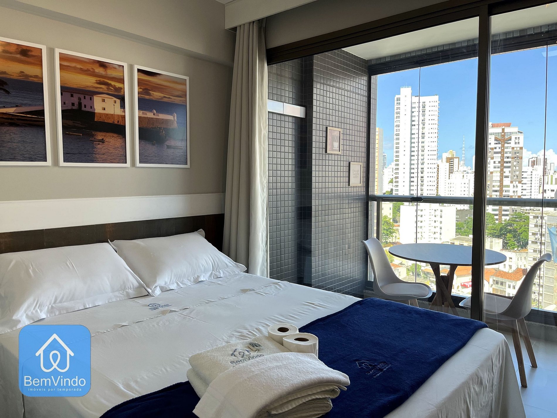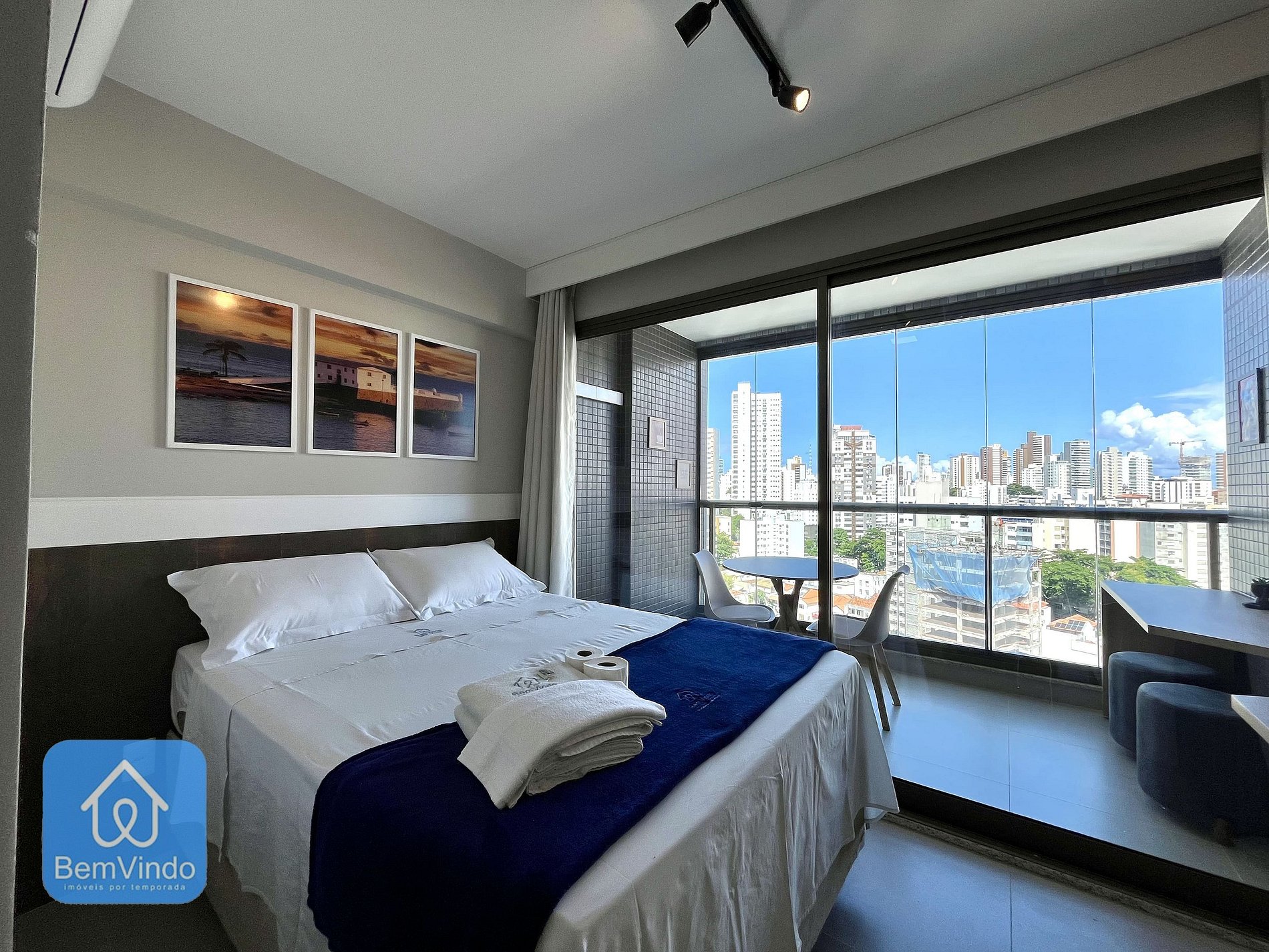 Além disso, o estúdio possui uma varanda ampla e arejada ideal para relaxar ao ar livre e aproveitar a brisa de Salvador com mesas e cadeiras.