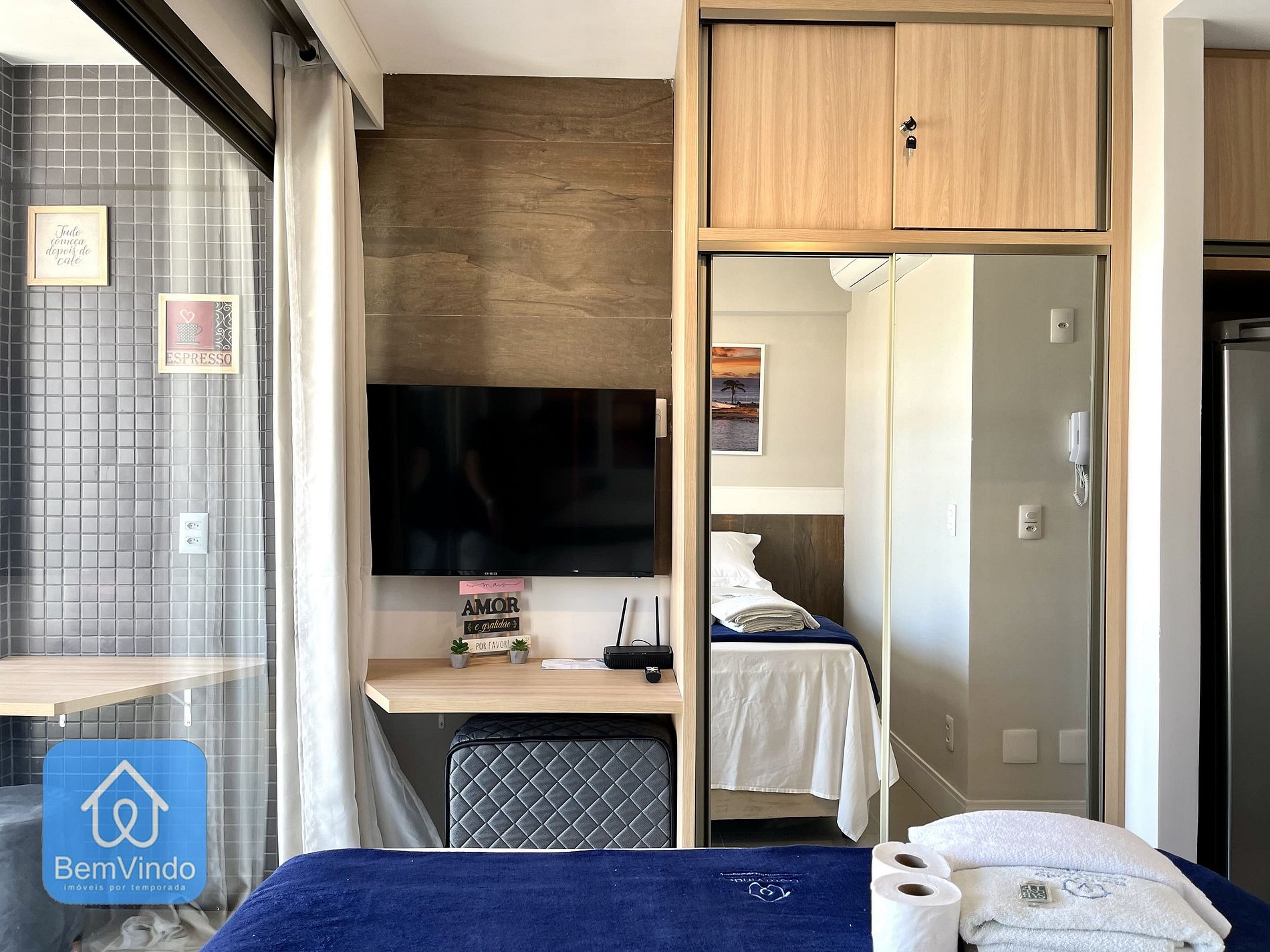 Nosso estúdio, totalmente equipado, proporciona um ambiente acolhedor e funcional. O espaço conta com uma cama de casal nova e um colchão de solteiro e extremamente confortável, perfeita para uma boa noite de sono após um dia de exploração pela cidade. Para seus momentos de lazer, o ambiente dispõe de uma TV moderna.