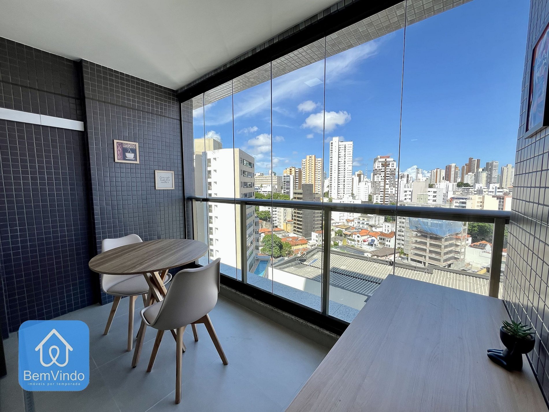 Além disso, o estúdio possui uma varanda ampla e arejada ideal para relaxar ao ar livre e aproveitar a brisa de Salvador com mesas e cadeiras.