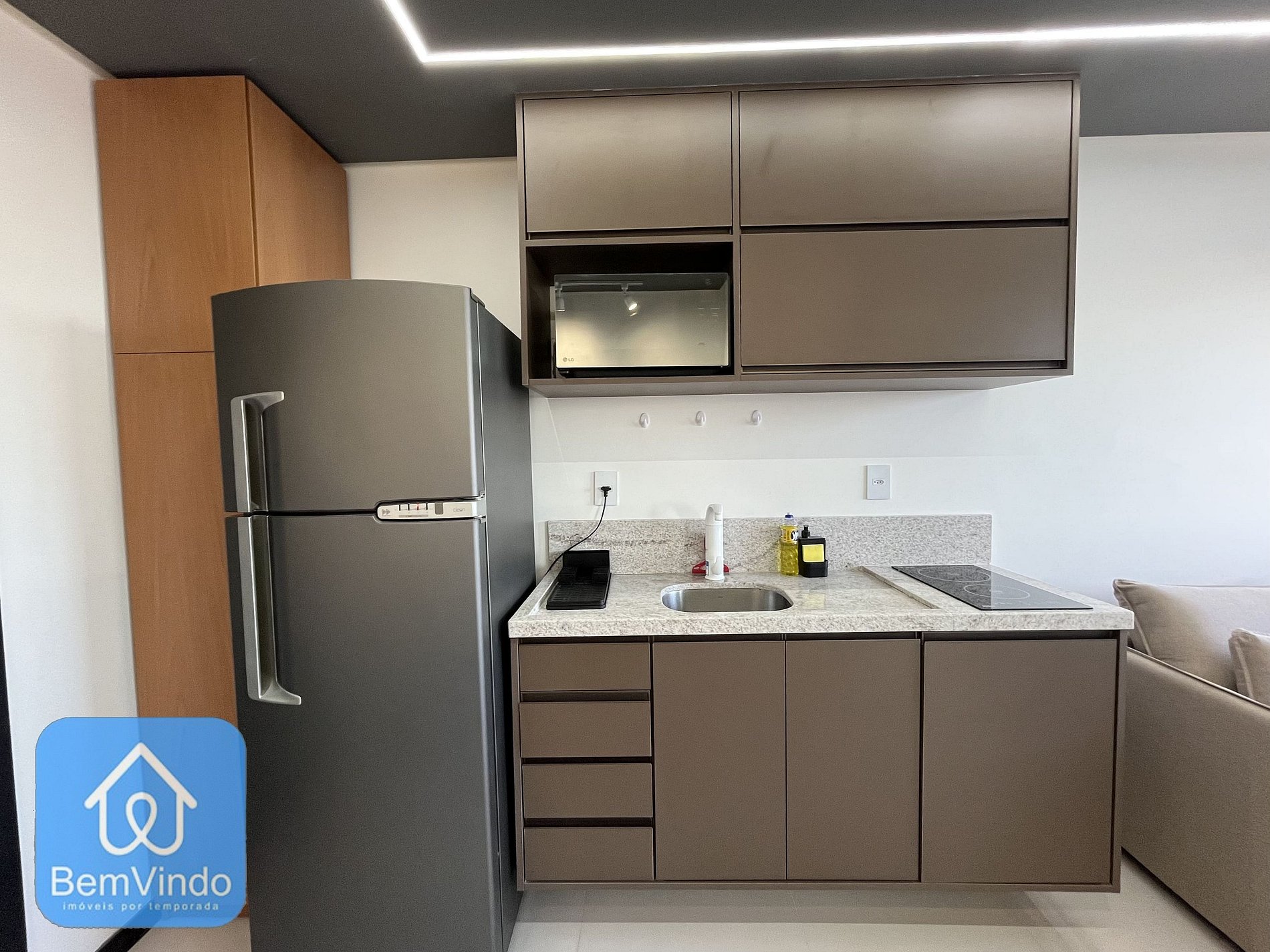 A cozinha totalmente equipada oferece tudo o que você precisa para preparar refeições deliciosas, incluindo geladeira, micro-ondas, fogão e armários bem organizados.